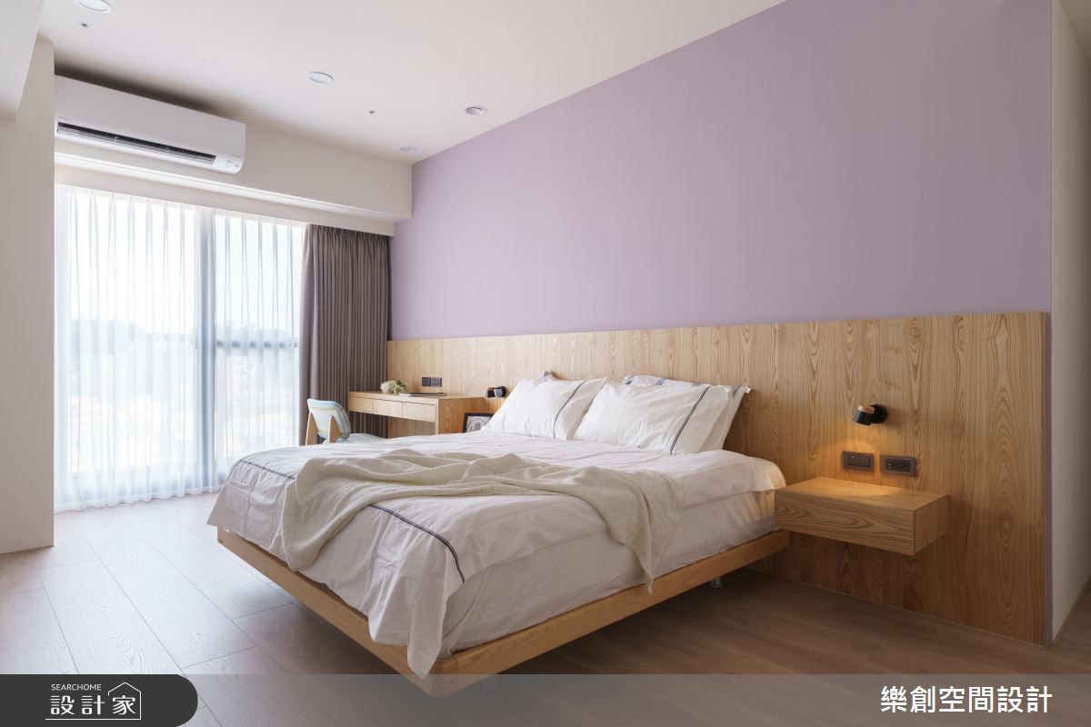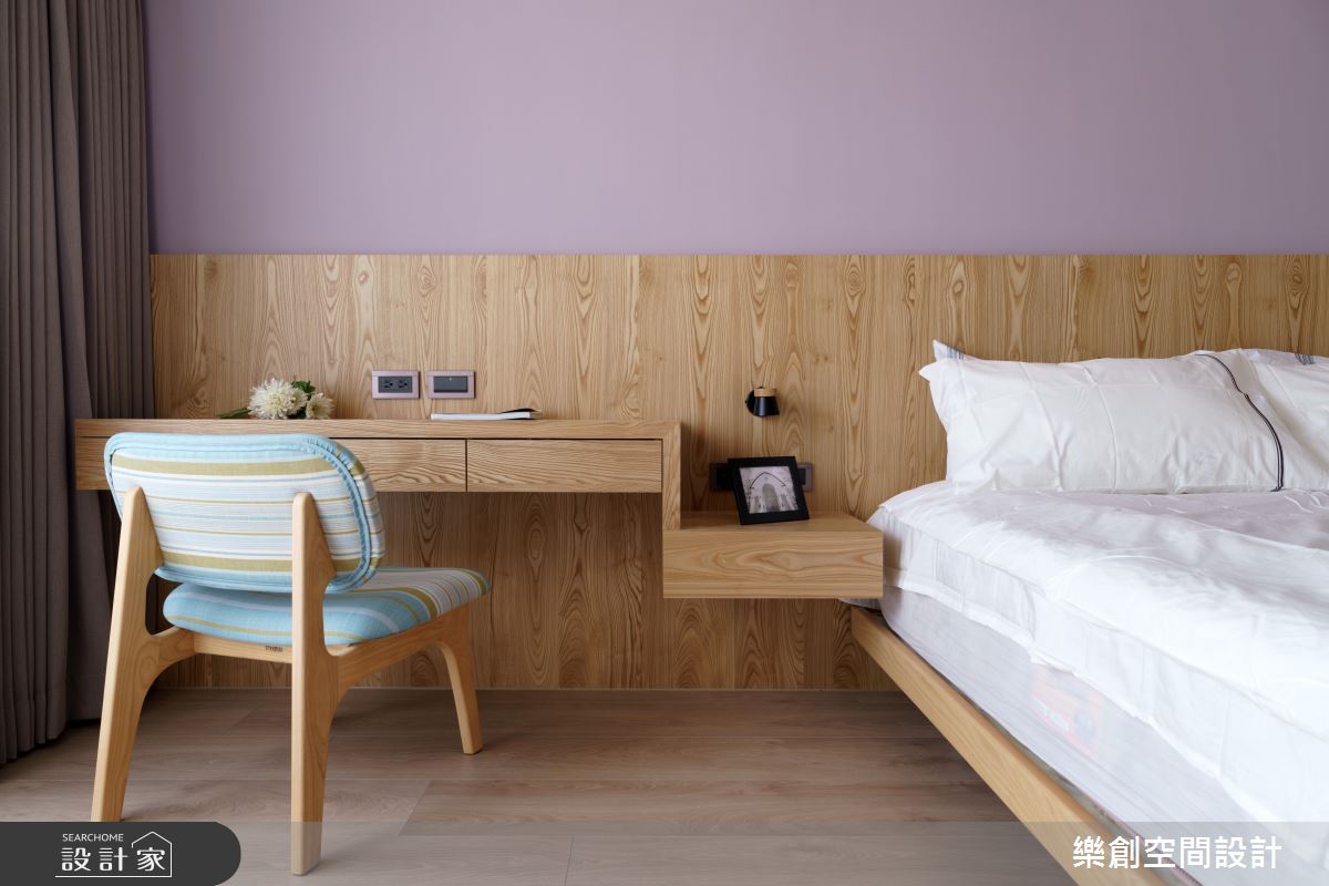 主臥延續公領域的清新氛圍,使用溫柔色調揮灑牆面,營造閒適的舒眠氣氛,床頭處亦延伸出置物櫃與書桌平檯,為居住者挹注實用機能!