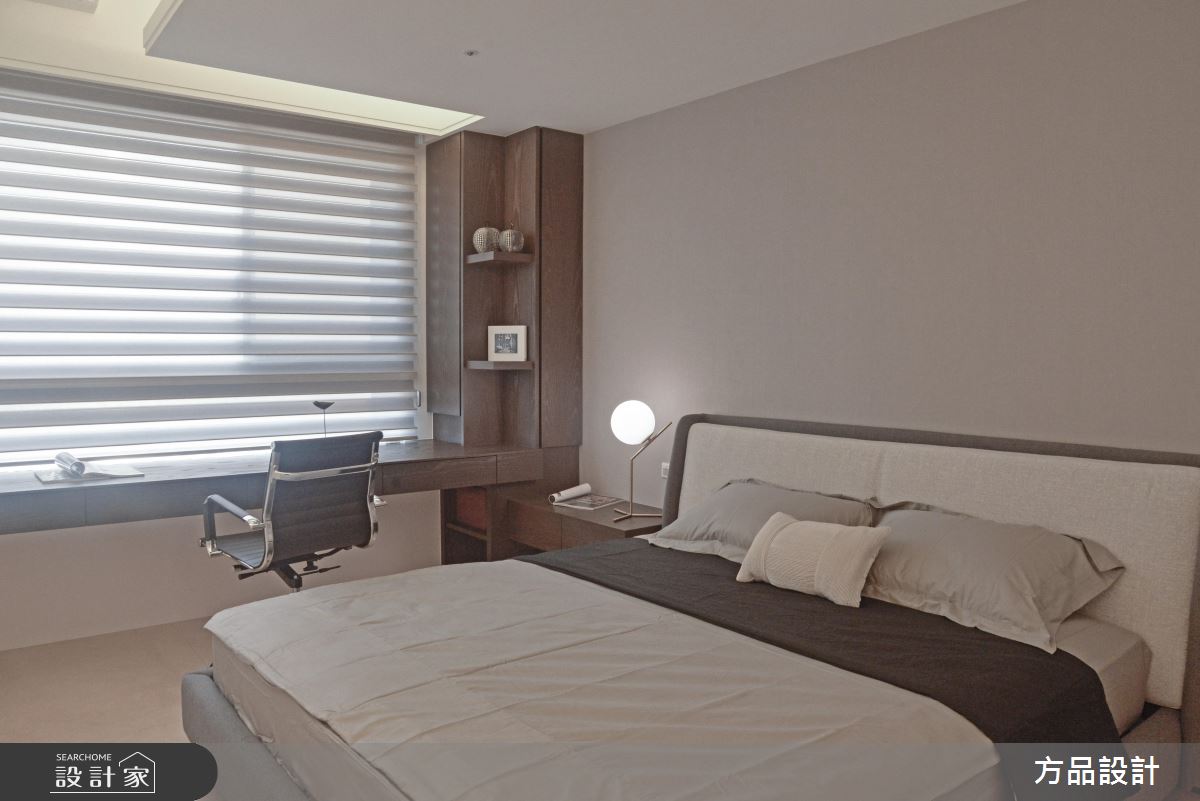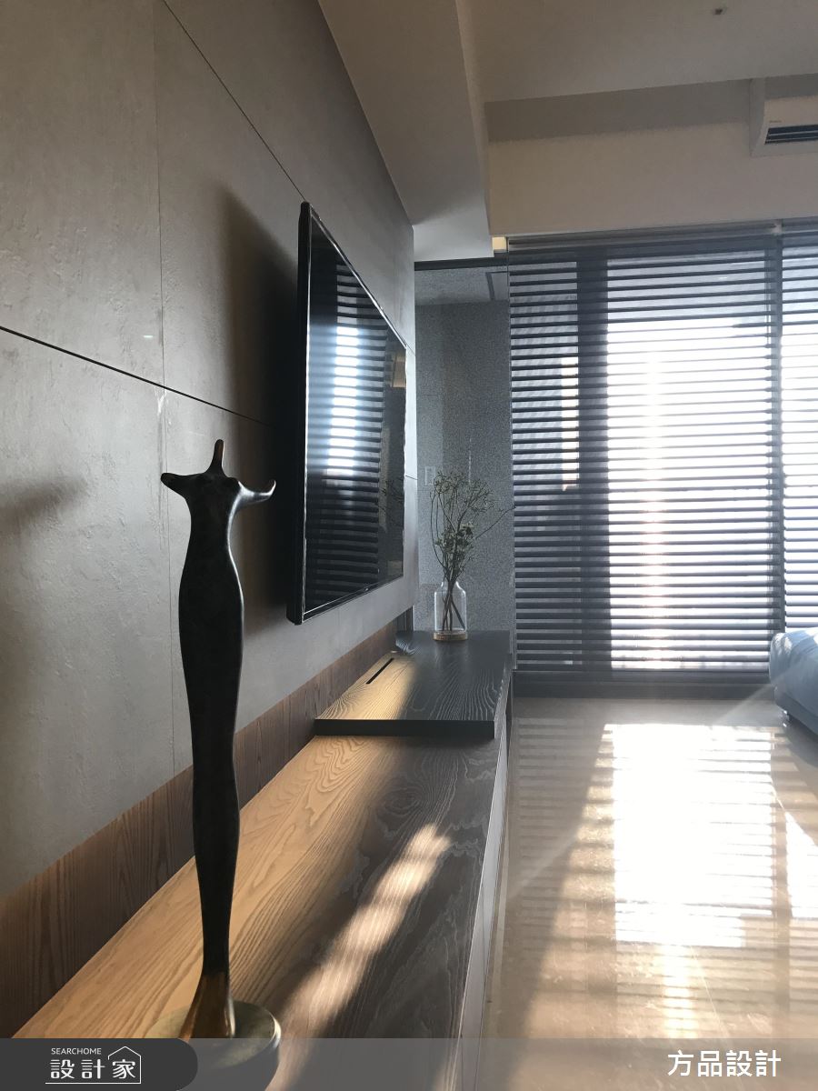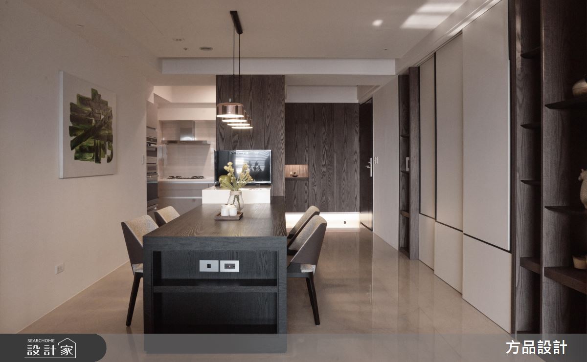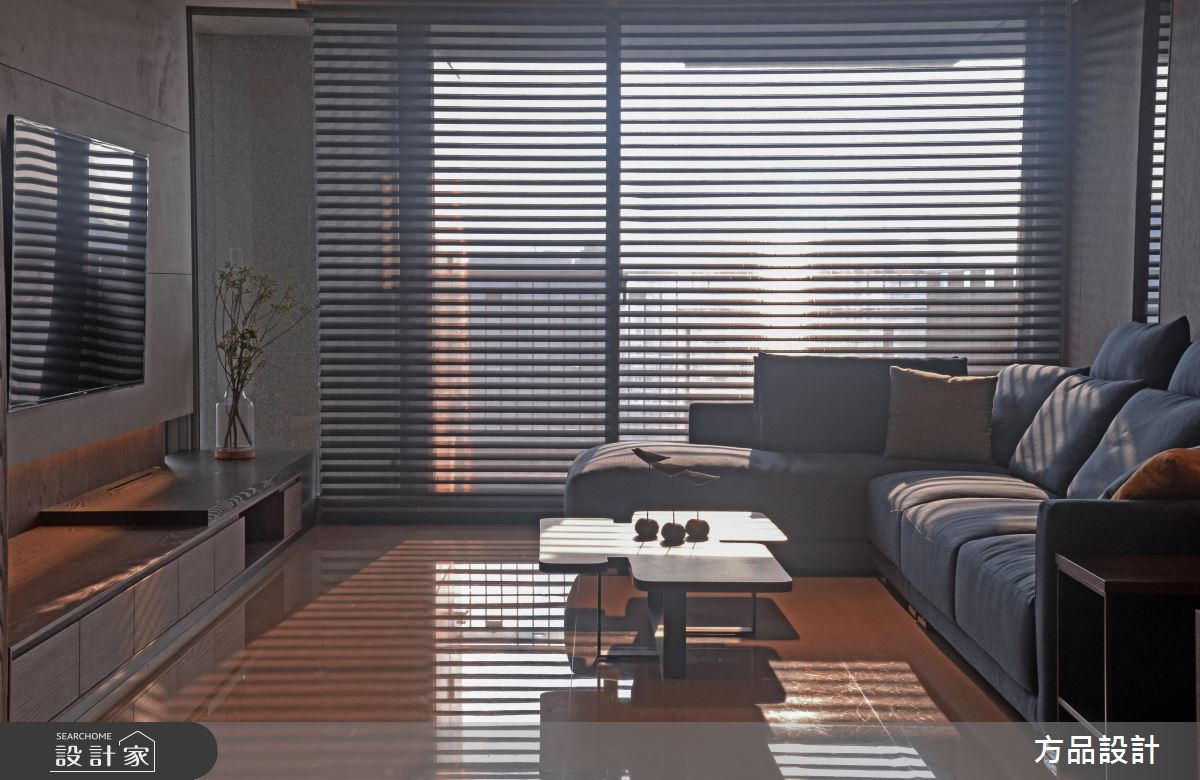 客廳區,引用百葉窗簾篩落光影,將光線化為居家的裝飾圖騰,揉入靜謐的生活氛圍,同時運用線條的延伸、搭配窗景的導引,讓室內空間感獲得更多釋放,同時將生活機能美型化,依照牆面尺度延伸展示或收納功能,以無所不在的牆櫃設計、轉化出俐落亮眼的立面造型;開放式的餐廚空間,則整合吧檯量體與牆面,將長型中島銜接電視牆,增加了料理用餐時的彈性,提供全家人聚餐看電視的團圓時刻;起居臥榻平檯,則結合窗邊採光,給予大量溫潤木皮的修飾,並於立面加入展示櫃設計,圍塑出舒適而實用的休憩角落;寢臥內,承襲著現代簡約的風格,刻意將床頭櫃結合長書桌,使塊體呈現變得俐落有致,讓使用情境更為流暢!