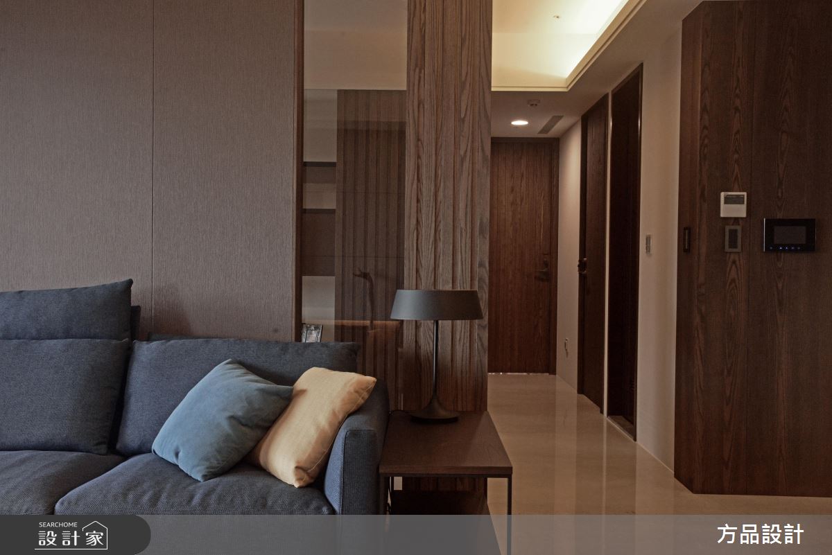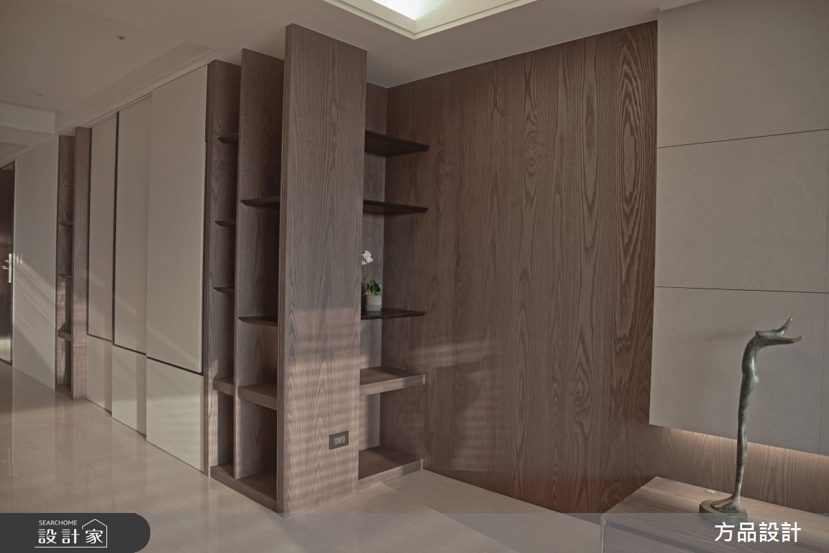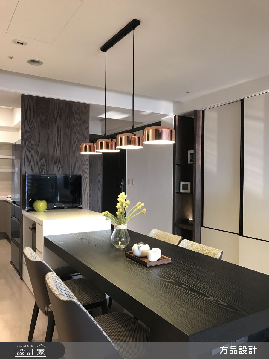 客廳區,引用百葉窗簾篩落光影,將光線化為居家的裝飾圖騰,揉入靜謐的生活氛圍,同時運用線條的延伸、搭配窗景的導引,讓室內空間感獲得更多釋放,同時將生活機能美型化,依照牆面尺度延伸展示或收納功能,以無所不在的牆櫃設計、轉化出俐落亮眼的立面造型;開放式的餐廚空間,則整合吧檯量體與牆面,將長型中島銜接電視牆,增加了料理用餐時的彈性,提供全家人聚餐看電視的團圓時刻;起居臥榻平檯,則結合窗邊採光,給予大量溫潤木皮的修飾,並於立面加入展示櫃設計,圍塑出舒適而實用的休憩角落;寢臥內,承襲著現代簡約的風格,刻意將床頭櫃結合長書桌,使塊體呈現變得俐落有致,讓使用情境更為流暢!