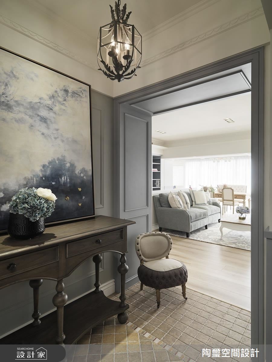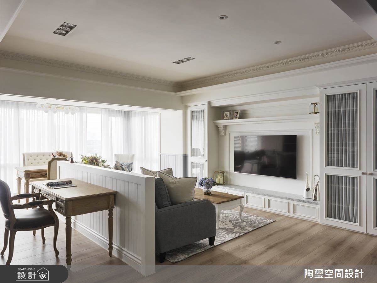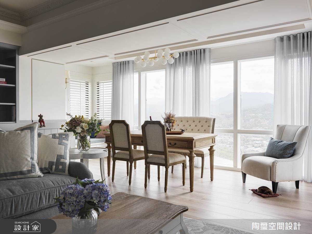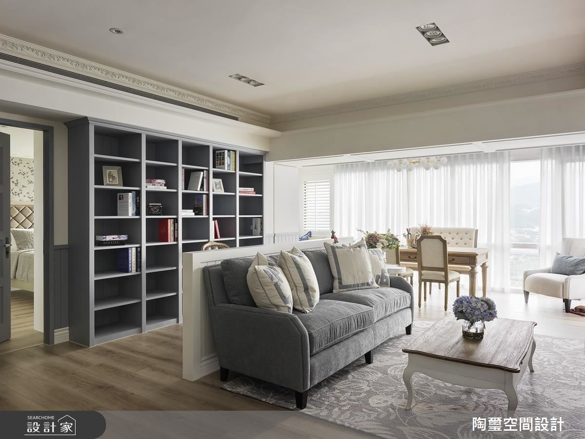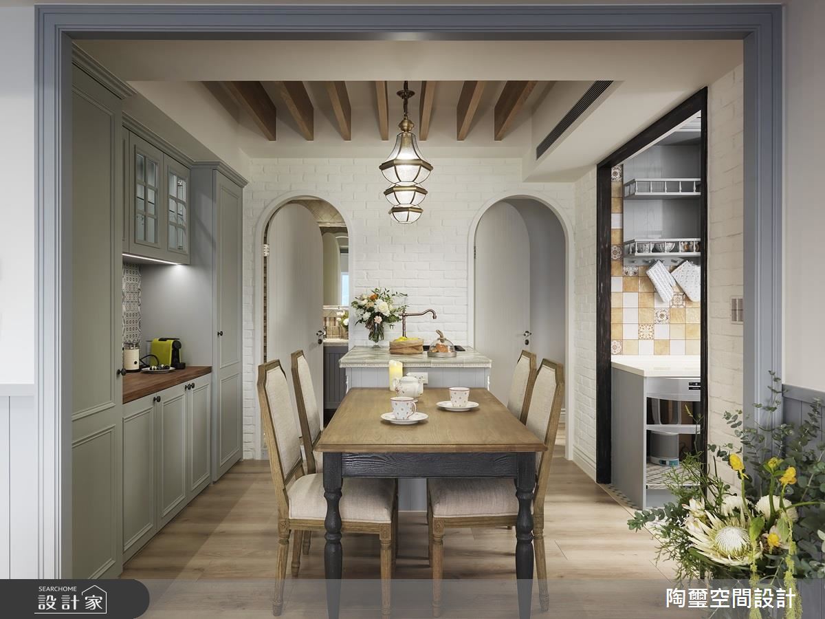 空間整體呈現開放式格局,不刻意定義區域的主題,讓每個場域都能享受到使用上的彈性,並保有寵物的自由活動,同時以一整面書牆作為居家端景,藉由優雅的灰藍色櫃體呼應沙發色調,讓書櫃兼具展示意義,成為室內的一道美麗風景;且特別依循日光規劃路徑,在窗邊日光極佳處擺放桌椅,旁側牆角則安置一小區臥榻,在陽光相佐之下,運用木作條鋪述天花,開啟多功能的休憩閱讀段落;餐廳區,則作為三道動線的過渡核心,導引通透無礙的生活動線,在木質家具、文化石、花磚與鄉村圓弧拱門之中,構築溫馨的用餐場景;主臥呈現優雅恬適的調性,於牆面選用碎花壁紙加以鋪敘,搭配柔軟而細緻的床頭板造型,勾勒出雅致的生活品味!