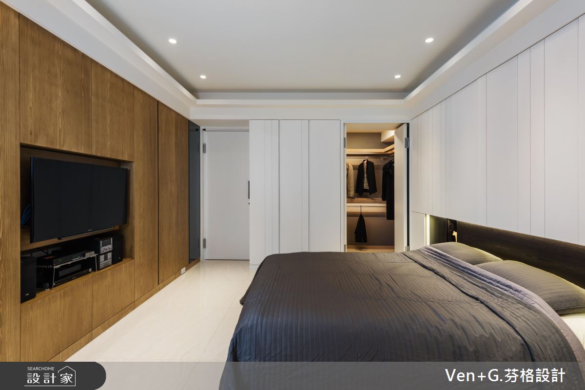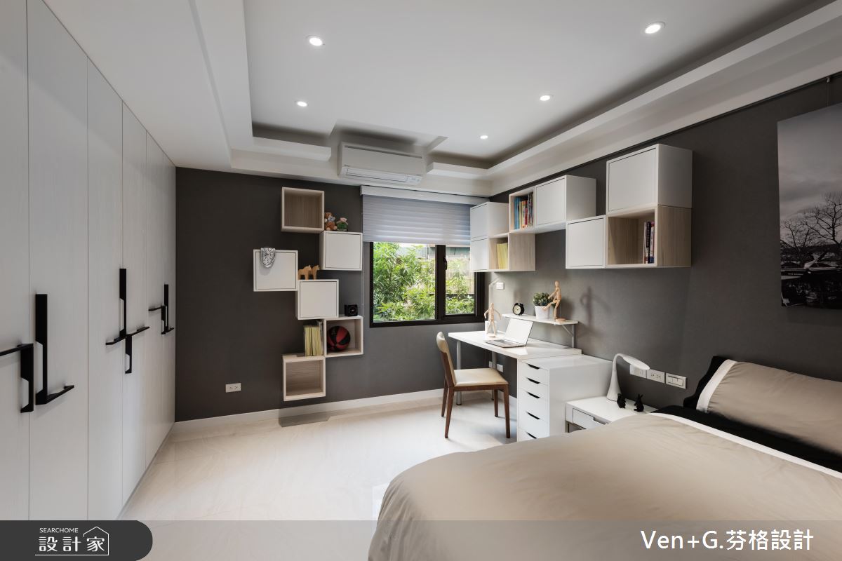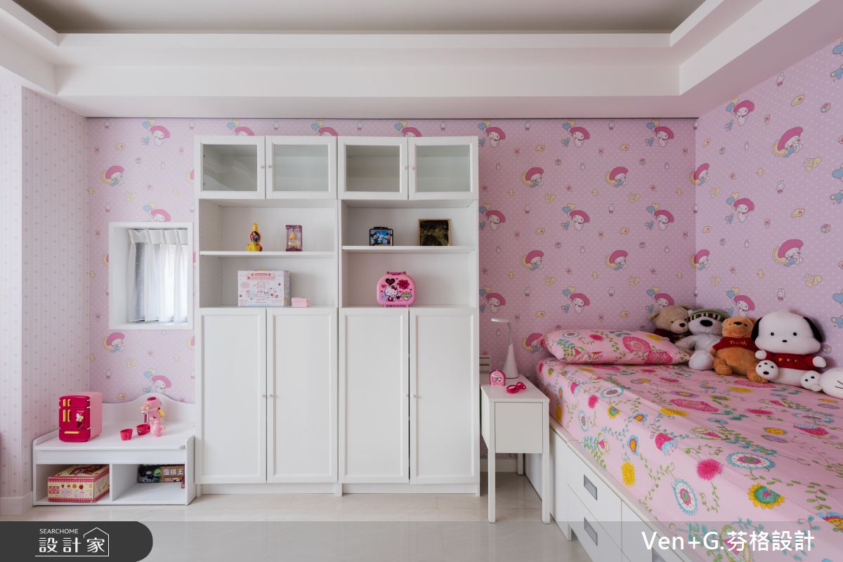 私領域依照居住成員的喜好,分別注入不同的色調與機能,純白色調的主臥大方且優雅,男孩房的牆面利用櫃體組合營造了活潑端景;女孩房則以繽紛明亮的壁紙與軟件打造了夢幻樂園。
