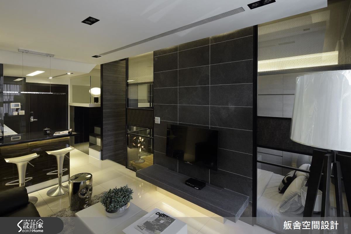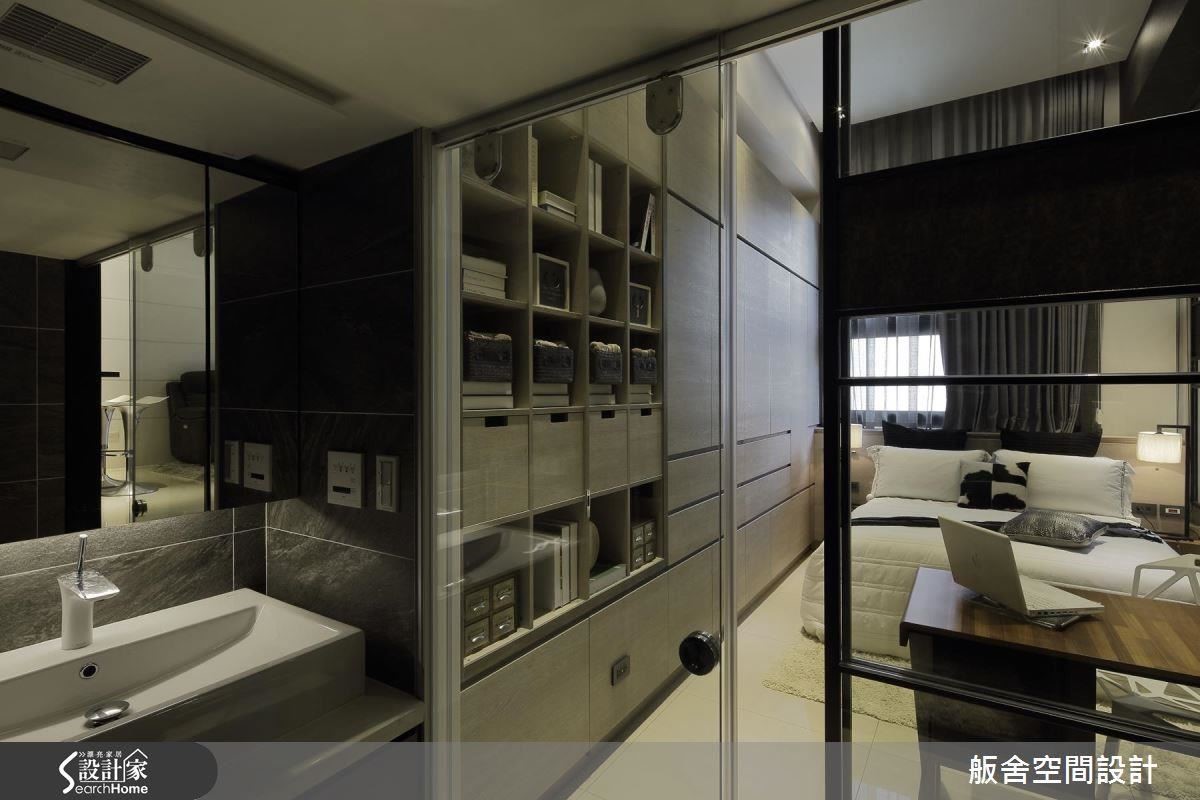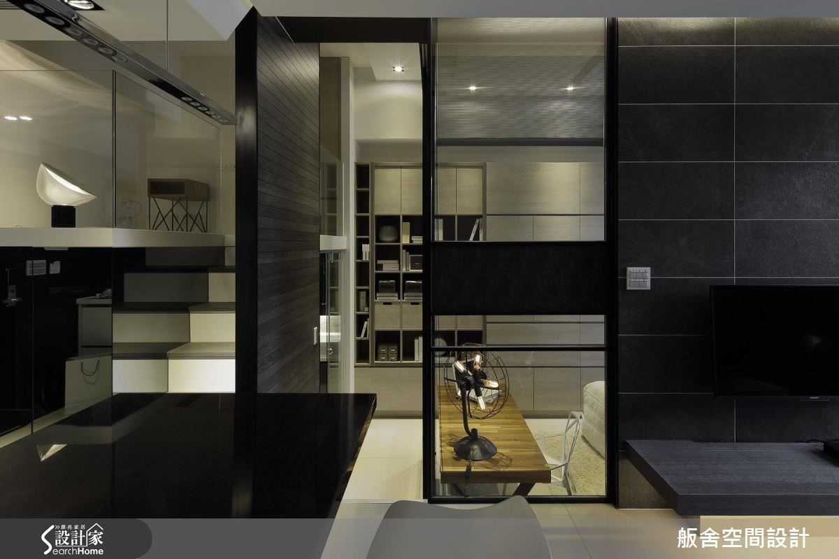 打造男性空間,沈穩的色調往往是不錯的選擇,而材質的選擇就至關重要,也牽涉著整體質感的呈現,為了考量家中有其他成員,如何在深色調的空間中增添。由於受限於空間限制,深色板岩磚作為客廳與主臥的界線,設計師則採取白色收邊讓立面能更顯輕盈。而兩側選取玻璃搭配百葉,讓光線透入室內,無形中放大了視覺。
