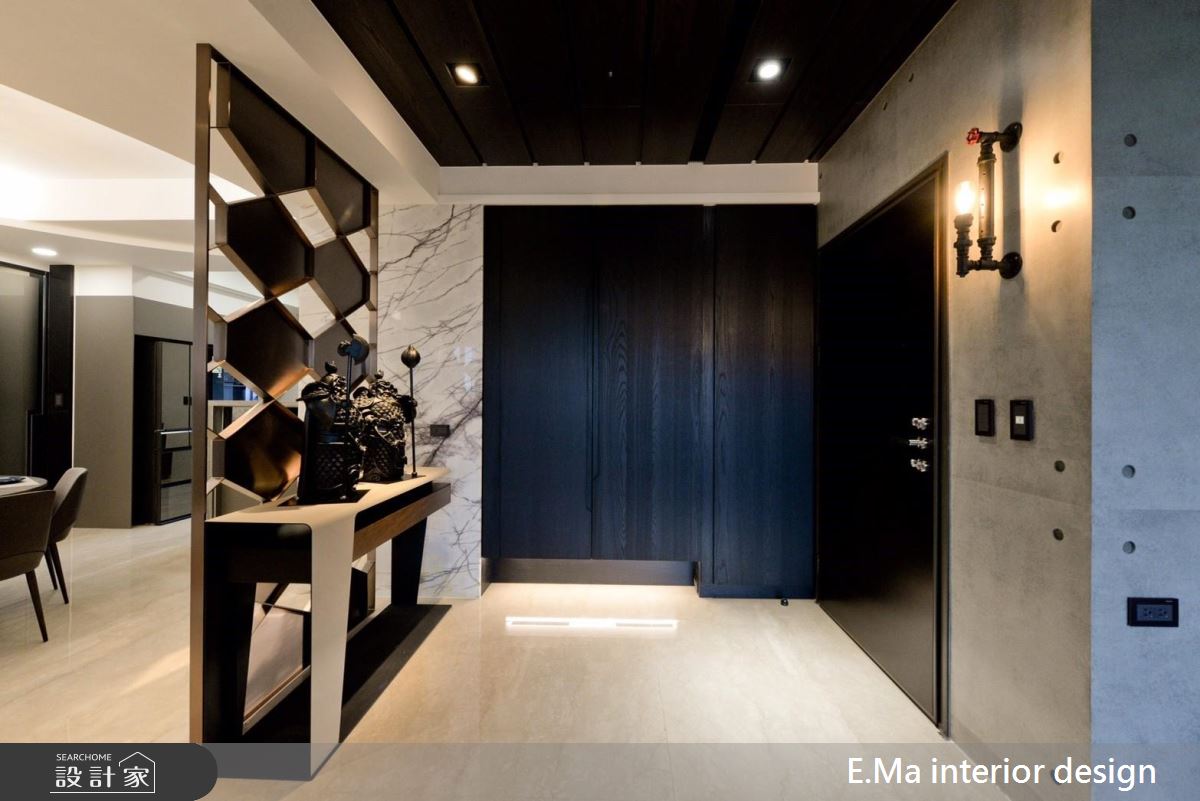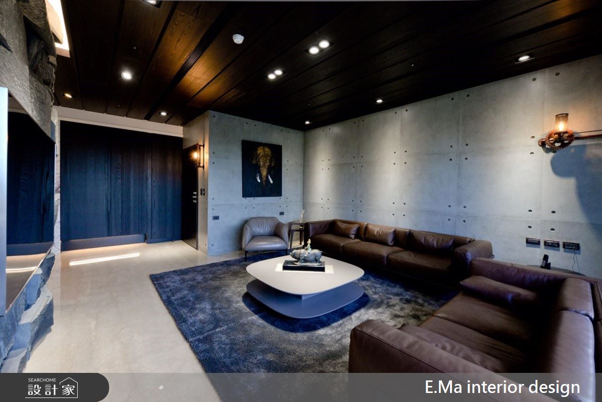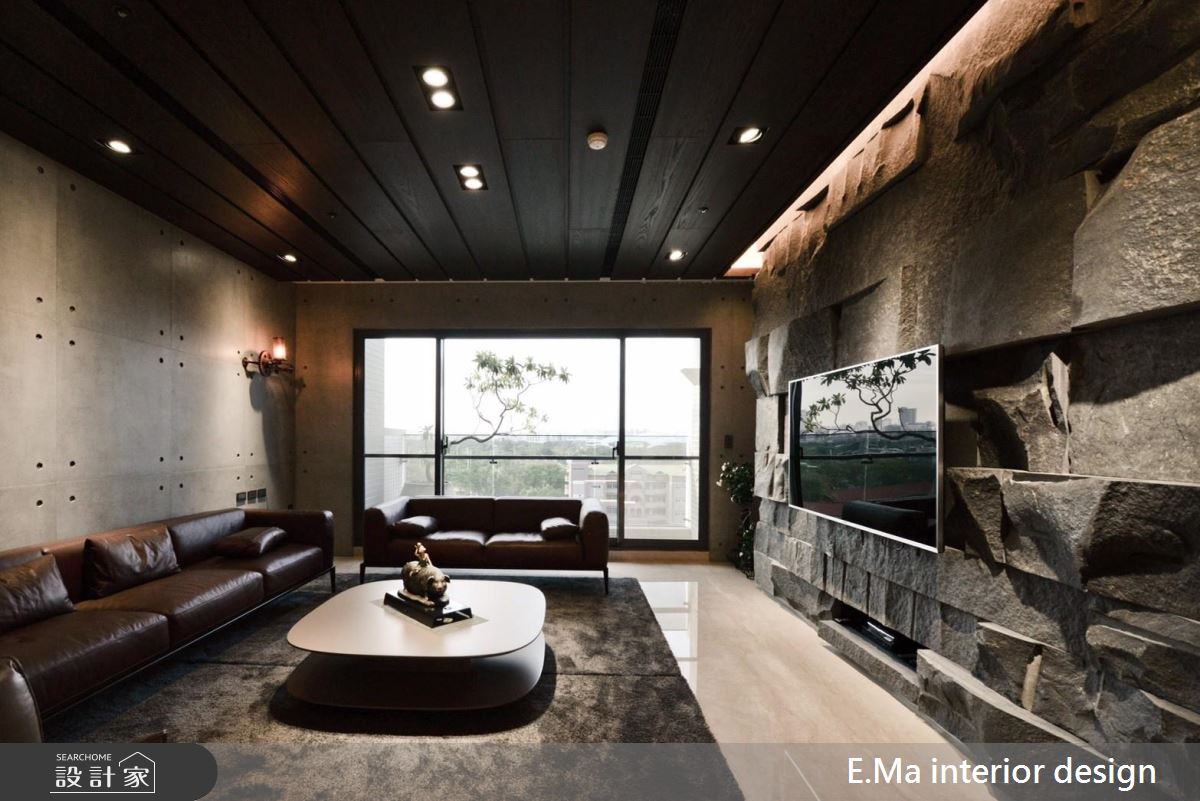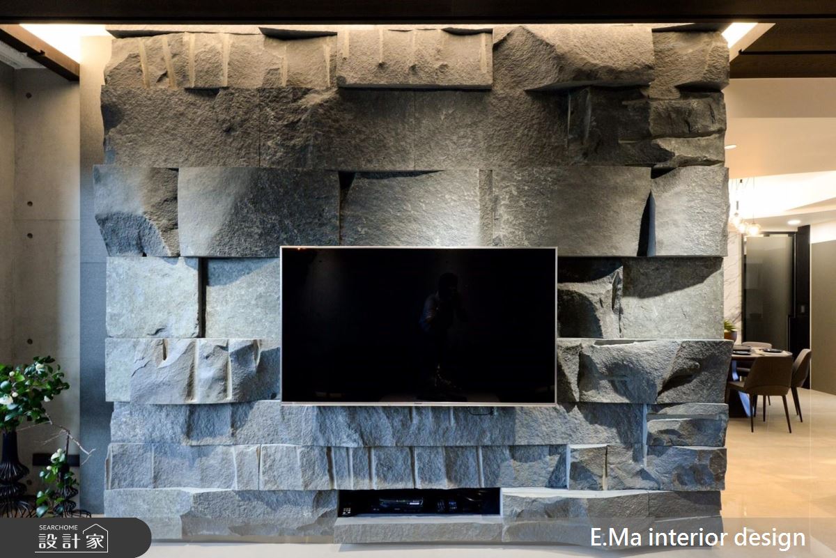 由於業主本身就是室內設計師,對於自身與家人的需求相當清楚,屋案本身擁有相當優良的格局配置、通風與採光。入門處利用鏤空屏隔劃分玄關空間,化解開門見餐廚的風水疑慮。設計師想要讓居家空間滿溢自然氛圍,因此採用了大量的石材,並在前置作業即把結構與載重登納入考量,利用鐵件固定大樑位置加強結構,最後採用乾式施工方式加強安全性、成功解決石皮過重問題。設計師希望回到家後能擁有全然紓壓的空間,除了石皮電視牆以外,更採清水模塗料,放鬆又耐髒,巧妙利用大面積開窗引景入室,搭配天花鋼刷木皮板,打造能撫平雜亂思緒的沉澱所在。
