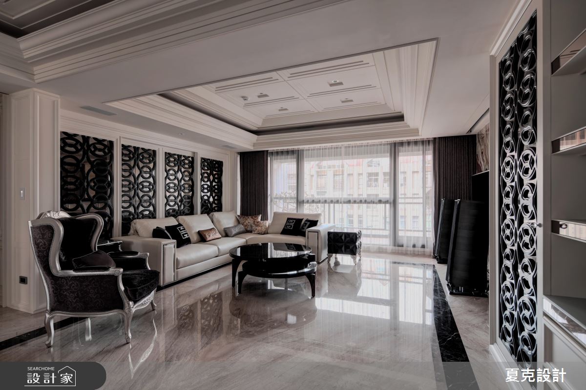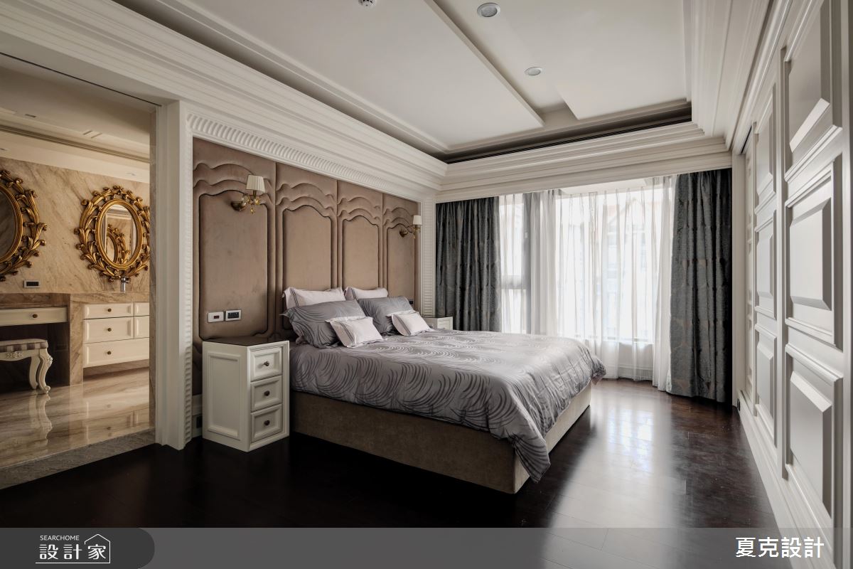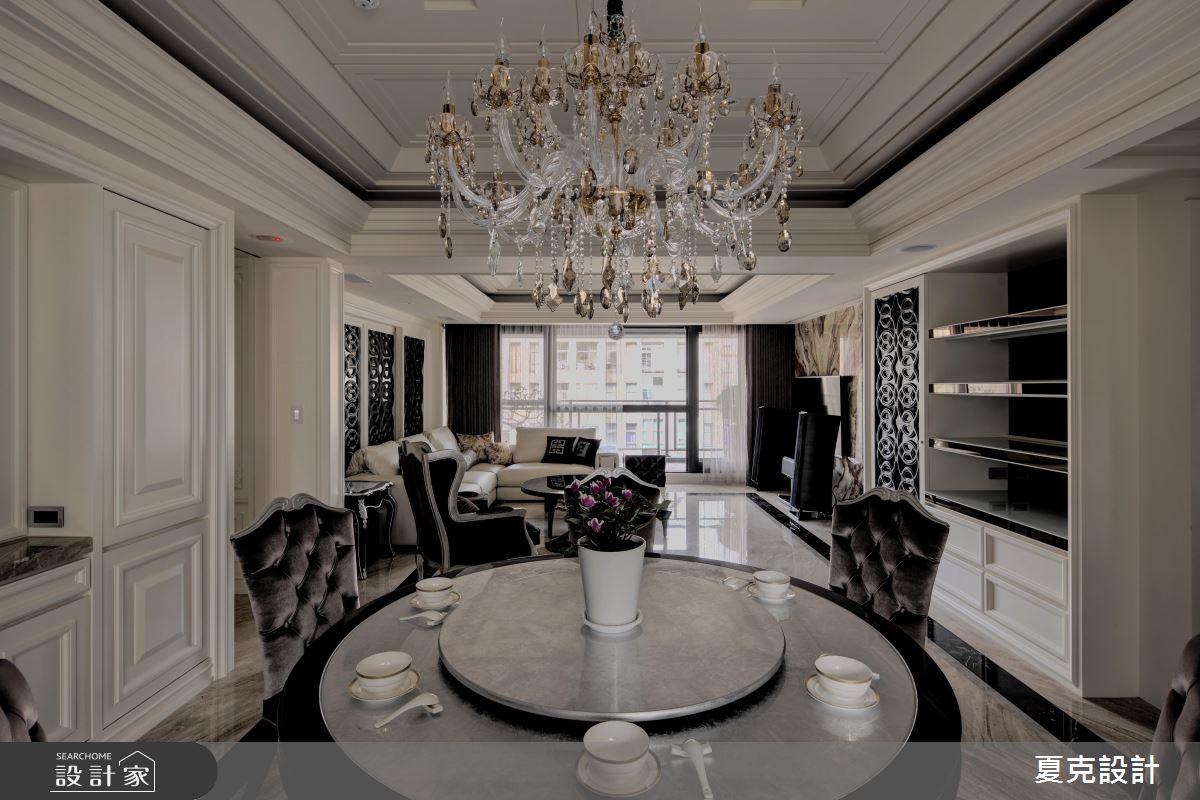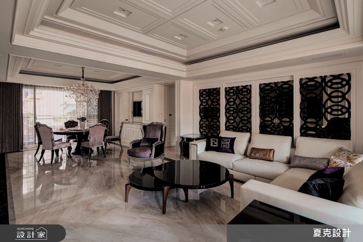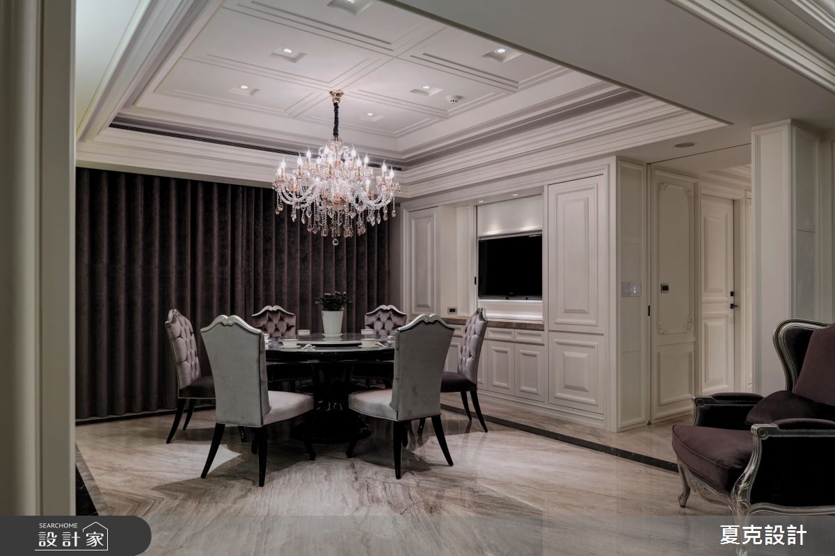 步入公領域,可見全室地坪鋪敘帝諾大理石,彰顯磅礡而典雅的場景,客廳牆則選用透光青玉石鋪陳,透過燈光與採光的烘托,渲染出自然生動的石材質紋,型塑大器的立面表情,同時在客廳配置數位情境整合控制系統,以科技體貼人性需求,滿足家庭劇院的使用情境,讓使用者可依照需要,調配視聽氛圍及燈光影音效果,天花則加入充滿立體層次感的線板造型,展現步步高升的挑高視野,沙發背牆上,特意使用手工雷射雕刻圖騰打造電動門片,不僅構築視覺焦點,亦形成廳區與書房之間的通透界定;餐廳區,則將電視屏幕整合於櫃體,運用彈性門片作出修飾,且納入優美窗景,型構雅致開闊的用餐景色;主臥內,採以美式新古典風定調,以立體流線裝飾床頭主牆,搭以細緻的大地色絨布,在精緻中不乏舒適高雅,帶出居住者的專屬魅力!