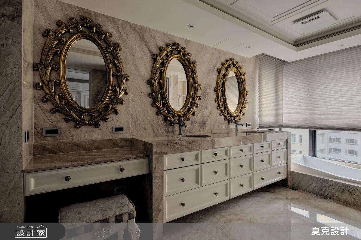 衛浴內以天然淺色石材作為背景,並懸掛三面大威尼斯鏡,佐以金屬色澤的框邊妝點,同步集結雙洗手檯與梳妝機能,打造出每個女人心目中的夢幻天堂!