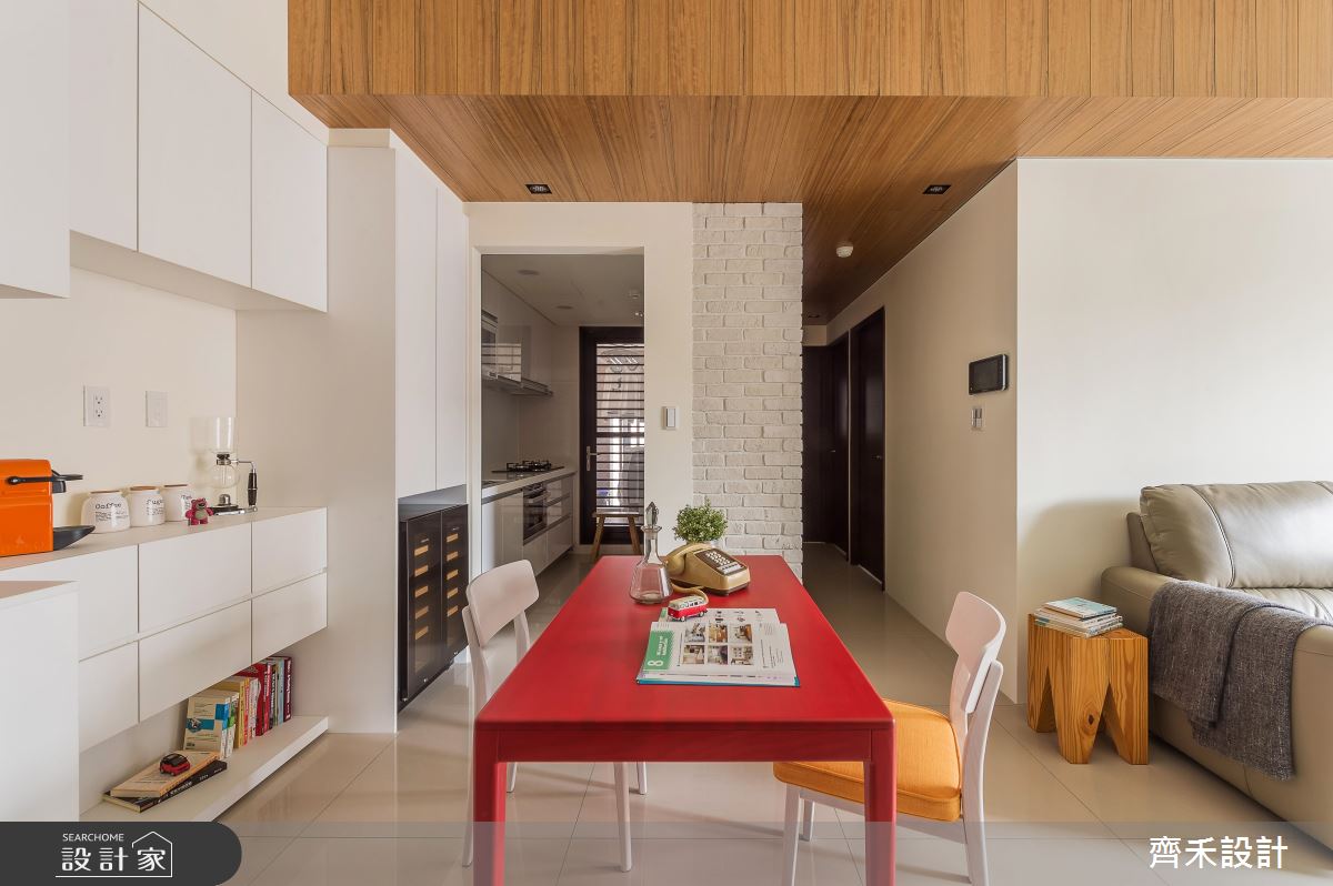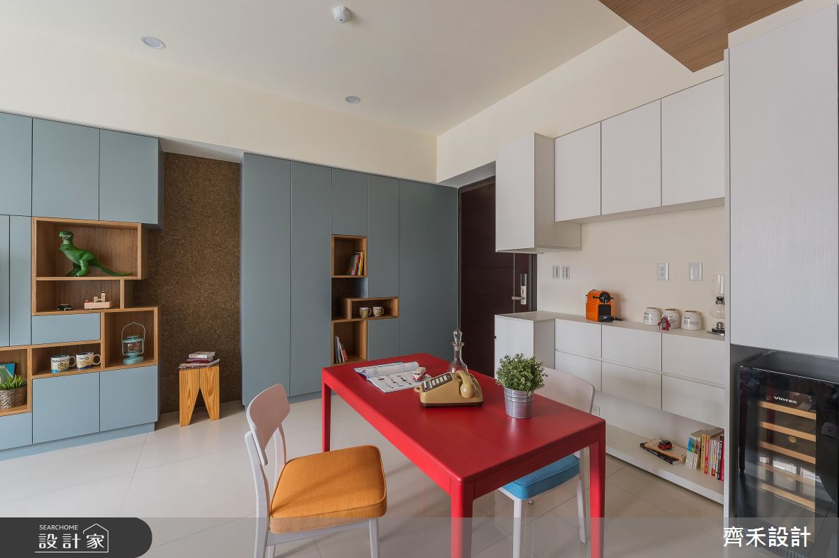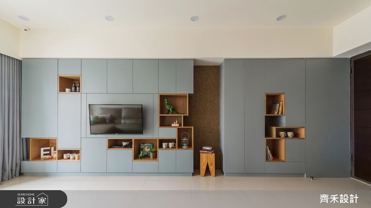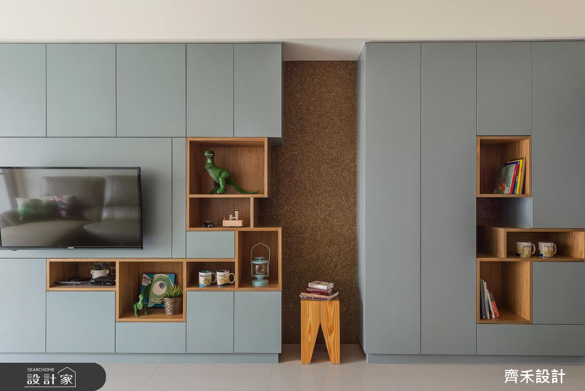 大面落地窗設計讓陽光走進室內,映照在以白色為基底的天地壁,一展清爽、乾淨的居家空間,讓藍、紅、黃色調的家具從中脫穎而出,洋溢著一股動人生氣。從開門後的玄關開始,藍色收納櫃開始一路延伸至客廳電視牆,成為公領域的搶眼視覺,量體隨機堆疊而成的櫃子設計,透過原木色調的方格嵌入藍色櫃體裡,每個方格裡乘載著不同的生活物件,隱喻日常的點滴,宛如一片蔚藍海洋中,存在一個個漂浮其中的島嶼;開放的公領域裡,藉由零裝修感、挑高的天花板做為呈現,隨著光源映照,更顯開闊舒心;進入書房及臥室的走廊則利用低矮的木作天花板鋪陳,成功界定出私領域,廊道壁面上更藉由文化石的舖陳,呼應自然簡約的北歐風尚。