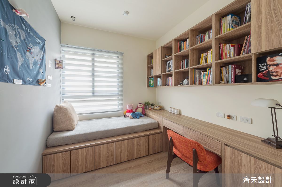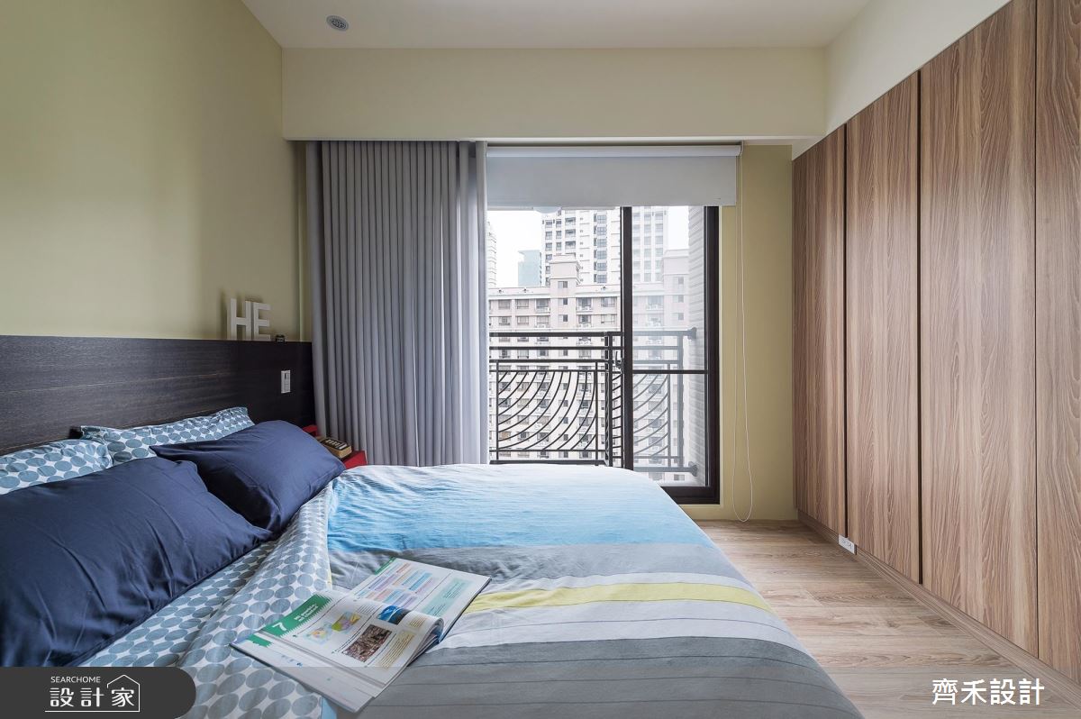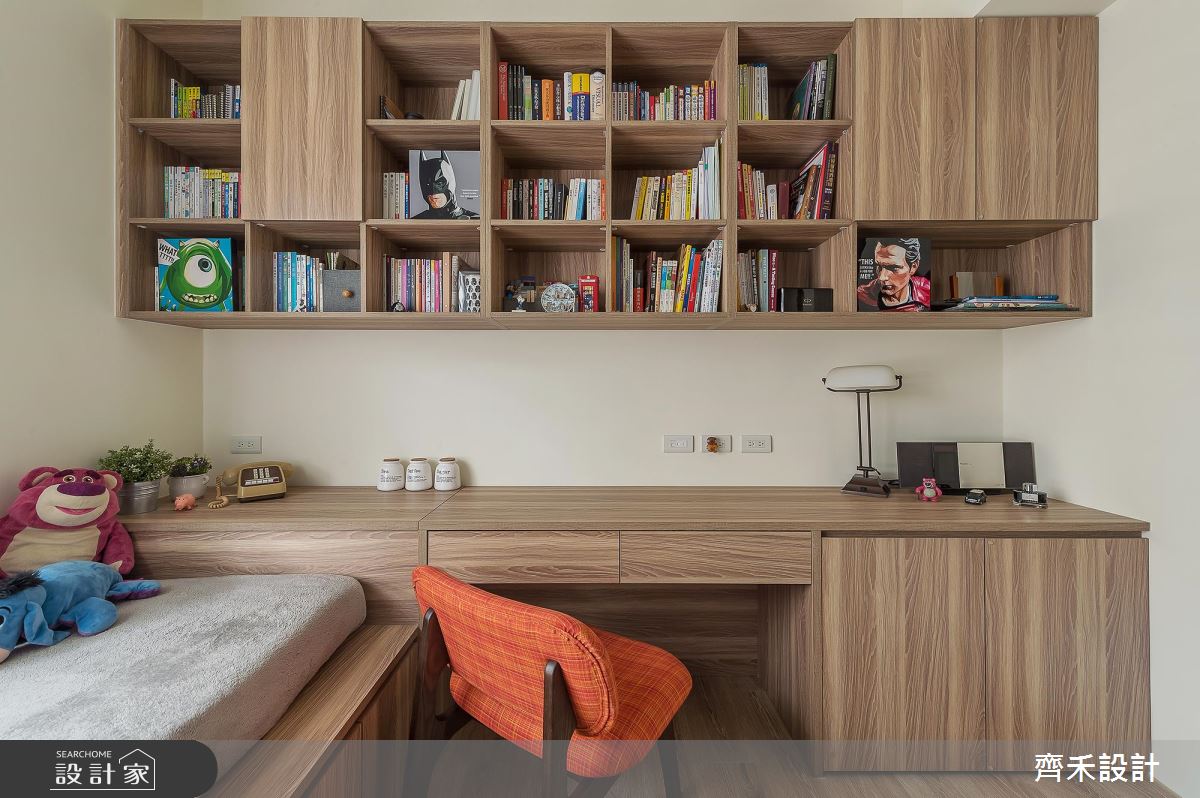 大面落地窗設計讓陽光走進室內,映照在以白色為基底的天地壁,一展清爽、乾淨的居家空間,讓藍、紅、黃色調的家具從中脫穎而出,洋溢著一股動人生氣。從開門後的玄關開始,藍色收納櫃開始一路延伸至客廳電視牆,成為公領域的搶眼視覺,量體隨機堆疊而成的櫃子設計,透過原木色調的方格嵌入藍色櫃體裡,每個方格裡乘載著不同的生活物件,隱喻日常的點滴,宛如一片蔚藍海洋中,存在一個個漂浮其中的島嶼;開放的公領域裡,藉由零裝修感、挑高的天花板做為呈現,隨著光源映照,更顯開闊舒心;進入書房及臥室的走廊則利用低矮的木作天花板鋪陳,成功界定出私領域,廊道壁面上更藉由文化石的舖陳,呼應自然簡約的北歐風尚。