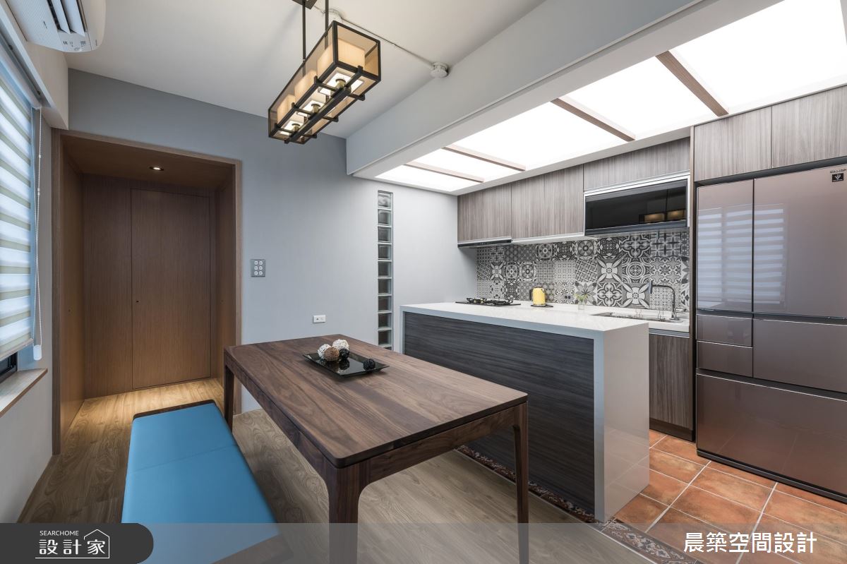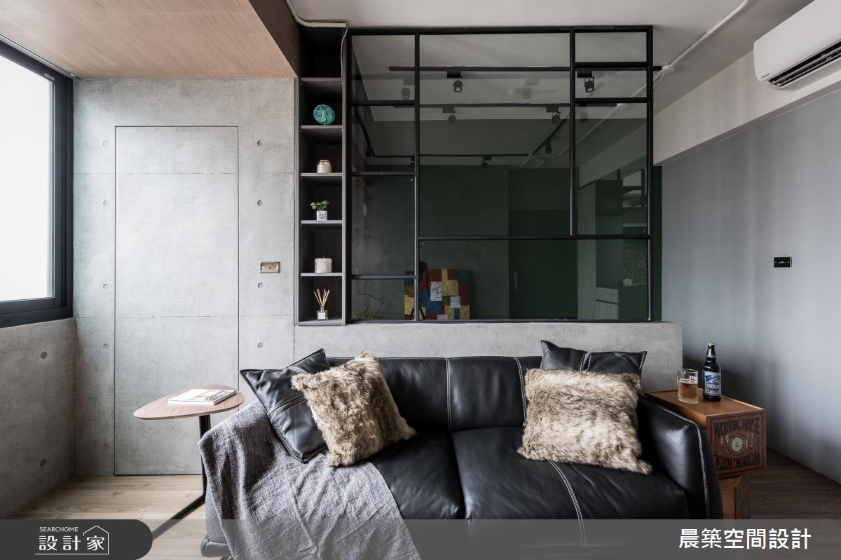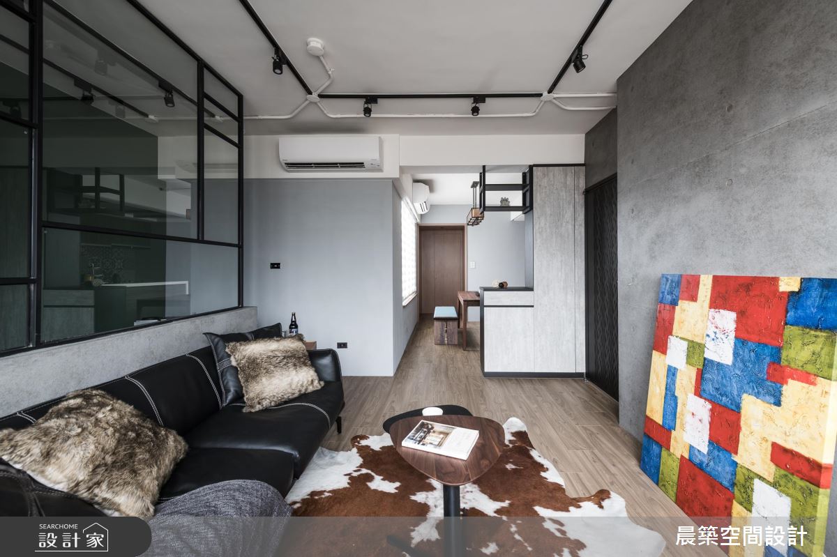 考慮到整體的採光及通風性,在格局調配上,將入口方向予以調整,於有限場域內,巧妙安排每個機能區塊,劃出客廳後方的書房及儲藏間,滿足生活上的使用;居宅雖小,卻飽含豐富的設計巧思,使用大量清水模特殊漆營造陽剛的空間基底,但揉和了彩色軟件與日式感門片的鋪排,適時柔化了視覺觀感,在衝突感中帶出時髦氛圍;並規劃開放式餐廚,塑造與客廳的開放串聯及流暢動線,透過燈光、採光等挹注,增添用餐區的明亮度,地坪與牆面亦加以花磚妝點,點出溫馨的暖度;主臥內,則作出牆面斜角導引生活動線,不只讓床頭大膽以黑色調呈現,彰顯十足個性,也可見壁材刻意為之的細緻線條,電視牆部分亦加入綿密的鐵網設計,以細節體現匠心工藝!