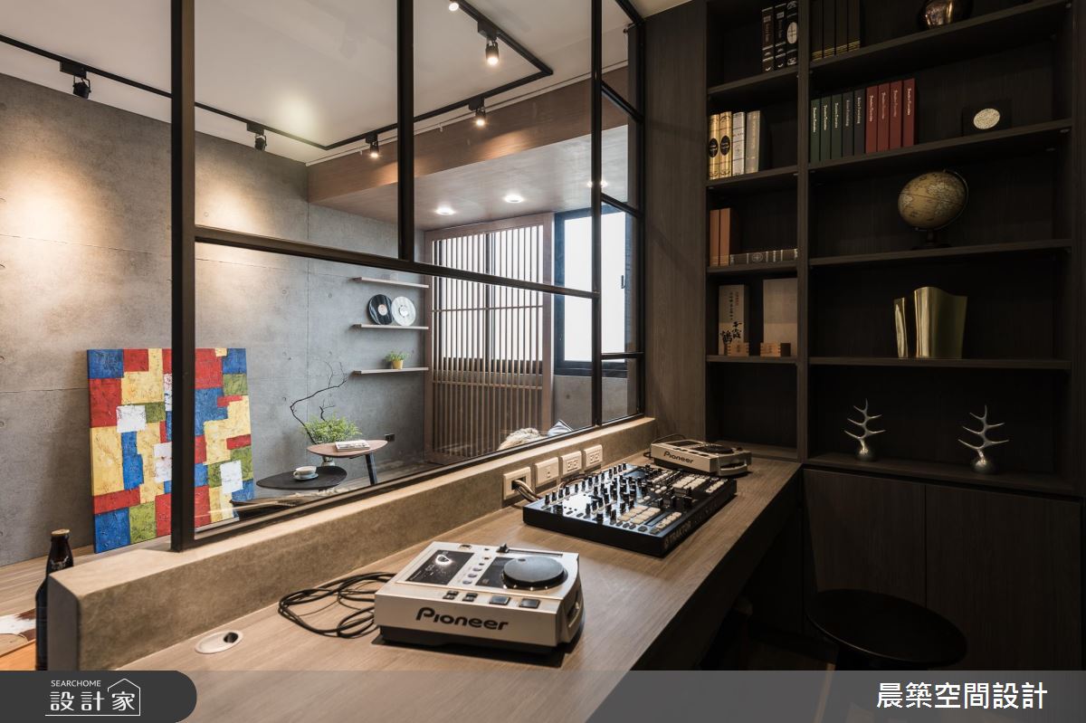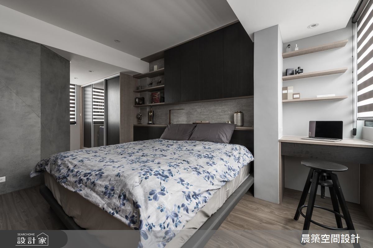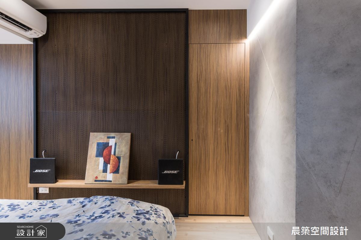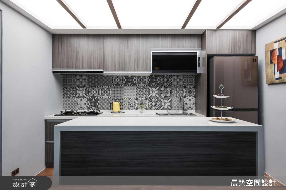 考慮到整體的採光及通風性,在格局調配上,將入口方向予以調整,於有限場域內,巧妙安排每個機能區塊,劃出客廳後方的書房及儲藏間,滿足生活上的使用;居宅雖小,卻飽含豐富的設計巧思,使用大量清水模特殊漆營造陽剛的空間基底,但揉和了彩色軟件與日式感門片的鋪排,適時柔化了視覺觀感,在衝突感中帶出時髦氛圍;並規劃開放式餐廚,塑造與客廳的開放串聯及流暢動線,透過燈光、採光等挹注,增添用餐區的明亮度,地坪與牆面亦加以花磚妝點,點出溫馨的暖度;主臥內,則作出牆面斜角導引生活動線,不只讓床頭大膽以黑色調呈現,彰顯十足個性,也可見壁材刻意為之的細緻線條,電視牆部分亦加入綿密的鐵網設計,以細節體現匠心工藝!