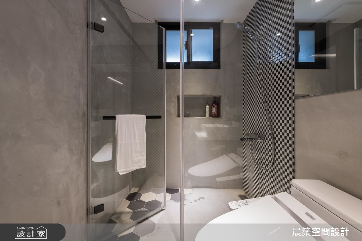 因應使用者需求,於每間房安置獨立衛浴,並採用黑白磚面搭接水泥粉光,瞬間使浴室變得賞心悅目,充滿摩登俐落的美感!