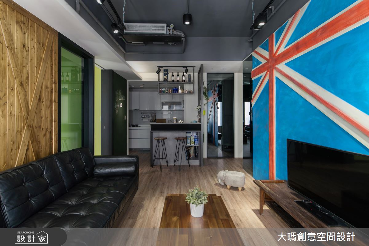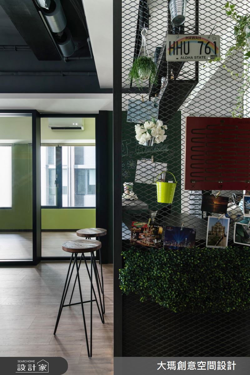 將原有的三房調整為兩房,讓空間的使用更為充裕、自在,局部門片與壁面搭配鏡面,讓小宅更顯放大、寬敞。整體空間以工業風打造,鐵件、穀倉門、仿舊木紋的材料元素,交織出自然、不修飾的室內氛圍,而客廳壁面以英國國旗為創作靈感,讓奔放的線條與色彩傾注在居家生活裡,替低調、沉穩的空間帶來一抹藝術驚豔;穀倉門與玻璃拉門成為沙發背牆,同時界定出後方的多功能室,空間裡則以綠色系為基底,注入清新氣息,加上明亮的採光映照,調和出明快、愜意的休閒生活;餐廳區特別打造屋主喜愛的吧檯,藉由鐵網屏風區隔餐廚區與衛浴,鏤空的鐵網設計更轉化為一面風格裝飾牆,讓家人的日常生活或是旅行回憶有了保存、留念的地方。