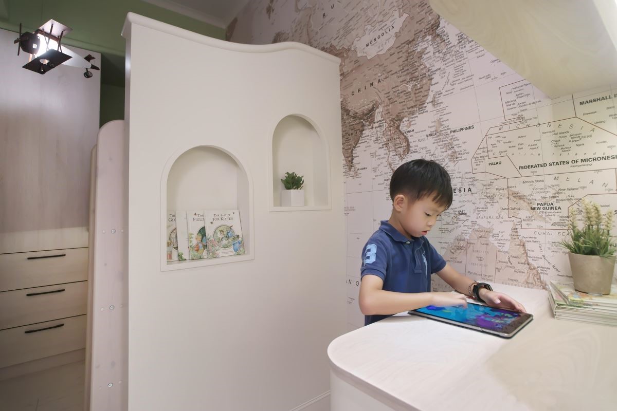 小編從小就夢想要睡在有樓梯可攀爬的床,卻從未實現。摩登雅舍的汪哥與Vivian,讓小坪數住宅擁有兩房格局,且規劃一間精緻的小孩房,房內設置可攀爬床架,貼上小男生最愛的世界地圖,滿足孩子寢居、遊戲的需求,在狹小的空間裡還能變出書桌、書牆,這樣的設計,簡直就像空間魔法。