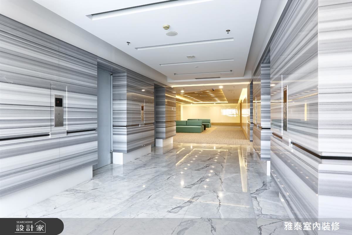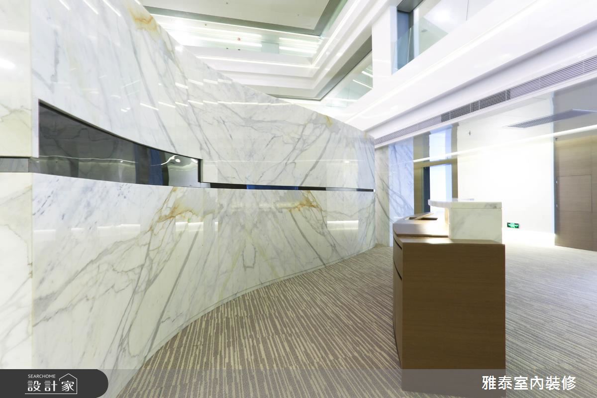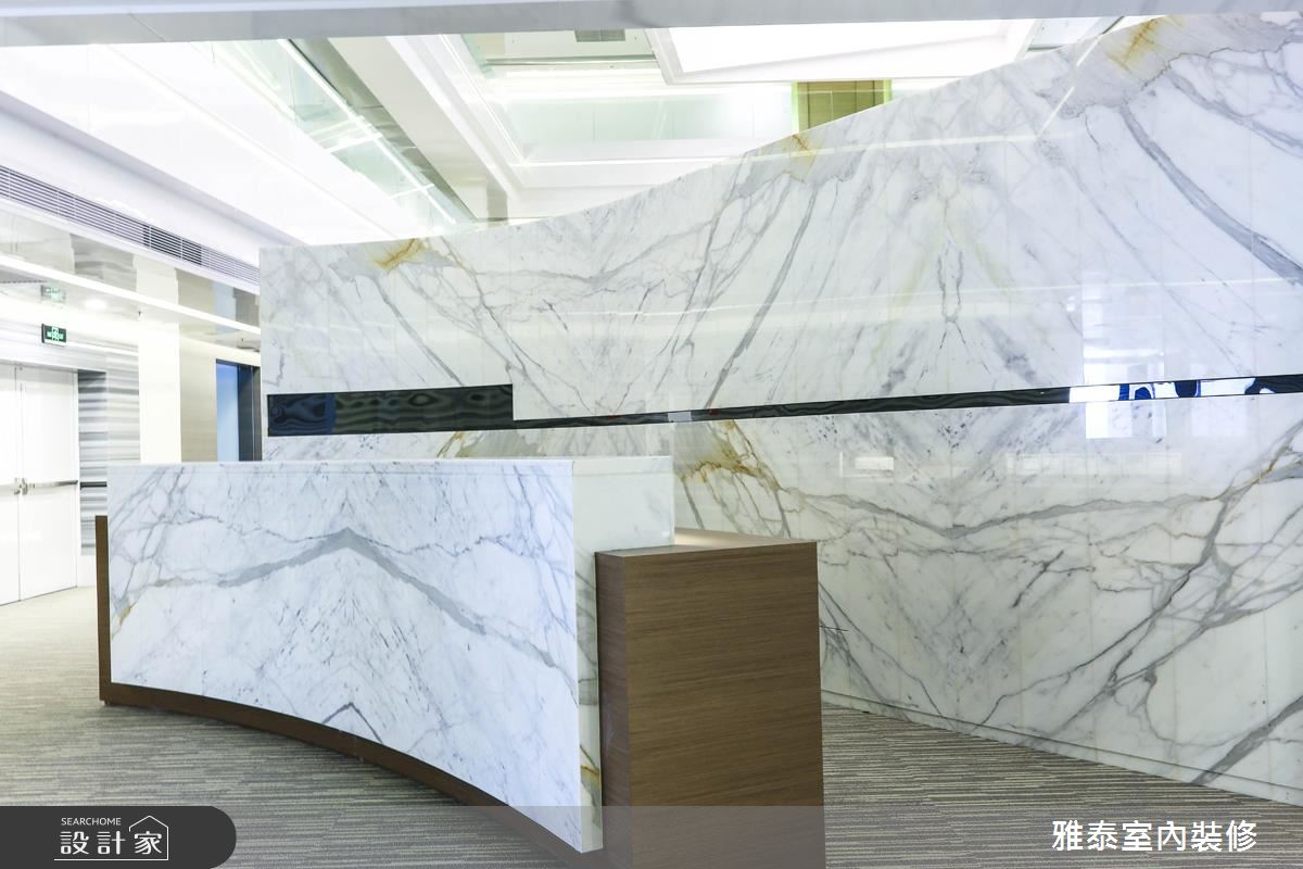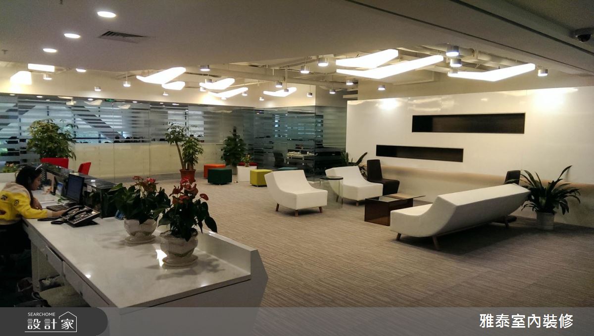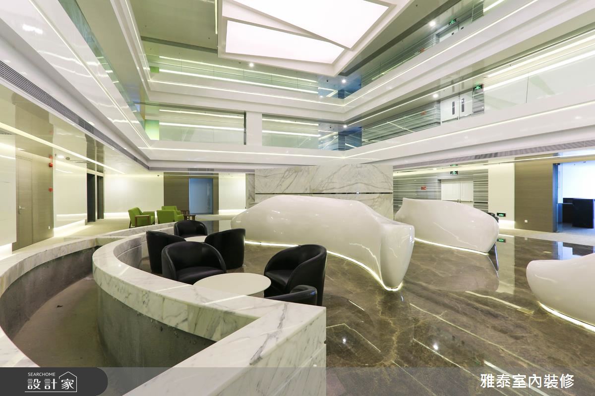 在設定上,一改原先建築師所規劃的深色沉穩風格,改以明亮、活力感作為基調,不僅拓大視覺感受,也凝聚高科技的公司印象。一樓LOBBY的四根巨柱則串起了1~2樓,形成醒目的空間焦點,設計師加入水平向的線條設計,呼應整體的灰白色大理石基底,如此修飾不但減輕柱體壓迫感,更彰顯了挑高氣派,締造讓人印象深刻現代科技感格調,公司名牌的呈現也一改傳統樣式,採用小型 LED 螢幕顯示,更貼近了企業的本質形象;而在第 26~28層的中庭區域,則藉由桌椅的安排,規劃了許多小型的討論區塊,且透過雕塑感手法打造隔間,以自由的流線,輕質的量體造型,讓各個討論區互相串聯也保有適度區隔,演繹有如美術館般的藝術視野!
