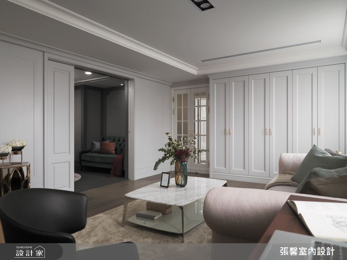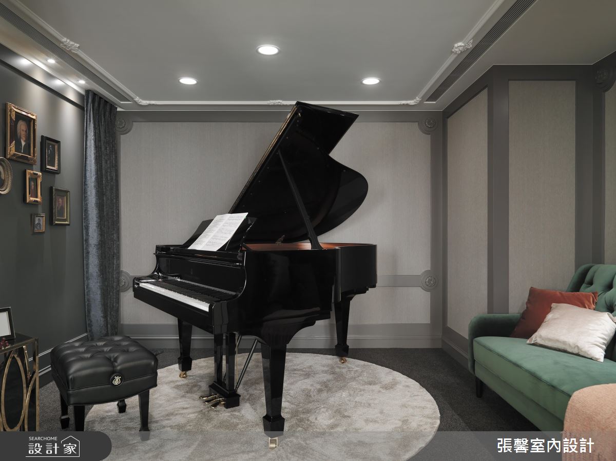 設計師運用精準的比例分割,打造時尚的修長玄關,導引進入公共廳區的流暢動線,並於玄關擺放一幅裸女畫作,將個人情感滲透到藝術表現中;客廳內,則呈現化繁為簡的線條,以淺灰色烘托內斂氣質,並揉合美好的自然光,以低調姿態塑造溫柔的美式風格,同時將琴房與客廳整合為一區,讓女主人可待在這裡,一整個下午都與琴音相伴,並特意精選青草綠的高檔面料沙發,營造視覺及聽覺的感官饗宴;原本的客廳則改為餐廳,天花板運用色塊修飾,拉出空間尺度,搭配英式維多利亞風的木餐桌,以及滿載回憶的舊木工櫃,洋溢濃郁的英式復古風情;主臥捨棄花俏的線條,以無負擔的灰色輕巧帶過,與任何家具色彩都可融合得很好,一旁則規劃舒適臥榻,搭配著質感抱枕與窗簾,構成一處紓壓的休閒角落!