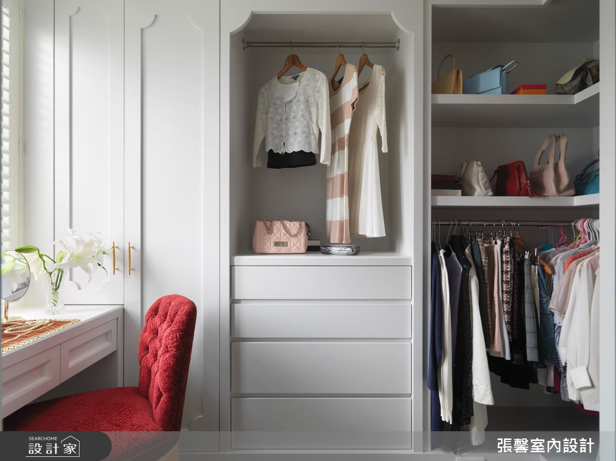主臥更衣間中,承襲著輕盈的色調背景,但刻意選用紅色梳妝椅跳出亮點,充滿主題式的配色讓人雙眼為之一亮!