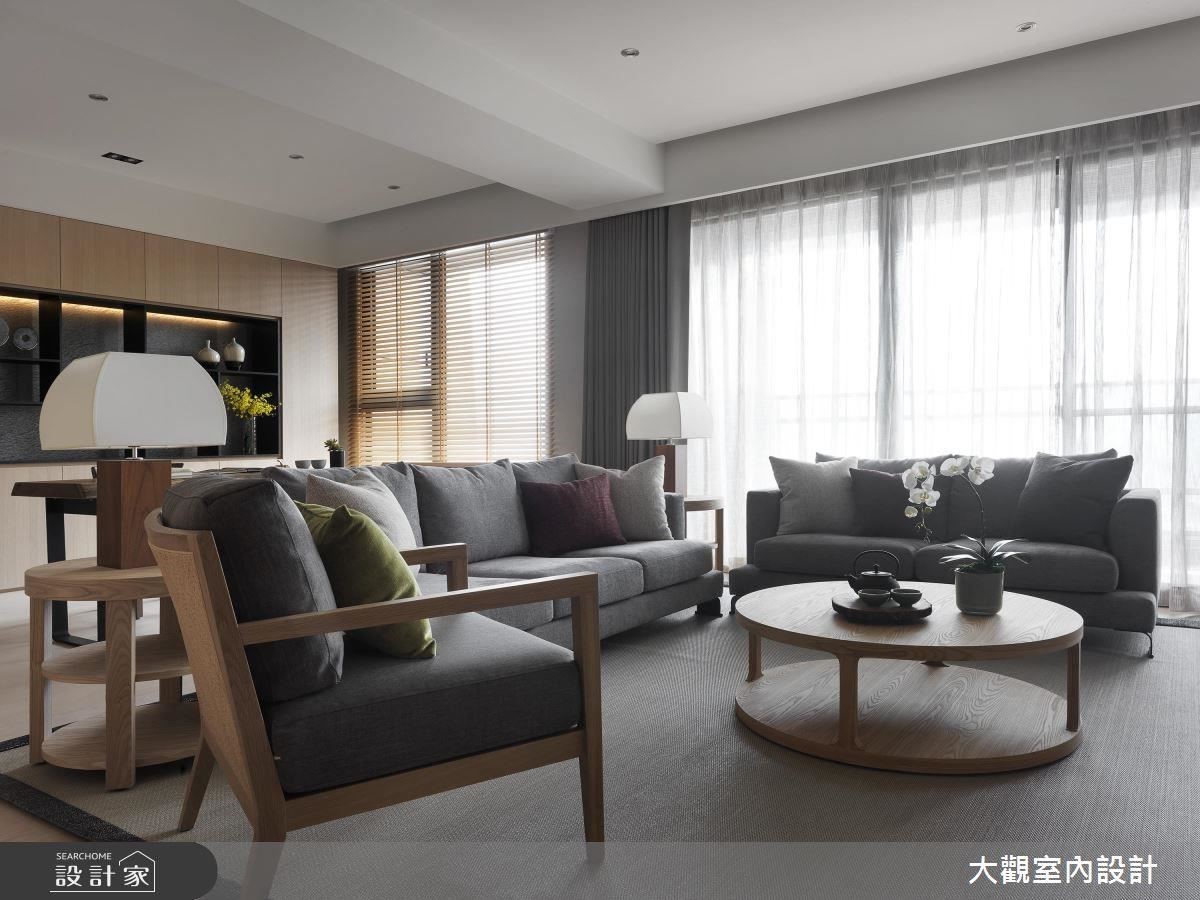 將客廳與書房的隔間牆移除,僅以筆直樑線做區隔示意,同時二區的落地窗得以相連,讓採光面與空間感均有放大效果。書桌後運用橡木牆櫃搭配深色展示櫃創造視覺端景,其中天然木紋與等距分割的牆面線條則提供視覺穩定律動的安定感。