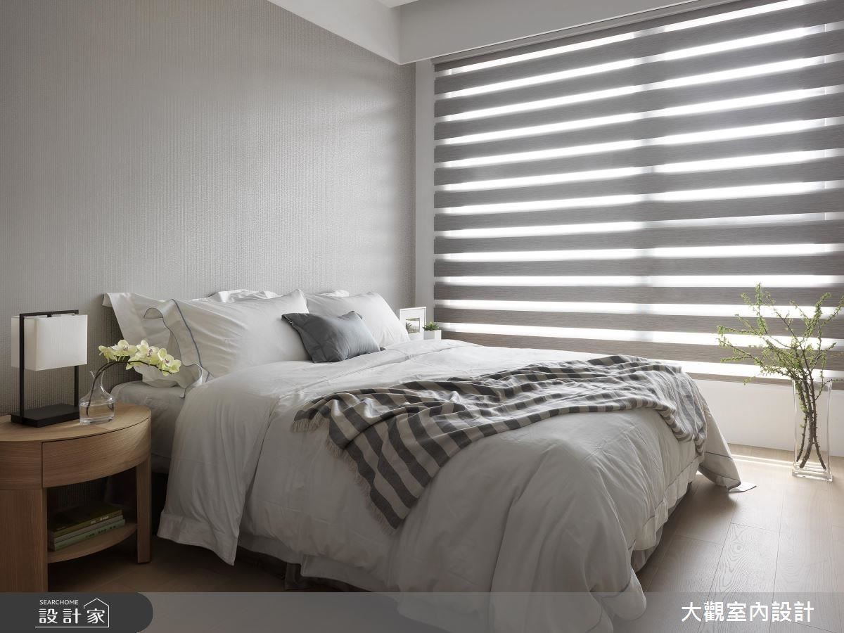 次臥房設計以飯店式休憩功能為主,藉由灰白色系為主色調,再運用原木色調的電視牆做跳色,搭配簡單卻實用的收納櫃,讓充滿美感的設計也有貼心機能。