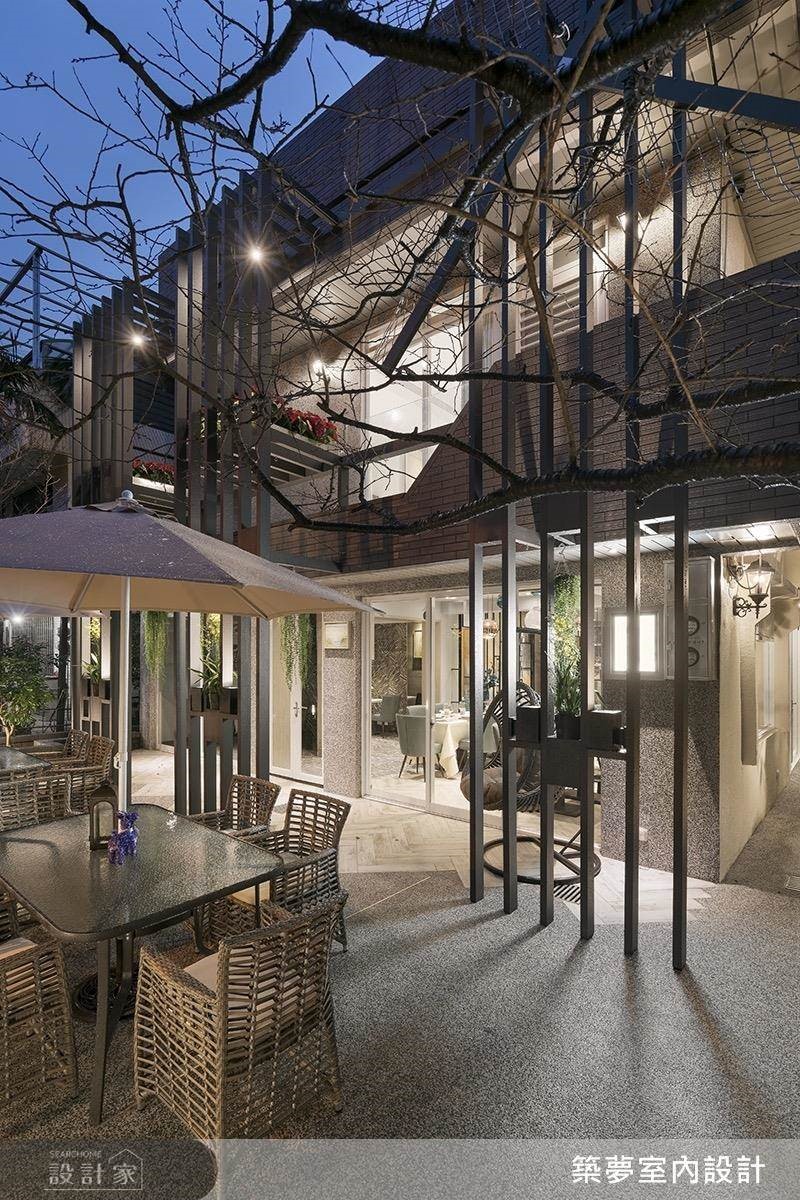 建築線條與豐富而充滿藝術性的色彩運用,是這次改造的兩大重點。羅芳銘設計師將建築外觀以俐落的垂直鐵件,拉高兩層樓別墅立面,並置入風車造型、融入花架功能,打造出醒目吸睛的建築外觀,並在開闊的前庭,設置了彷彿歐洲露天咖啡座的開放空間,期望左鄰右舍能不時來串門子,共享戶外優美環境。