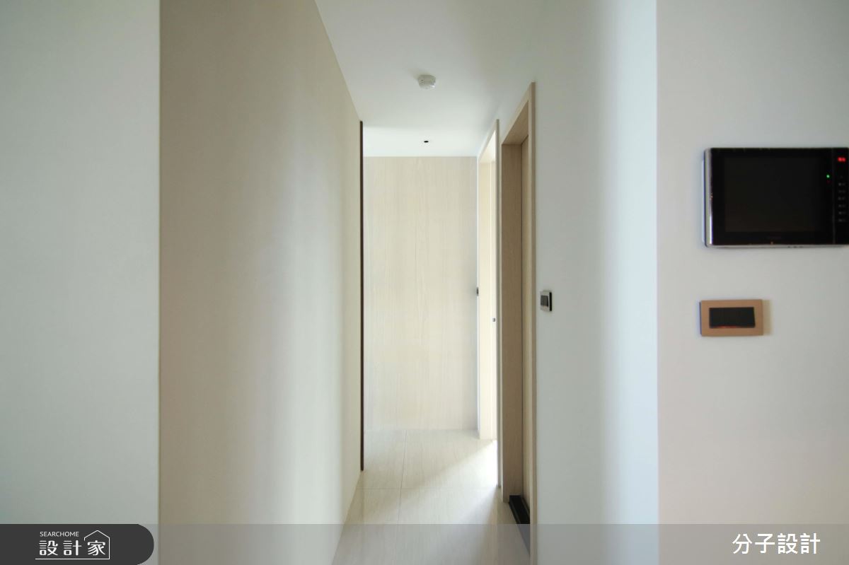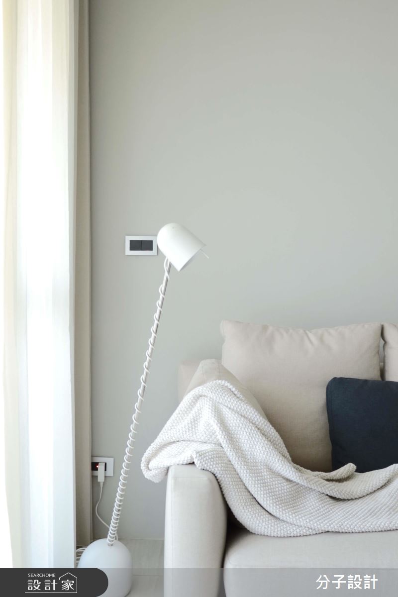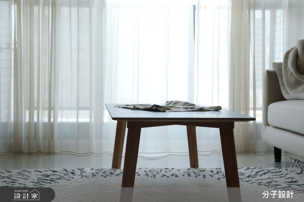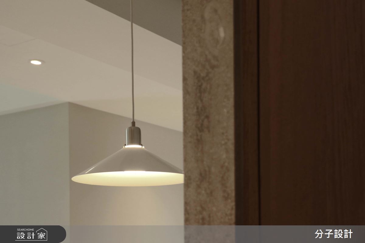 公領域以全開放配置串聯客餐廳,在風格鋪陳上,給予純白輕盈的用色,融合溫潤自然的建材,搭佐柔軟舒適的軟件,打造整體的清新風格,客廳窗面則給予透光窗簾,隱約將柔和採光引入室內,營造天然的穿透力;餐廳領域,透過壁材營造略帶粗獷的內斂風貌,在淡定的灰階中,詮釋用餐的區域段落,搭配著上方一盞吊燈照明,將悠閒氣質表露無遺;全室的天花樑體則不做過多修飾,但巧用白色基底的串聯,將樑柱化為層次分明的架構,增添室內格局的豐富感;廊道間,則承襲著白色的延續,在「空」與留白的表現中,宣告回歸私領域的靜謐感受!