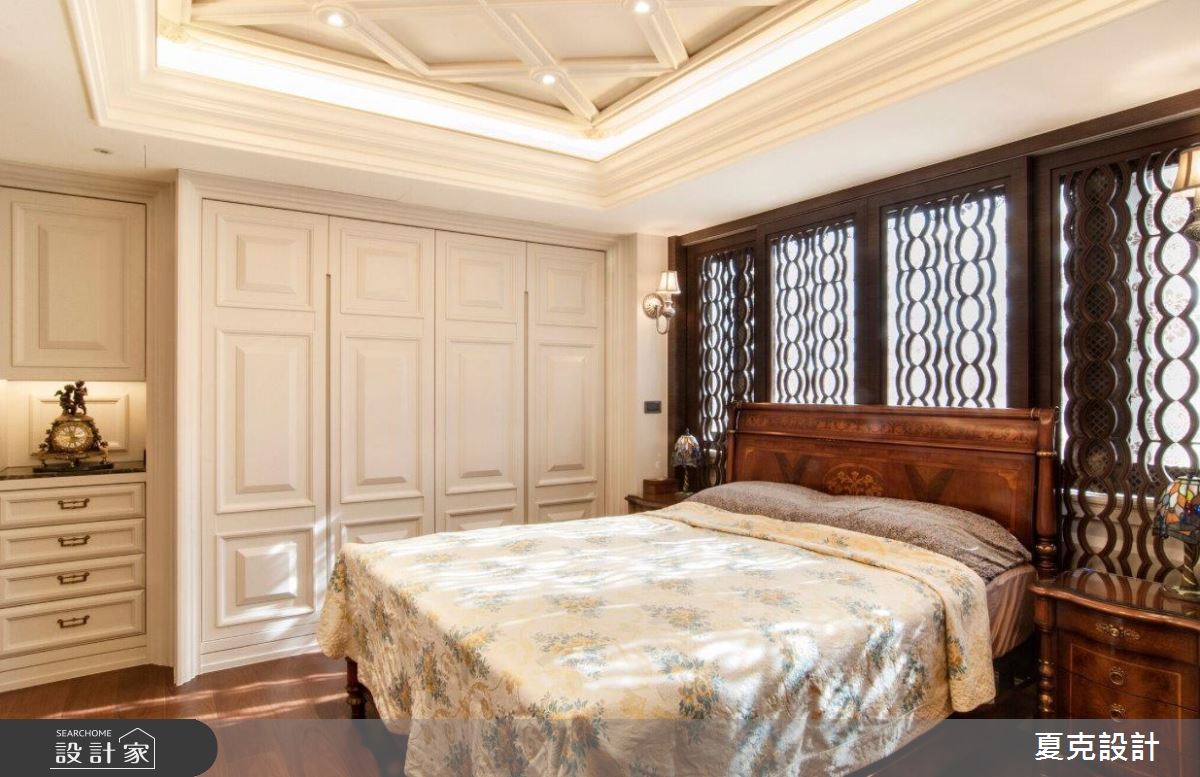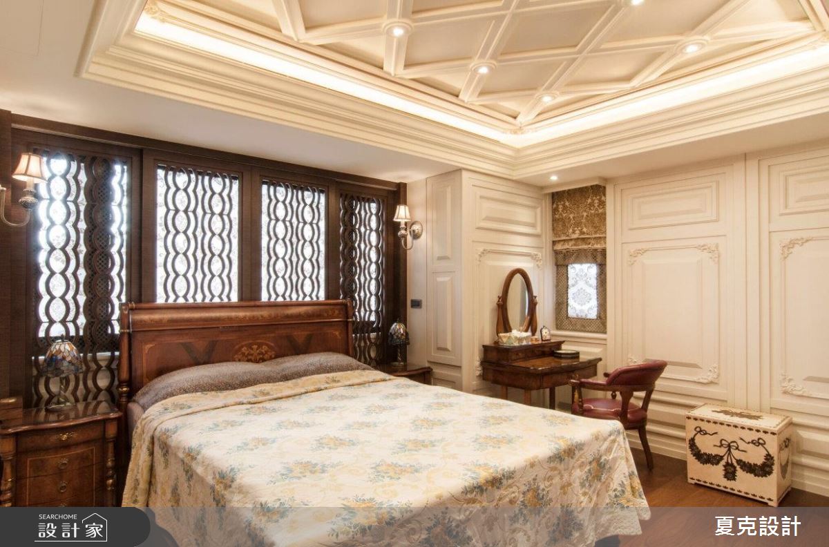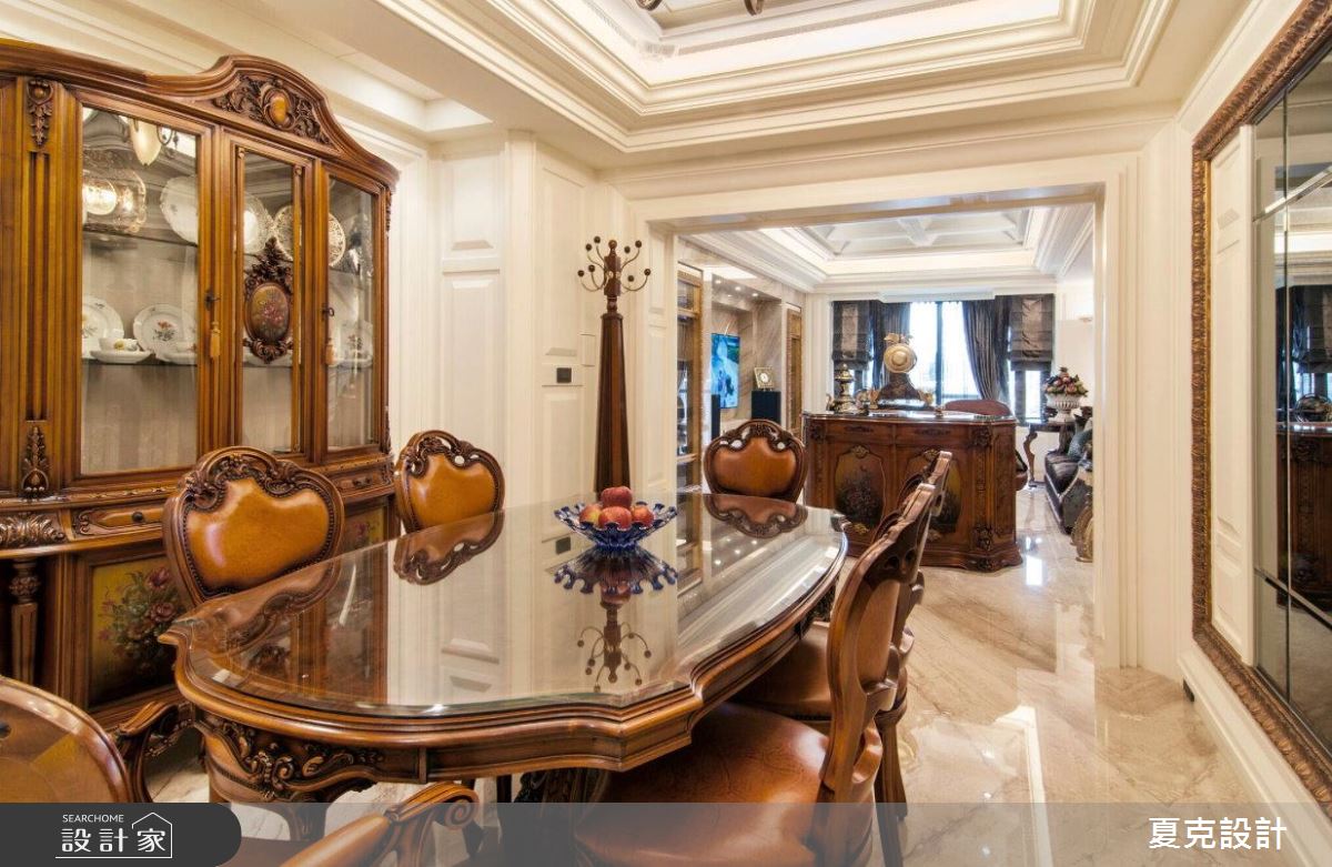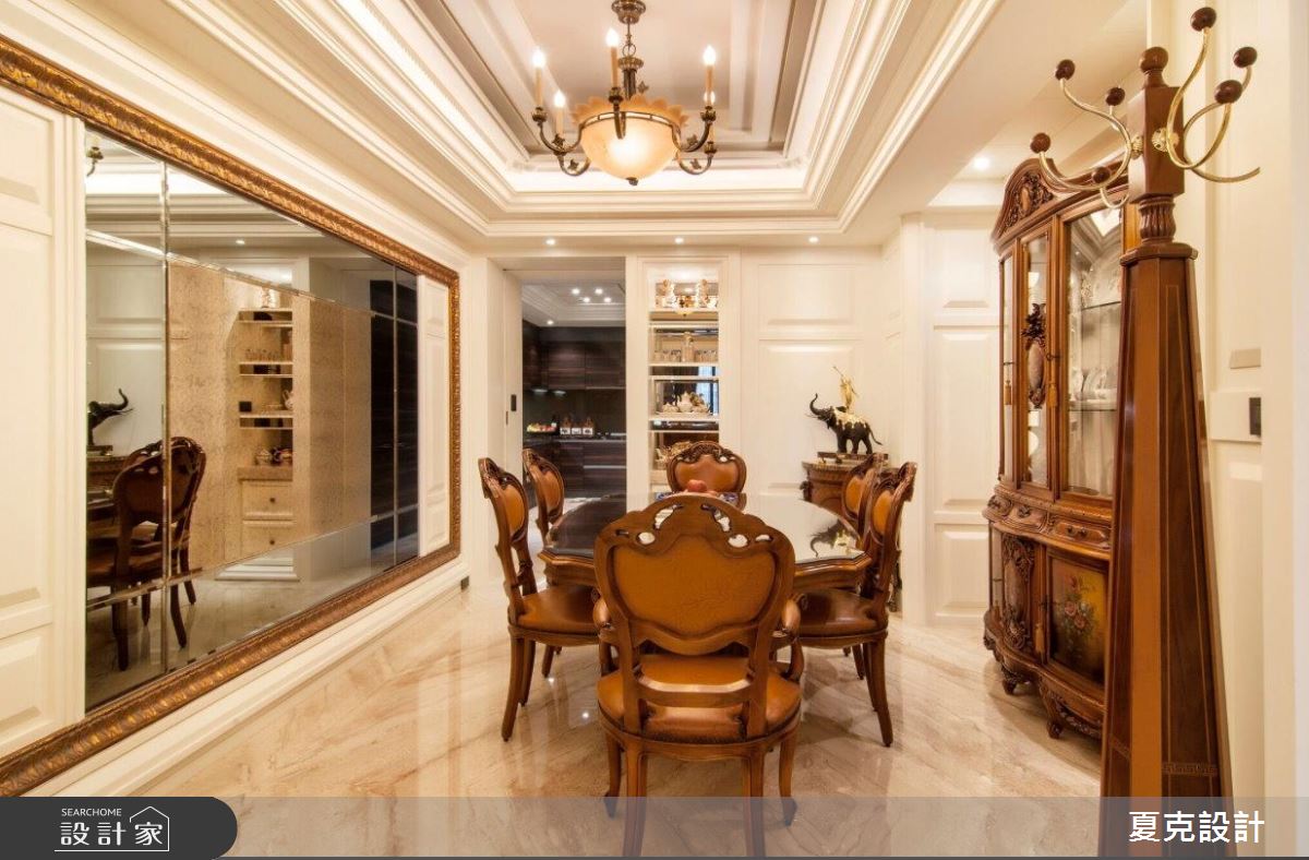 客廳天花加入層疊的細膩線板工法,讓整體視野更形挑高,寓意步步高升的居家氣勢,電視主牆則選用天然石材堆砌而成,以菱型鑽石斜角切割工法,呈現更為深遠的視覺維度,讓空間感更顯拓大,並搭佐燈光的點亮烘托,型塑開闊明亮的公區視野;步入餐廳區,則可見牆面加入大片鏡面,達到延伸尺度的目的,並陳設經典紮實的木作家具,在立體雕花的語彙及藝術飾品的妝點之下,凸顯精緻工藝美學;寢臥內,於床頭牆窗面做出獨特的鏤空設計,援引戶外採光的篩落,再搭配上復古溫潤的寢具、床頭櫃、梳妝檯等,締造內斂高雅的場域特質!