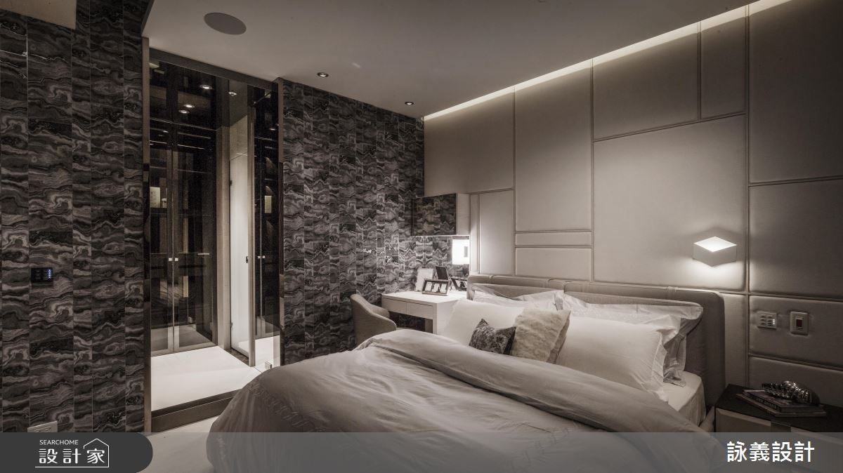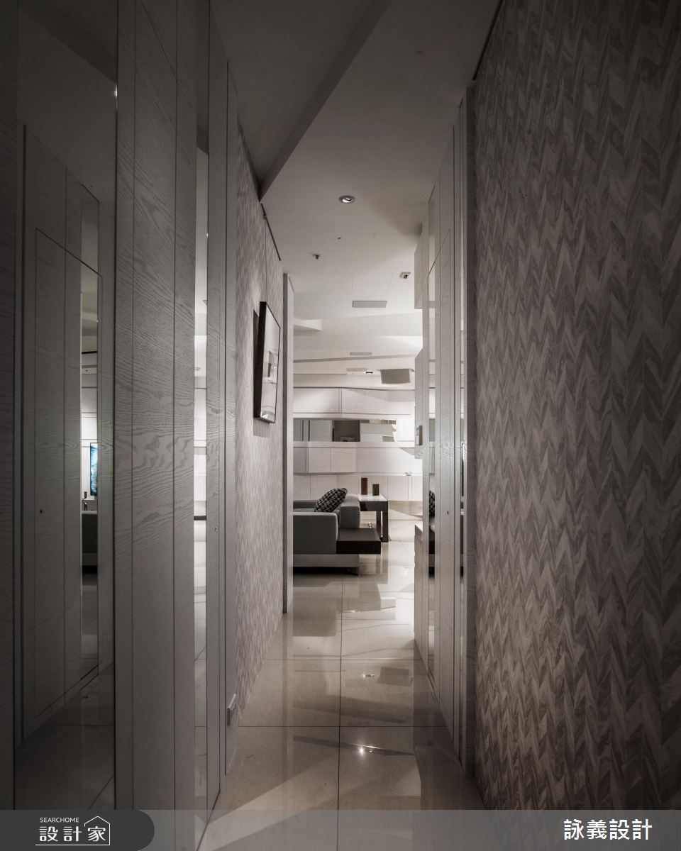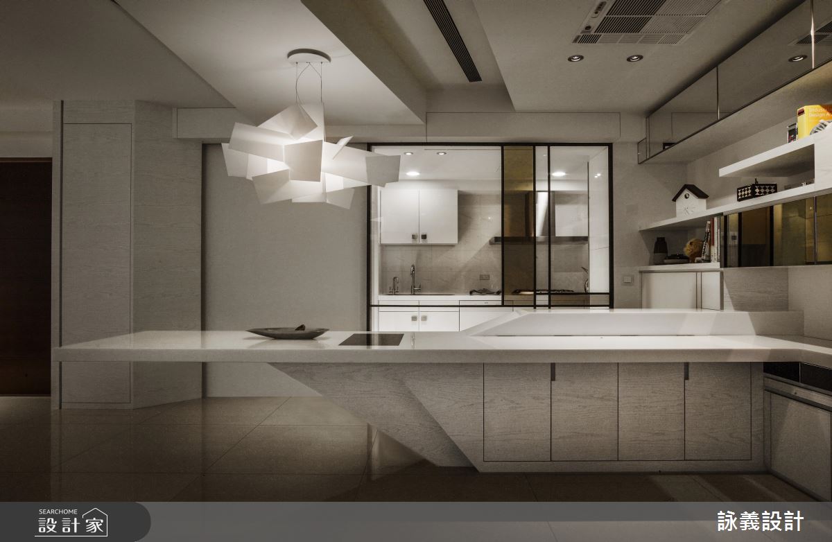 整體在牆面、天花等處引用多層次的線條轉折、幾何語彙,堆疊出充滿律動感的空間意象,從電視牆起始,即透過進出面交錯的設計,銜接展示平檯與隱藏收納櫃,呈現富有節奏感的立體主牆,天花板也同樣呼應著牆面,在燈光烘托下鋪敘更挑高的居家架構;來到餐廚區,也可見巧思設計,將櫃體與桌體做出一體規劃,從立面延伸出浮島式餐桌,且穿插著鏡面妝點,搭佐前衛吊燈畫龍點睛,使場域溫馨卻不乏摩登韻味;同時,亦藉由燈光衍生更多情境變化,若是開啟暖白光線,則與戶外採光相得益彰,延伸白晝的舒適質地,或也可在夜晚打開藍色燈光,瞬間改變氛圍,變化成神祕科幻,有如異星般的唯美視野!