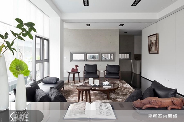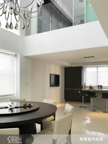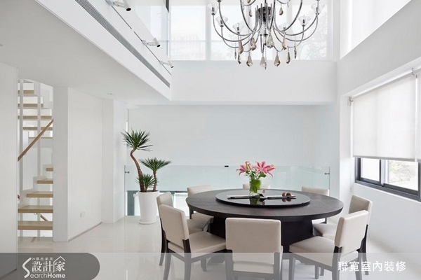 玄關利用整排白色鞋櫃,引領我們走進室內;暖陽從落地窗引入室內,客廳裡藉由大量玻璃質材的隔間,坐在沙發也能欣賞戶外的綠意植栽,流動、穿透的視覺感受,模糊建築內外界線,讓室內外皆是宜人景致。天花板與壁面以簡約的白色調鋪陳,地板則以深色石材打造,形塑俐落、乾淨的空間氛圍;踩踏木作梯面的階梯來到二樓,玻璃質材的運用讓自然光持續走進室內,展現澄澈明亮之感;圓形木桌傳遞屋主心儀的傳統中式美學,更隱喻團圓之意,天花板則懸掛結構感的吊燈,詮釋中西美學合併之美。