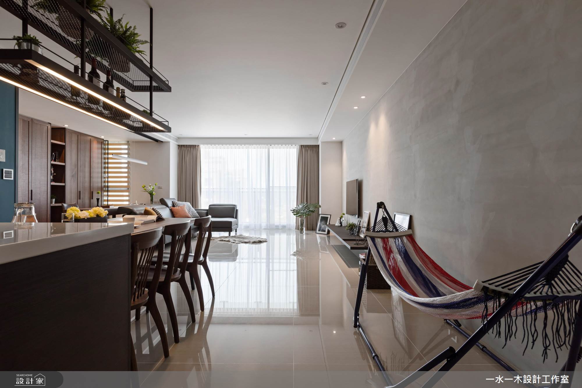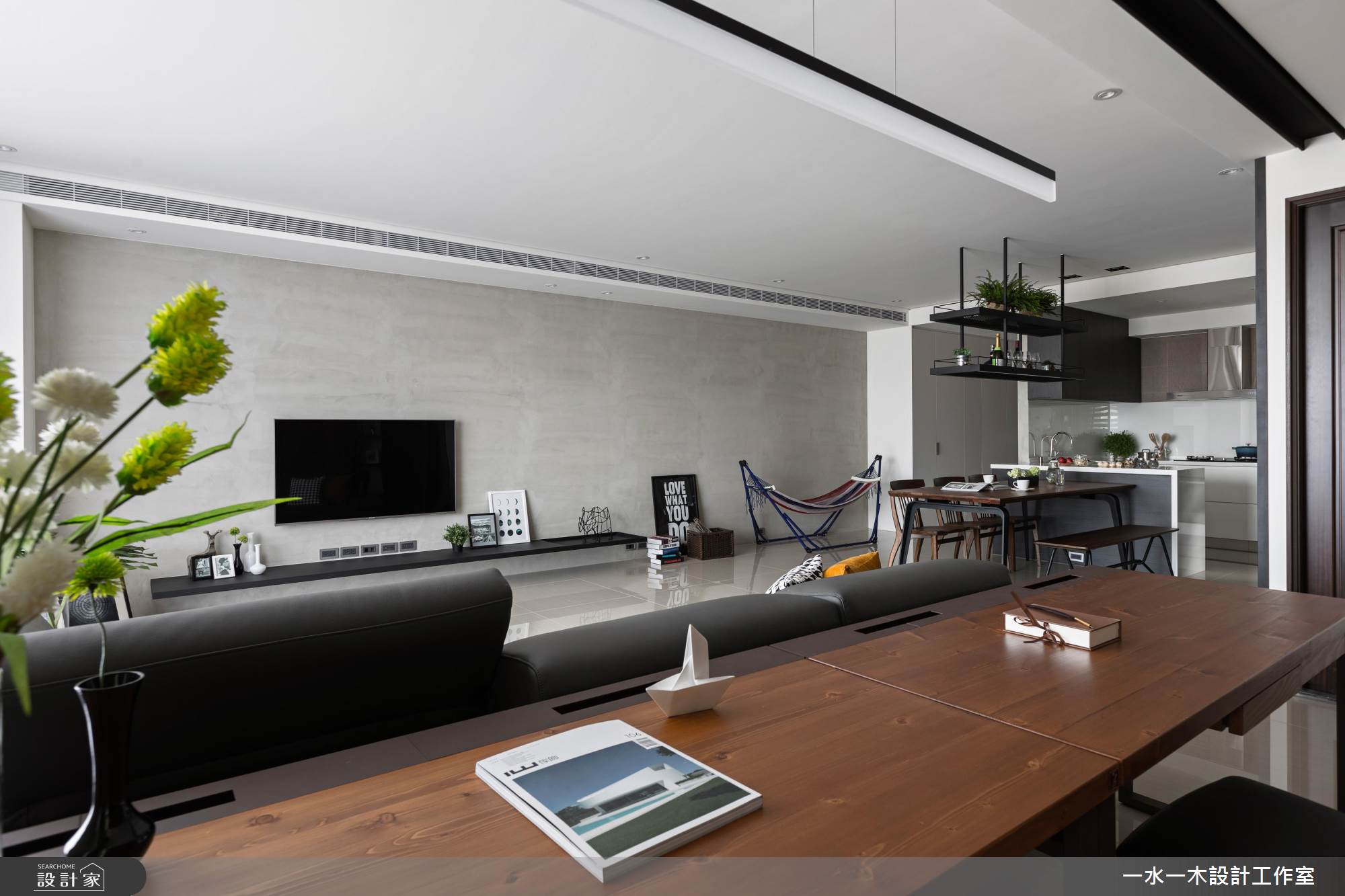 旋開大門走進室內,先是半開放式的廚房映入眼簾,接著是寬闊明亮的公領域;整體空間無刻意裝修,大量的留白下,讓收納櫃與主體牆設計演繹出屋主的性格,同時創造出漸層的視覺風貌;清水模質感的電視牆面,流露自然無華的生命力,平台上擺設藝術畫作、植栽與風格物件,調和出清新、紓壓的美學生活;沙發後方的書房區以深色木紋為家具材質,巧妙界定出主次領域,形塑安定、清靜的閱讀環境;中島與餐桌串連出餐廚空間的核心地帶,上方垂掛一座鐵件層架,強化收納也滿足閱讀空間的使用機能;主臥室延續公領域的清爽無壓質感,以白及灰紫色系配搭;次臥室則安排鋼管設計,並於收納空間的門片上貼附鏡子,一方面讓空間更顯放大,另一方面當女屋主挑鋼管舞時,還能自我欣賞動人的舞姿。