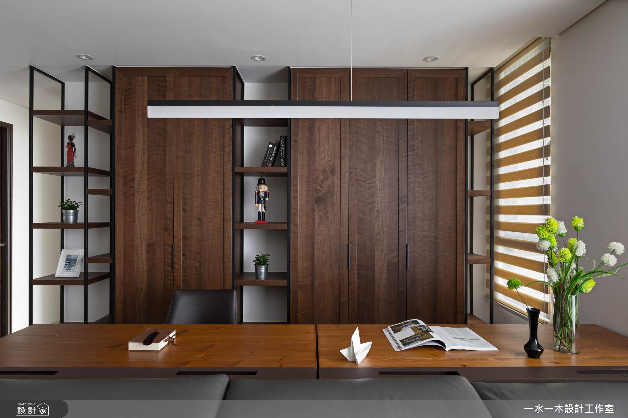 書房區以深色的木紋肌理,打造一面收藏品展示櫃,藉由開放與封閉的櫃體設計下,虛實相兼,創造出生動與活潑的空間氛圍。