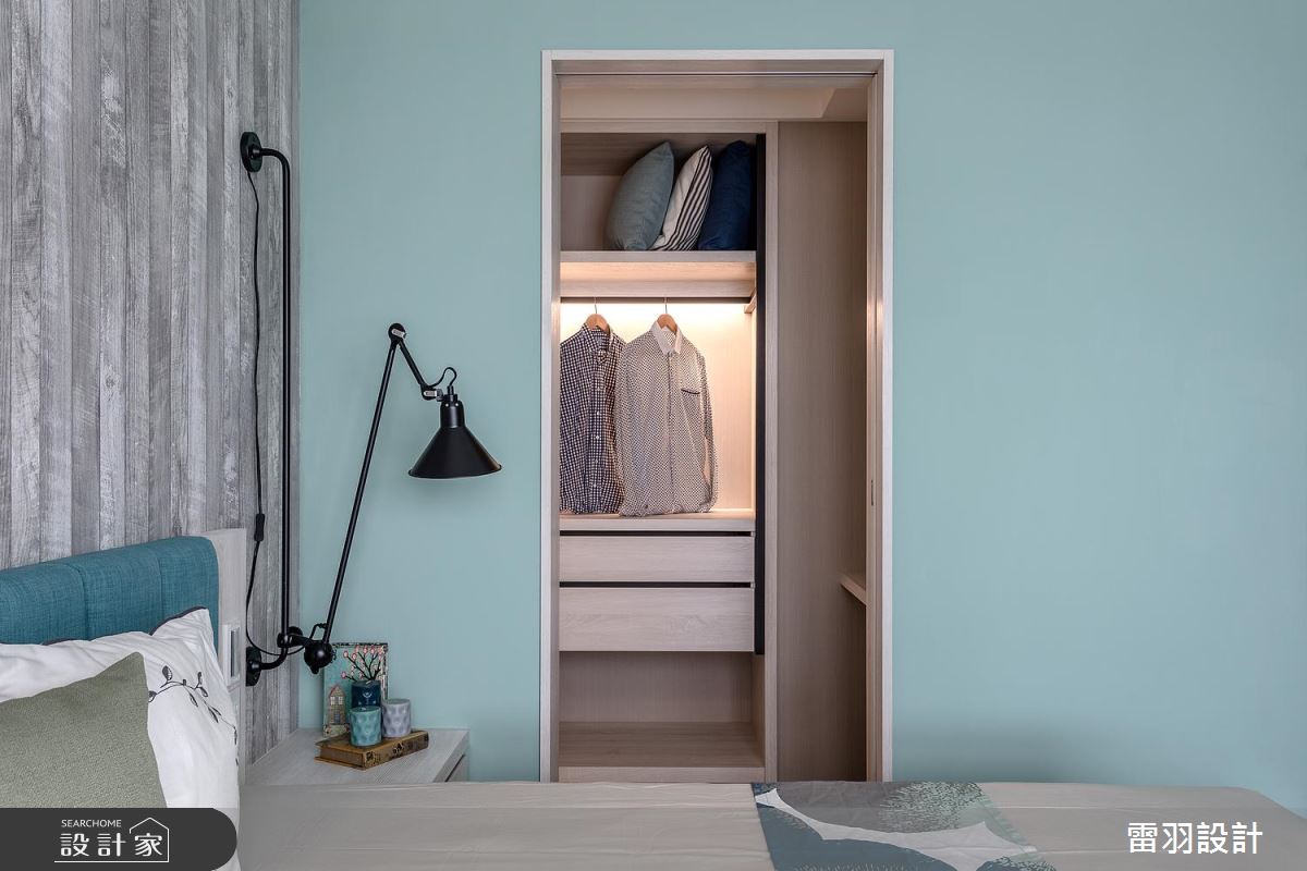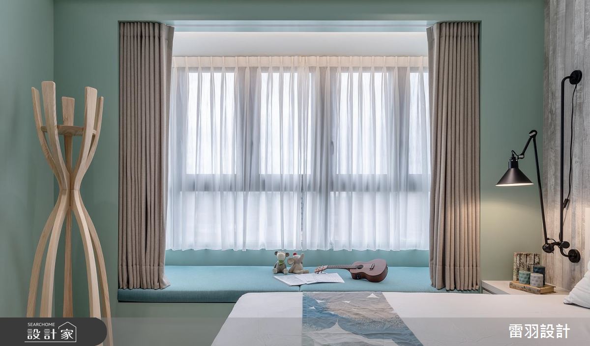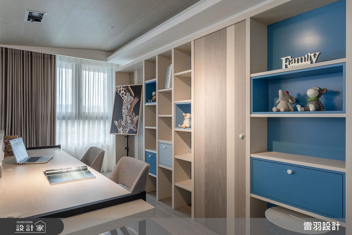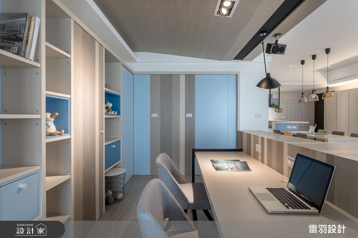 公共空間擁有明亮、寬敞的視野,設計師透過開放式設計,納入了客廳、餐廚,以及一個大書房,並運用豐富的繽紛藍色調妝點空間,讓居家空間帶有活潑輕快的氣息,而電視牆則鋪上了溫潤的文化石,富有北歐風的自然人文氣質。書房處除了規劃了大面的書牆設計,並加入藍色和木質跳色的童趣點綴,寬敞的大書桌則可以容納兩個人一起使用,增加生活中的互動性。主臥室原有的更衣間容量不足,設計師將格局重整,納入了兒童房的局部空間,在主臥內規劃了獨立更衣間,充實收納機能性。