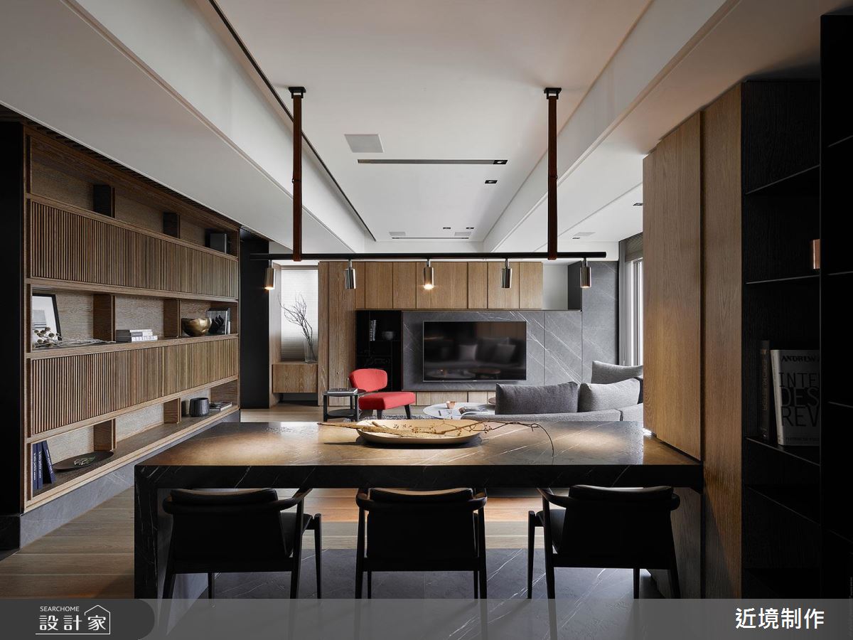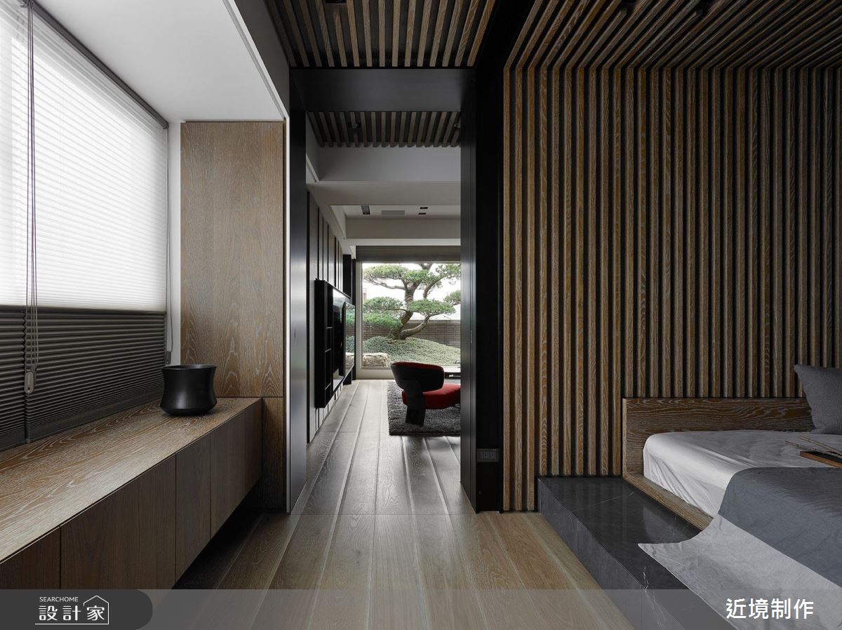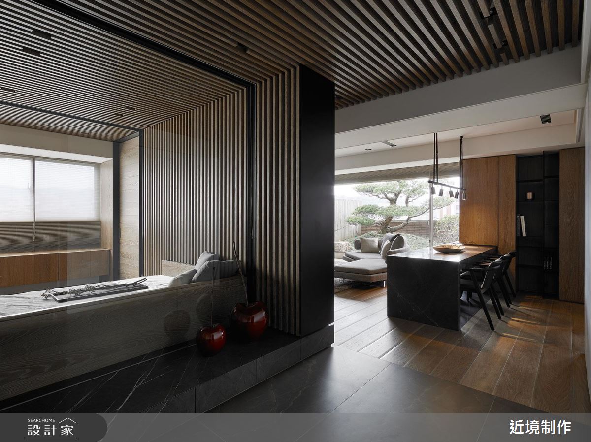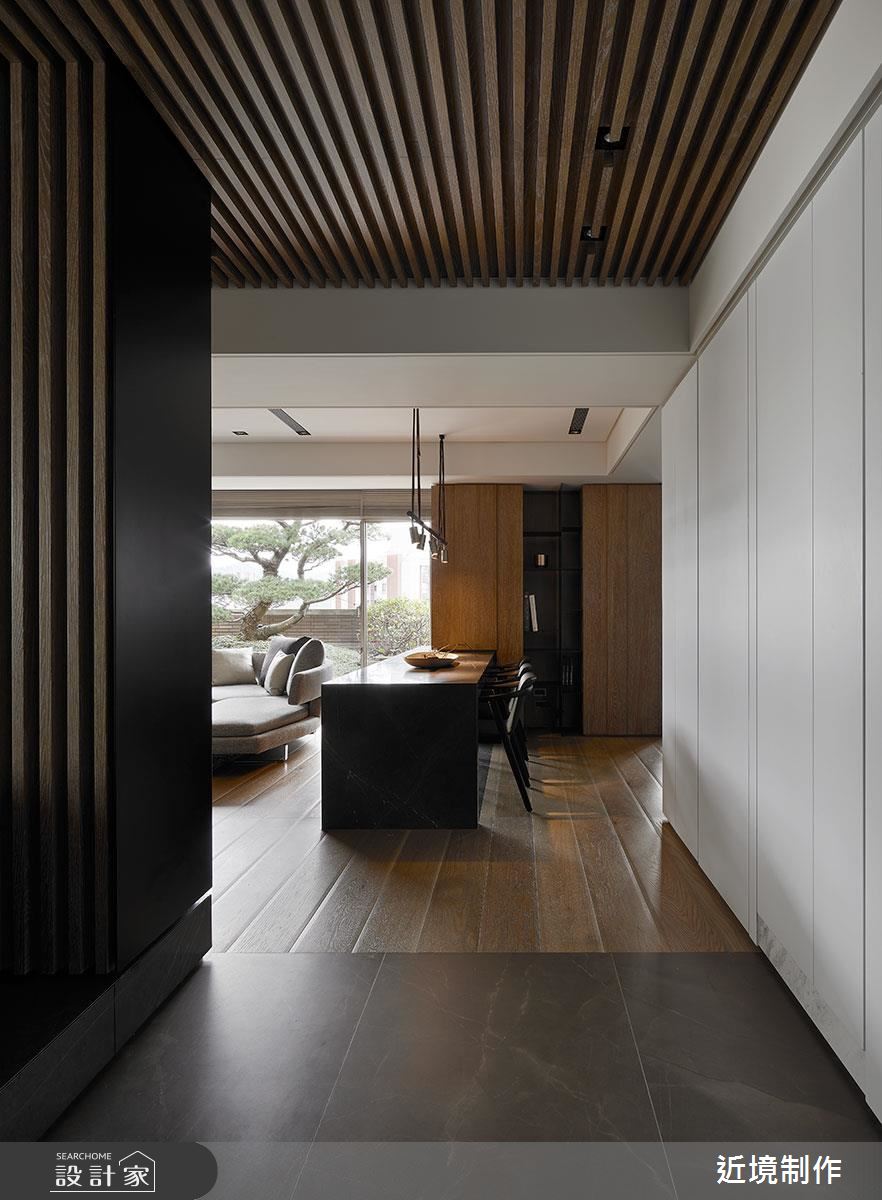 廳區借景入室,在框景的架構中,從室內即收攬戶外的綠蔭如畫,讓生活隨時與天光、綠意保持連結,令人如置身於自然,回歸到極簡而純粹的初心,並大量使用鋼刷木皮作為建材,在深淺木色的交錯下,替居家增添細密的美感,呼應自然內斂的現代人文主軸,且搭佐格柵線條的演繹,帶動具有律動感的秩序性,營造場域的放大延展感;同時打破不必要的阻隔牆面,擘劃流暢的場域動線,讓每個區塊都得以保有串聯,締造每個區塊別有洞天之感,成就既流動又獨立的生活場域!