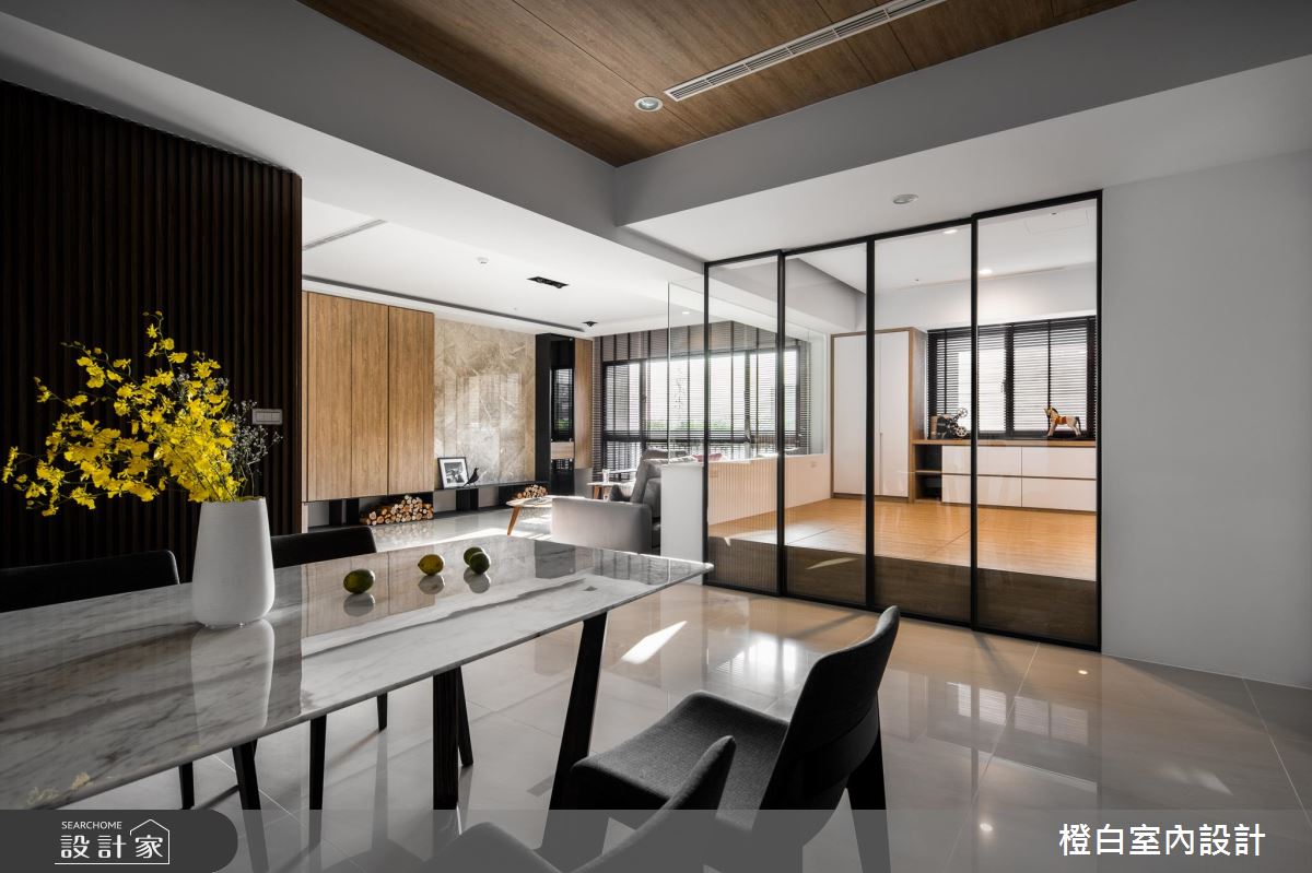 首先在玄關利用格柵隱藏門片打造 L 型置物間,容納一家 4 口大鞋量,更兼具行李箱收納機能。公領域利用開放設計串連,設計師巧妙取消隔間牆,讓自然光透過多功能書房的鐵件玻璃隔間,為位於中央無採光的餐廳帶來充沛光源,為一家人打造寬闊、通透的共享領域,而與大理石電視牆結合的大面積櫃體則精準收攏雜亂的可能性。私領域根據家庭成員的喜好設定牆面色彩,次臥皆以墊高地坪的方式擴充收納量度、提供各年齡層應用的高度機動性。