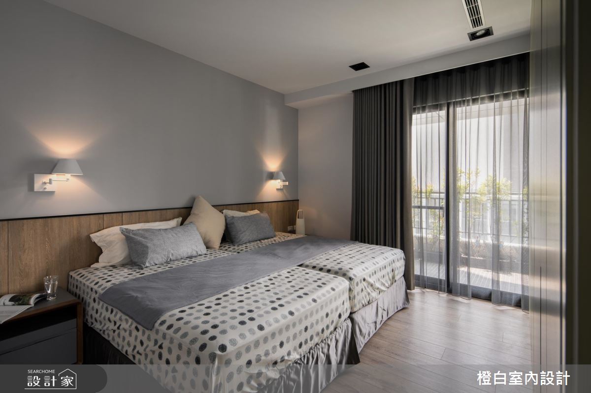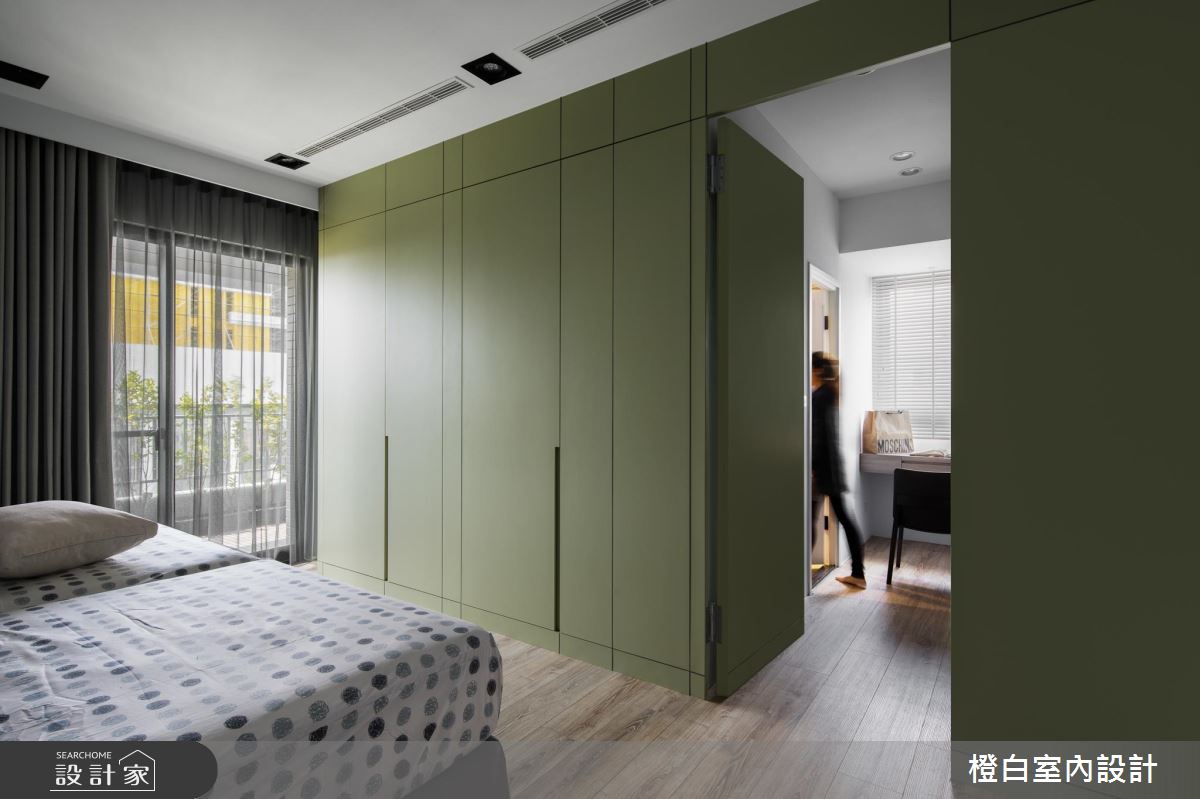 主臥利用與櫃體結合的隱藏門片打造療癒的草綠色視覺,其實是收攏通往梳妝台與衛浴空間的通道,與灰色結合木作的牆面相呼應,創造寧靜的舒眠場景。