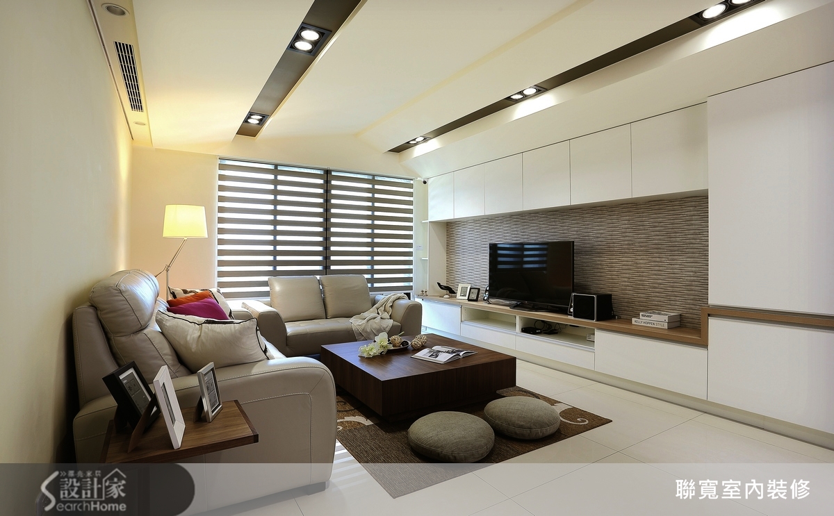 取代常見的層板設計,設計師在客廳天花板融入斜屋頂的概念,並加入線條、燈溝等層次變化,完美化解因樑柱高度落差所帶來的壓迫感。