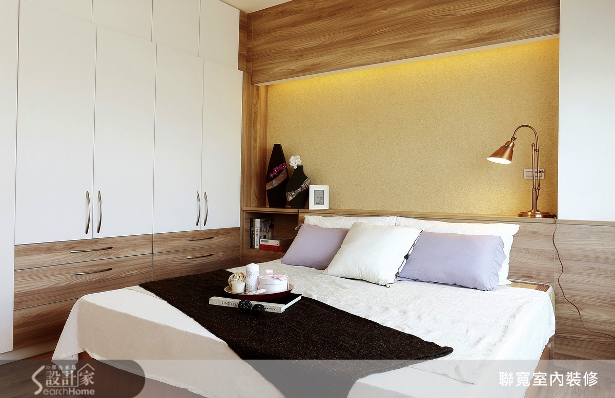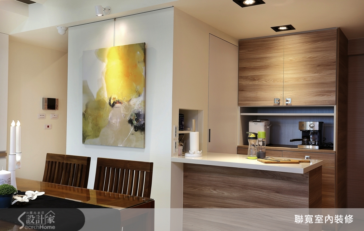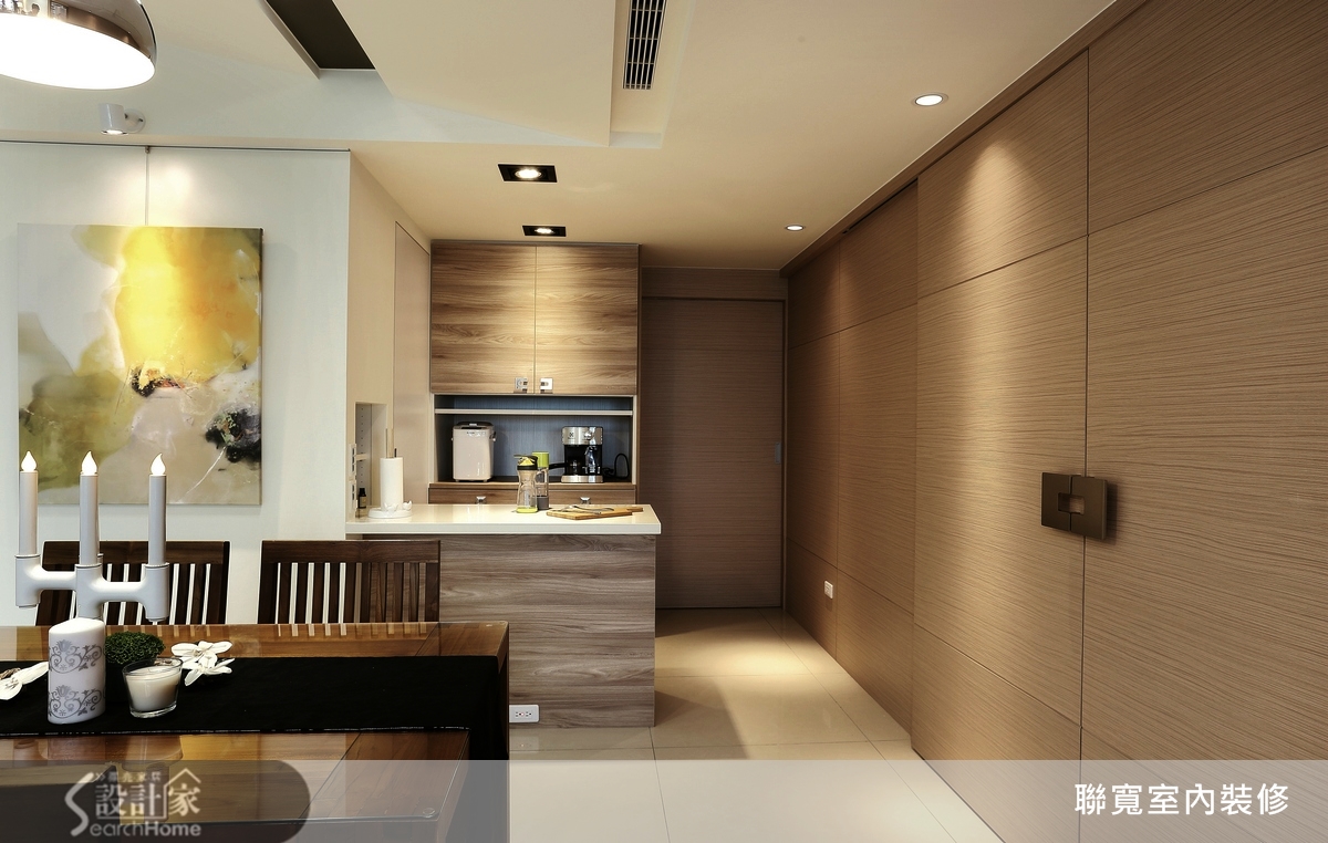 為了讓屋主回到家能夠充分的休息,設計師將公共空間和私領域明確劃分,客餐廳區著重在空間的放大,利用簡約的線條,將空間感延伸放大,並且能夠容納鞋櫃、儲藏室、電器櫃、吧檯…等大量的收納規劃,不僅滿足了居住者所需要的收納量,齊備的機能也讓生活變得更加便利。至於屬於私領域的臥室、書房,則具有完整的隔間設計,增加獨立空間的隱私性,並運用溫潤的木質色調比例,搭配柔和的燈光、顏色,營造舒適休閒的生活氛圍。