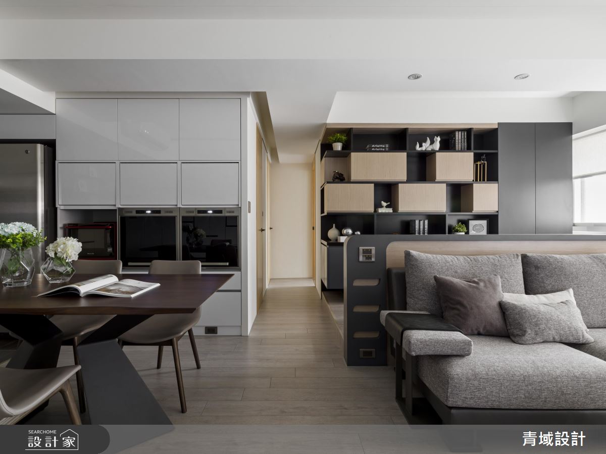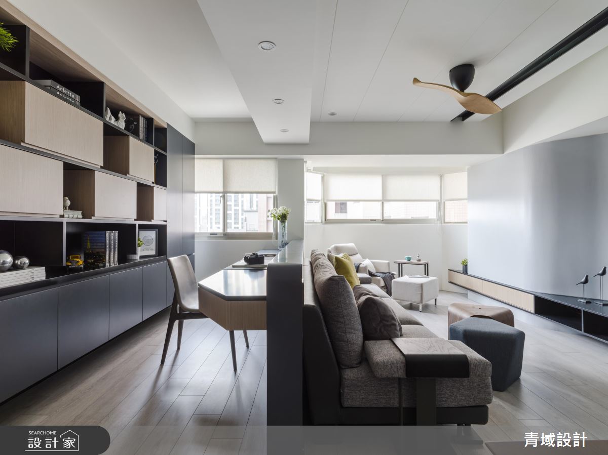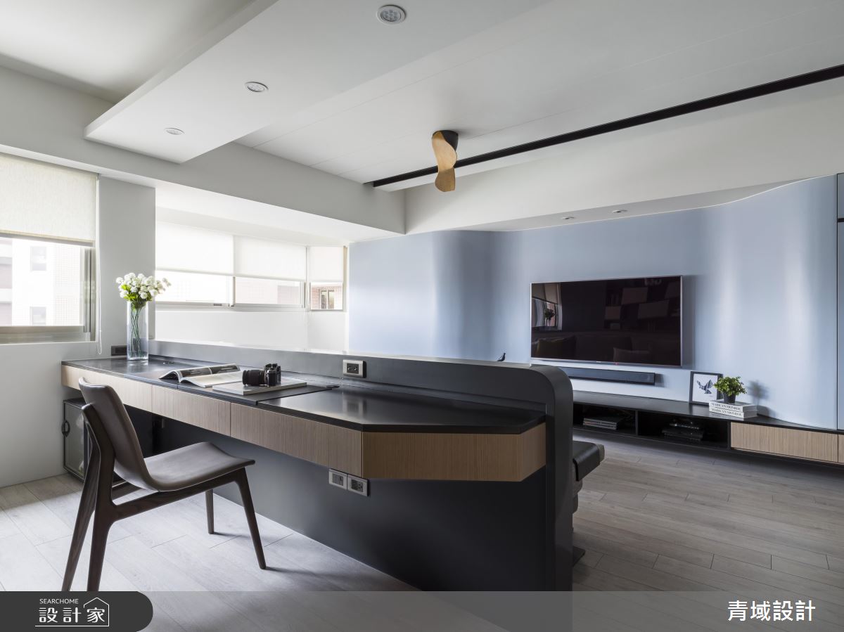 老房子既有的粗大樑柱結構,讓視覺上有很大的壓迫感,設計師運用弧形的牆面造型設計,包覆了冷硬銳利的柱體線條,同時也讓收納櫃從玄關可以一路延伸至客廳,滿足大量鞋子的收納容量。玄關旁則以櫃體隔間劃分領域,另外也更加強了廚房的收納需求。男屋主希望在書房閱讀工作時,也能看到客廳的電視牆,設計師藉由開放式的設計手法,增加開闊明亮感和空間的互動性,後方的書牆也成為了客廳的展示端景,而書桌矮牆同樣採用弧型設計,化解邊緣的銳利稜角,不但看起來更加柔和溫潤,並兼具了使用安全考量。主臥室以簡約明亮為主,以淺色木質和淡紫色營造出清爽柔雅的氛圍,並善用樑下空間進行收納規劃,達到舒適與機能的完美最大值。