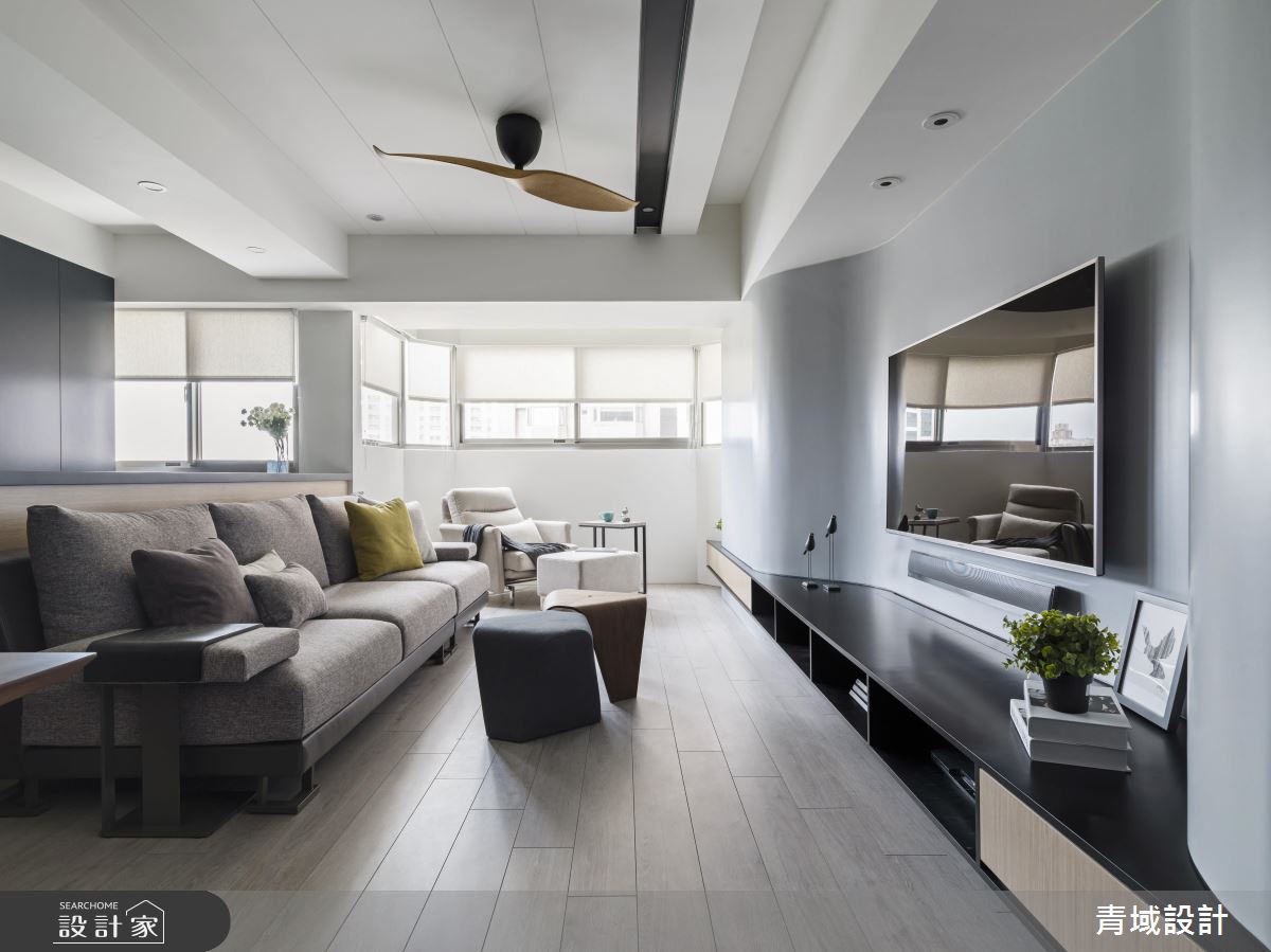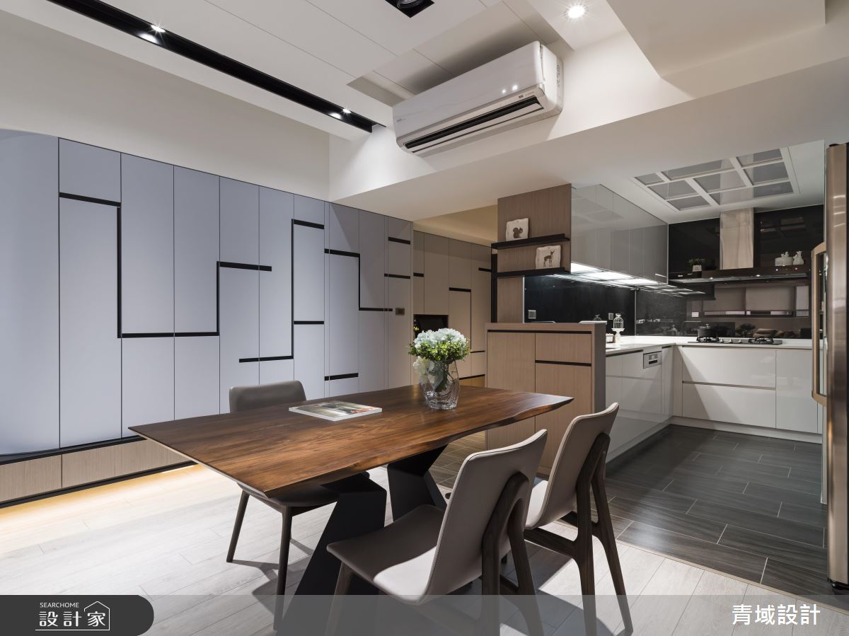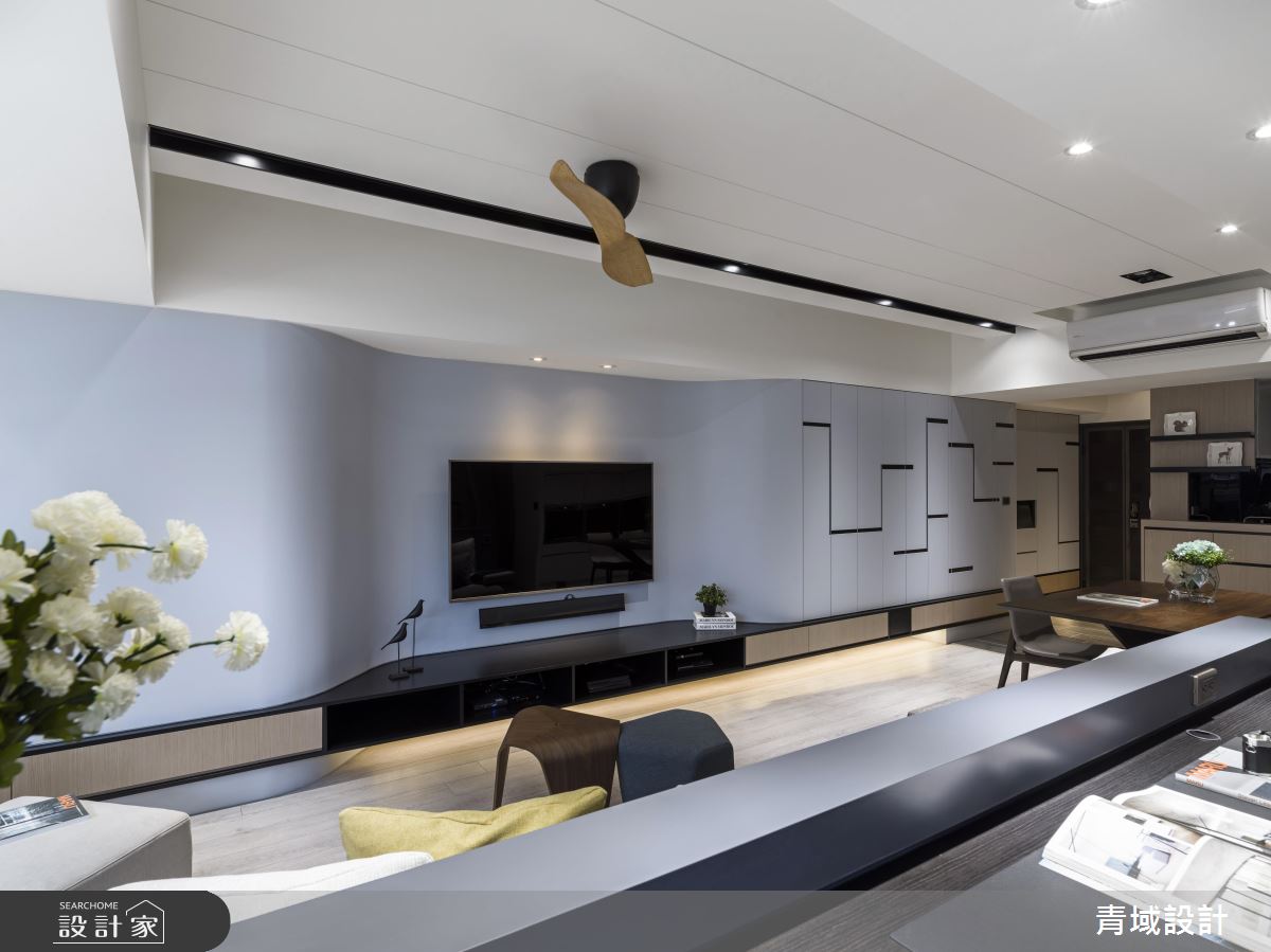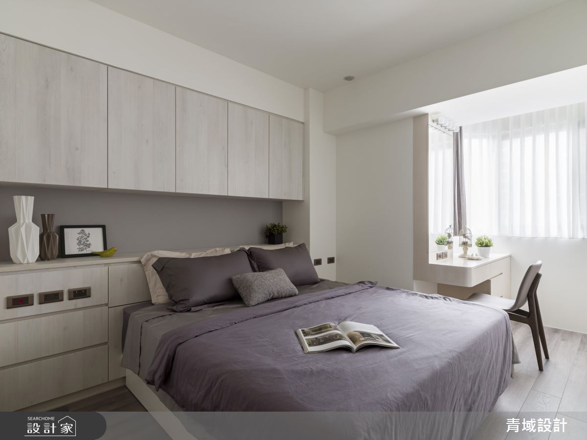 老房子既有的粗大樑柱結構,讓視覺上有很大的壓迫感,設計師運用弧形的牆面造型設計,包覆了冷硬銳利的柱體線條,同時也讓收納櫃從玄關可以一路延伸至客廳,滿足大量鞋子的收納容量。玄關旁則以櫃體隔間劃分領域,另外也更加強了廚房的收納需求。男屋主希望在書房閱讀工作時,也能看到客廳的電視牆,設計師藉由開放式的設計手法,增加開闊明亮感和空間的互動性,後方的書牆也成為了客廳的展示端景,而書桌矮牆同樣採用弧型設計,化解邊緣的銳利稜角,不但看起來更加柔和溫潤,並兼具了使用安全考量。主臥室以簡約明亮為主,以淺色木質和淡紫色營造出清爽柔雅的氛圍,並善用樑下空間進行收納規劃,達到舒適與機能的完美最大值。