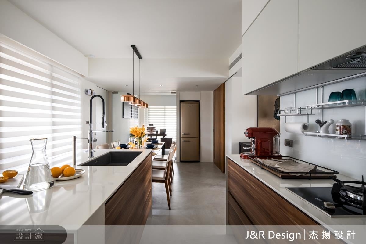 將原有隔間打通,營造開放式的廚房,成為親朋好友做客時的最佳之處,同時敞開空間,中島與餐桌的連結,也讓生活動線更為順暢。