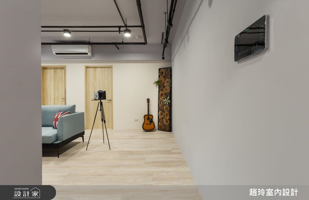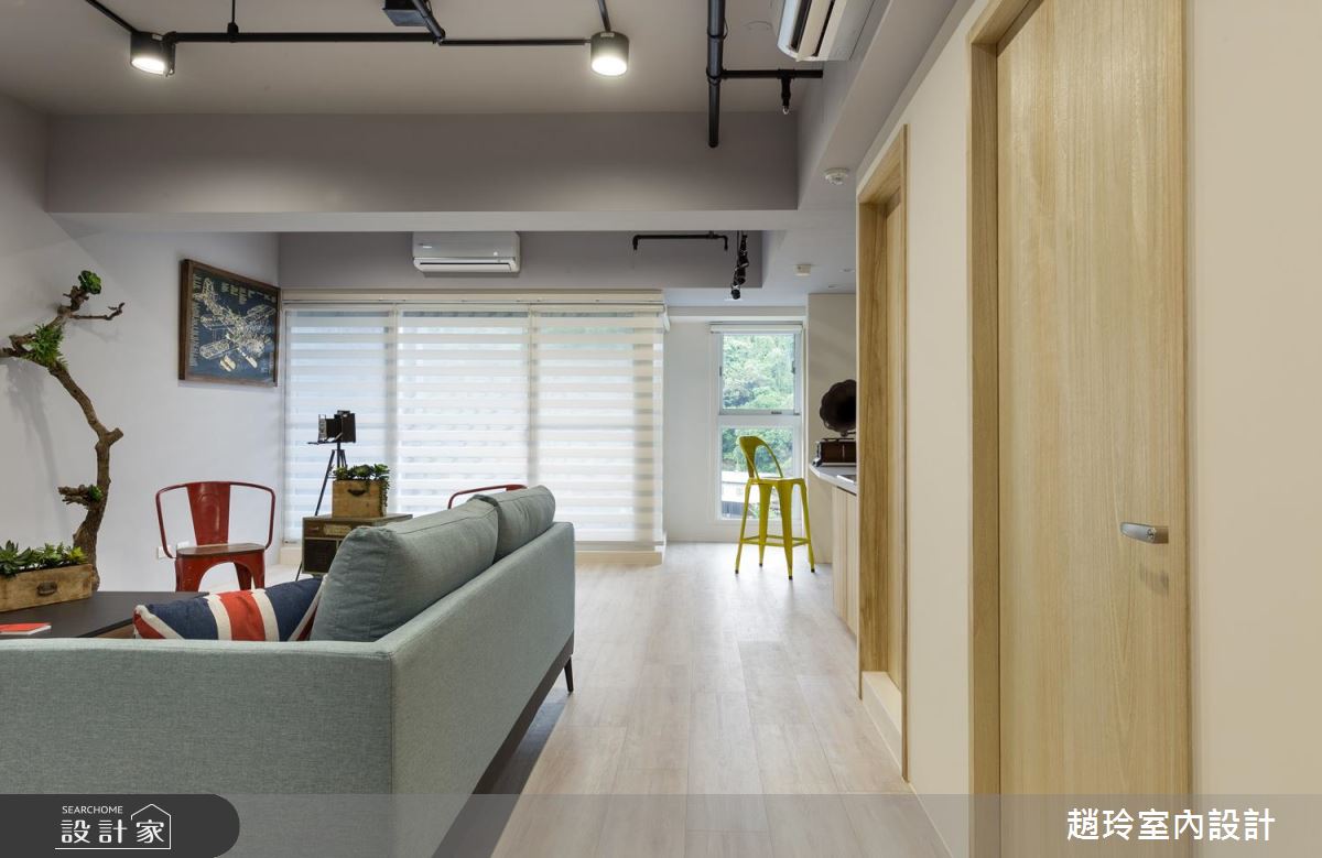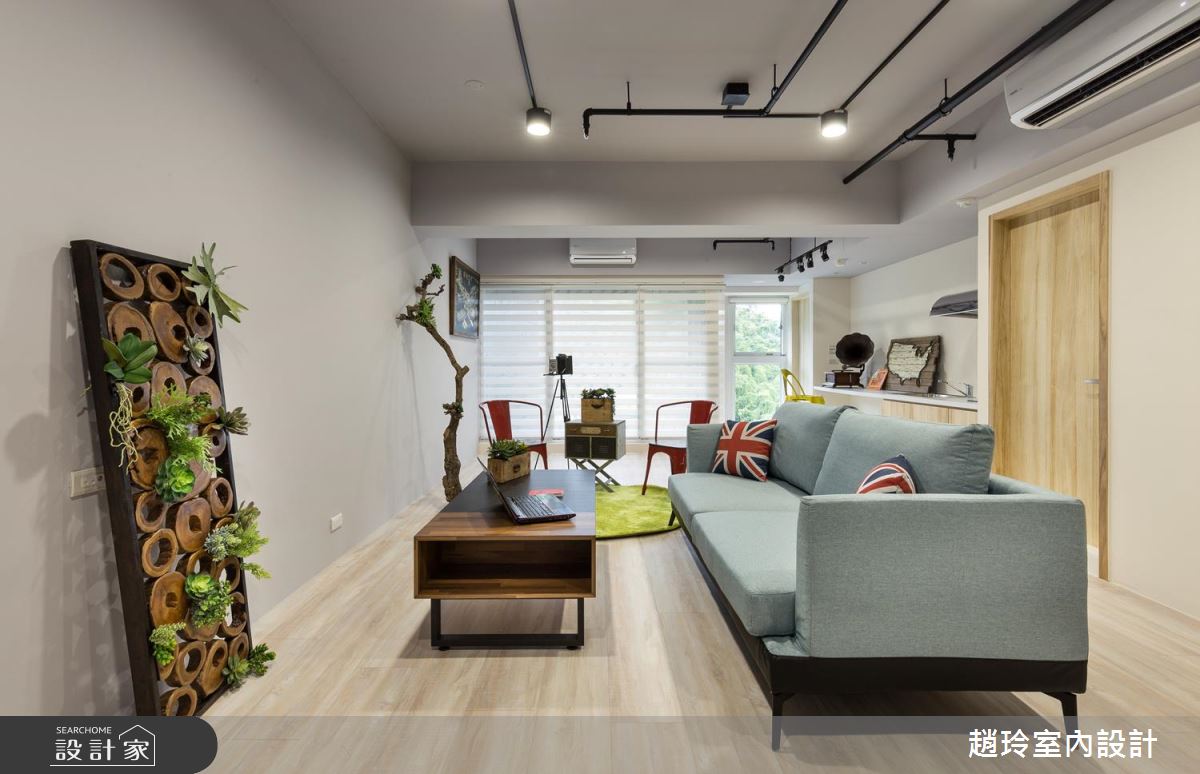 落地窗將戶外的綠意景緻延伸入室,搭配調光簾彈性調節光線與通風程度,讓最適宜的光感調和出絕佳溫度;公領域裡利用留白、無刻意裝修的手法做為呈現,先是整片天花板刷上灰色調,營造出安定、平實的室內感受,再利用管線加上鐵件燈飾,藉此拉出視覺角度與線條,營造出工業風般的粗獷;地面鋪陳大地色系的木紋、房間使用梧桐木門片,替室內挹注暖暖的生活溫度;玄關入室後,客、餐廳相融唯一,沙發後方的大樑下抓出一條水平線,納入衛浴與主臥機能,並於角落規劃廚房與吧檯領域,將機能收整於空間裡,達到協調與整齊的視覺之美。