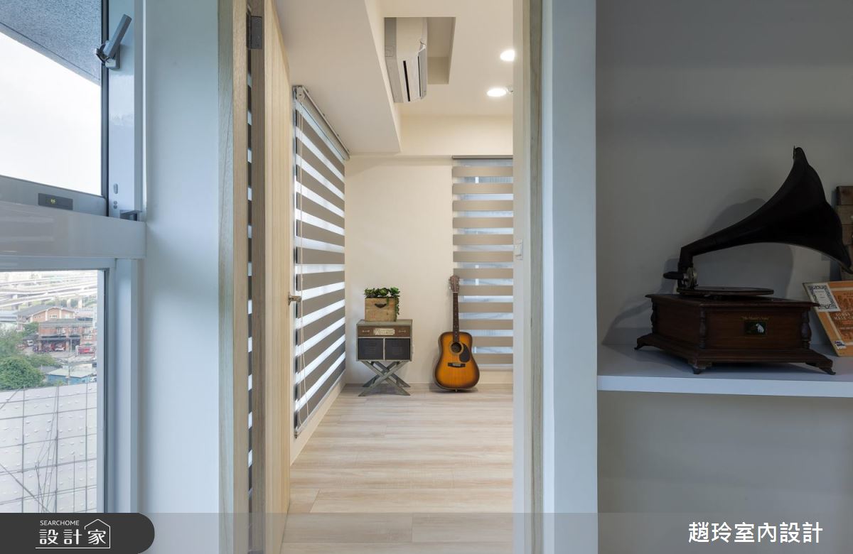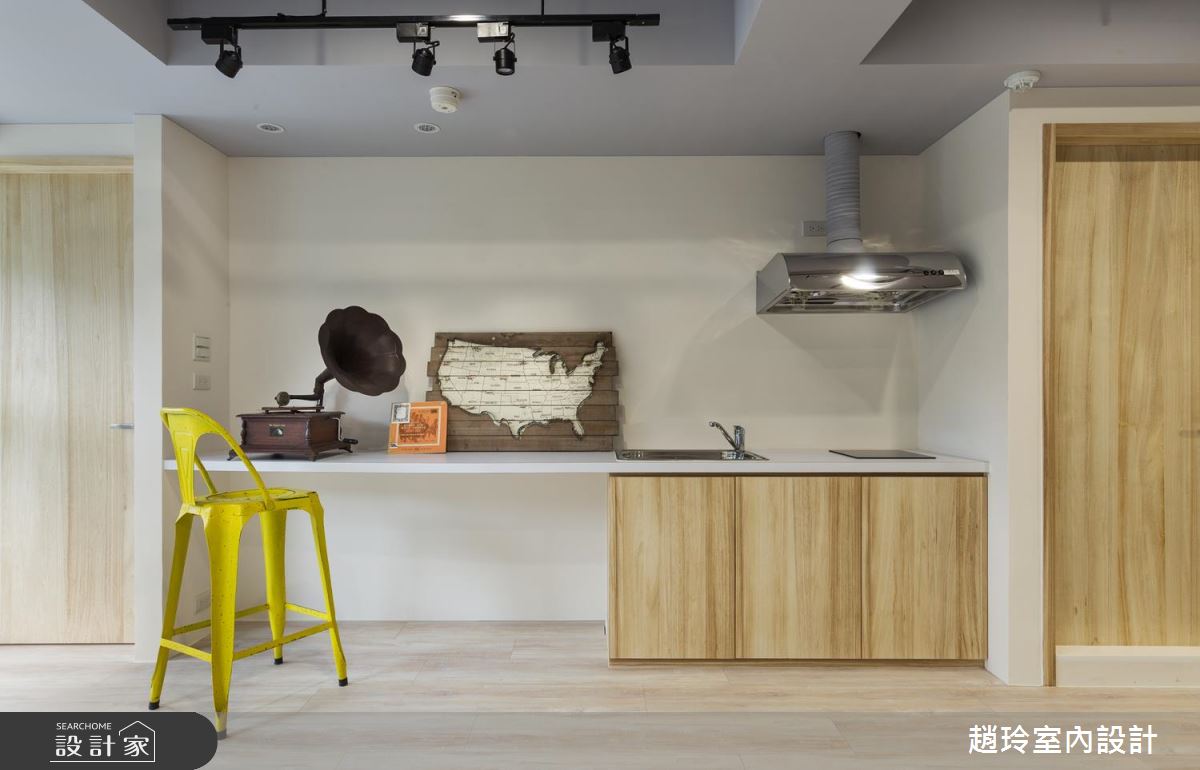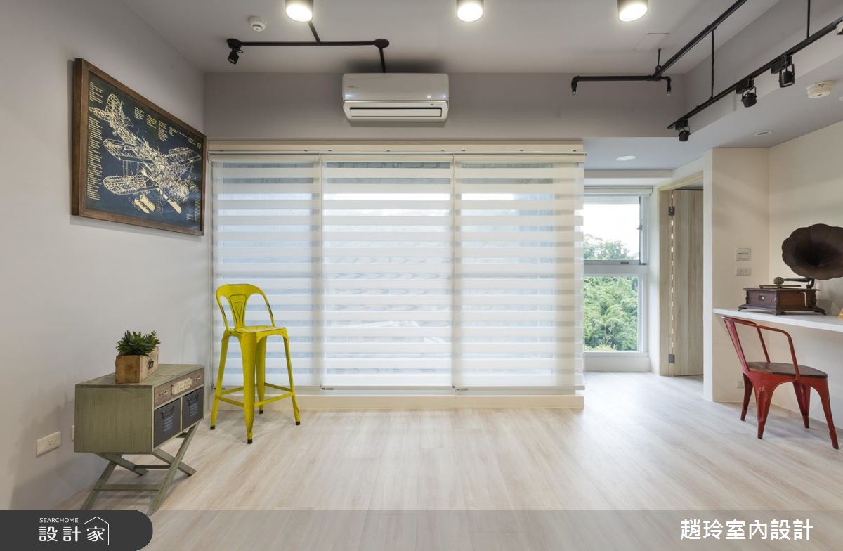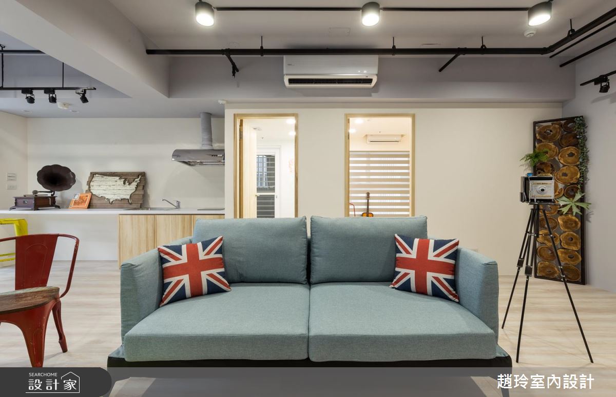 落地窗將戶外的綠意景緻延伸入室,搭配調光簾彈性調節光線與通風程度,讓最適宜的光感調和出絕佳溫度;公領域裡利用留白、無刻意裝修的手法做為呈現,先是整片天花板刷上灰色調,營造出安定、平實的室內感受,再利用管線加上鐵件燈飾,藉此拉出視覺角度與線條,營造出工業風般的粗獷;地面鋪陳大地色系的木紋、房間使用梧桐木門片,替室內挹注暖暖的生活溫度;玄關入室後,客、餐廳相融唯一,沙發後方的大樑下抓出一條水平線,納入衛浴與主臥機能,並於角落規劃廚房與吧檯領域,將機能收整於空間裡,達到協調與整齊的視覺之美。