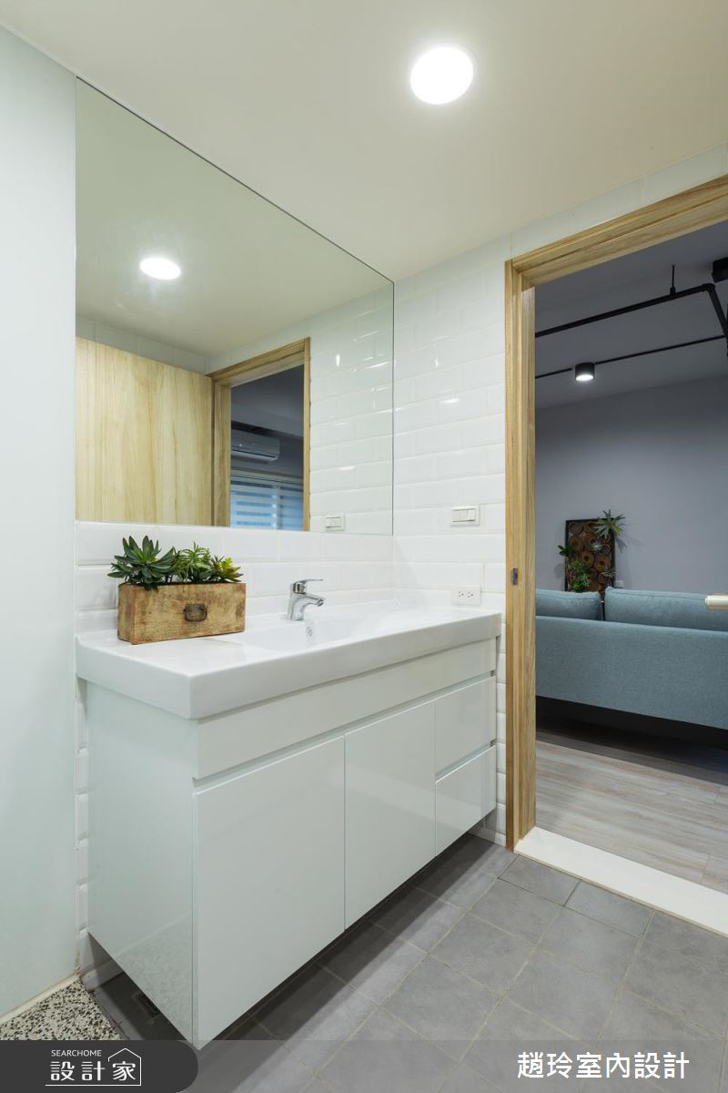 微型的衛浴空間裡,使用砌磚方式拉出廁所的定位點,壁面運用白色磚拼貼,搭配烤漆玻璃為設計,放大空間坪效感,且營造出復古的獨特氛圍。