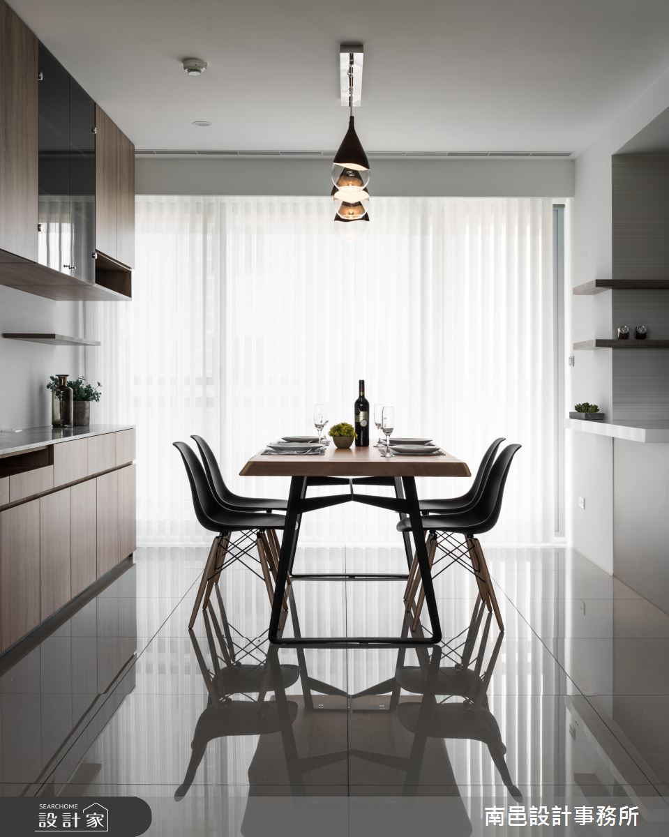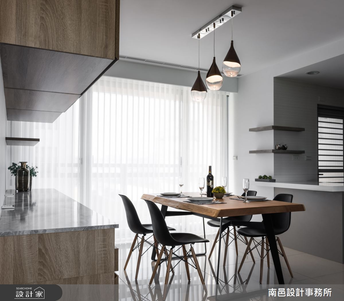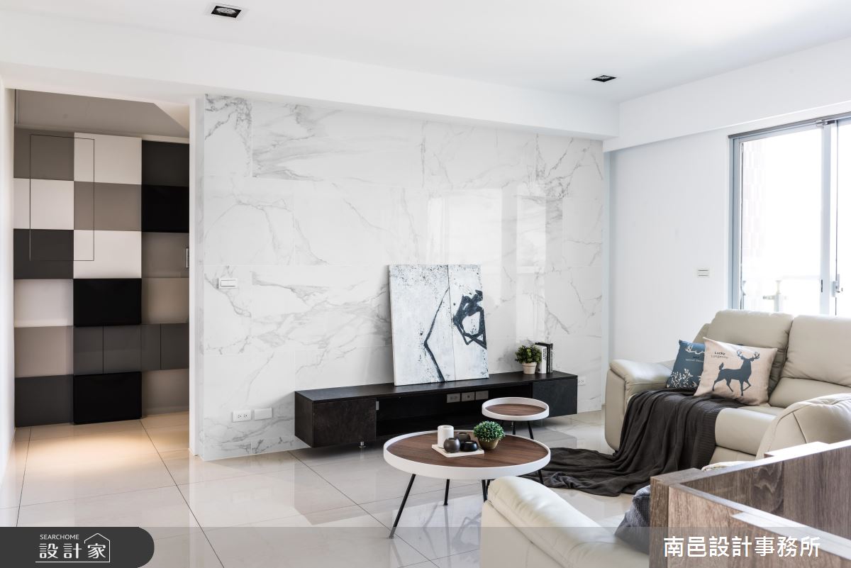 由於預算有限,設計師排除地坪施作,更保留原始天花與格局,將重點放在家具與動線規劃。客廳電視牆以帶有淡雅紋理的石材塑成,搭配純白沙發與跳色抱枕,清爽且富有北歐氣息。後方書房的半身木製矮桌同時身兼沙發背牆,破除風水疑慮又維持視覺穿透性,一旁臥榻更增添了休閒氣息。開放式餐廚與客廳及書房位置對應,同樣以清爽淡雅的純白色調與木元素構成。針對收納機能建置,電視牆後的玄關利用幾何拼貼造型門片後方、書房大面積櫃體及餐廳餐櫃滿足每個區域的收納需求。