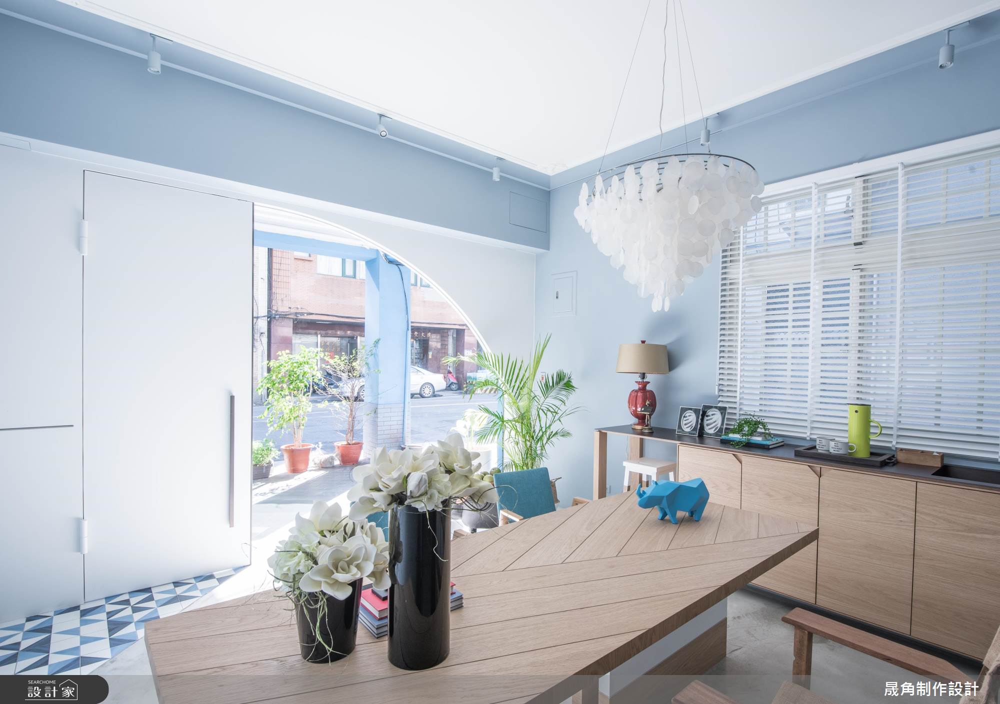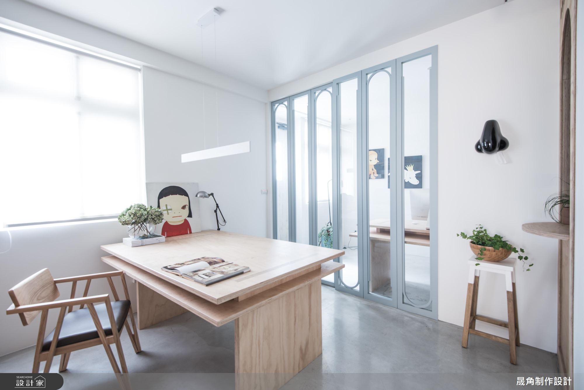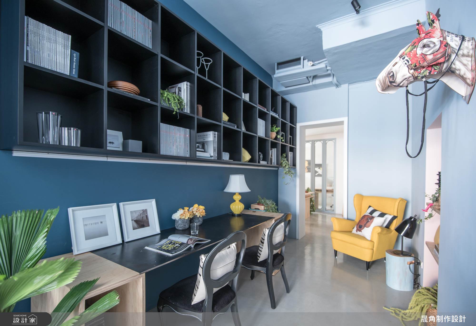 由老屋翻新的設計師辦公室,因為房屋格局偏長型,讓中段區域缺乏光線,因此大門處及後方的空間藉由玻璃材質增強光線的穿透性,並採用清新的淺色實木、溫和而舒適的灰藍色調,營造了休閒放鬆的工作氛圍。入口處的拼接花磚延續至室內,形成了向內延續的動態效果,斜向的切線分割,也讓空間更加俐落而明快。除了工作區外,也另外擺設了一張鮮亮的黃色沙發,成為了室內的活潑亮點,同時也是舒適的閱讀區,提供設計工作者更加放鬆的閱讀情境。
