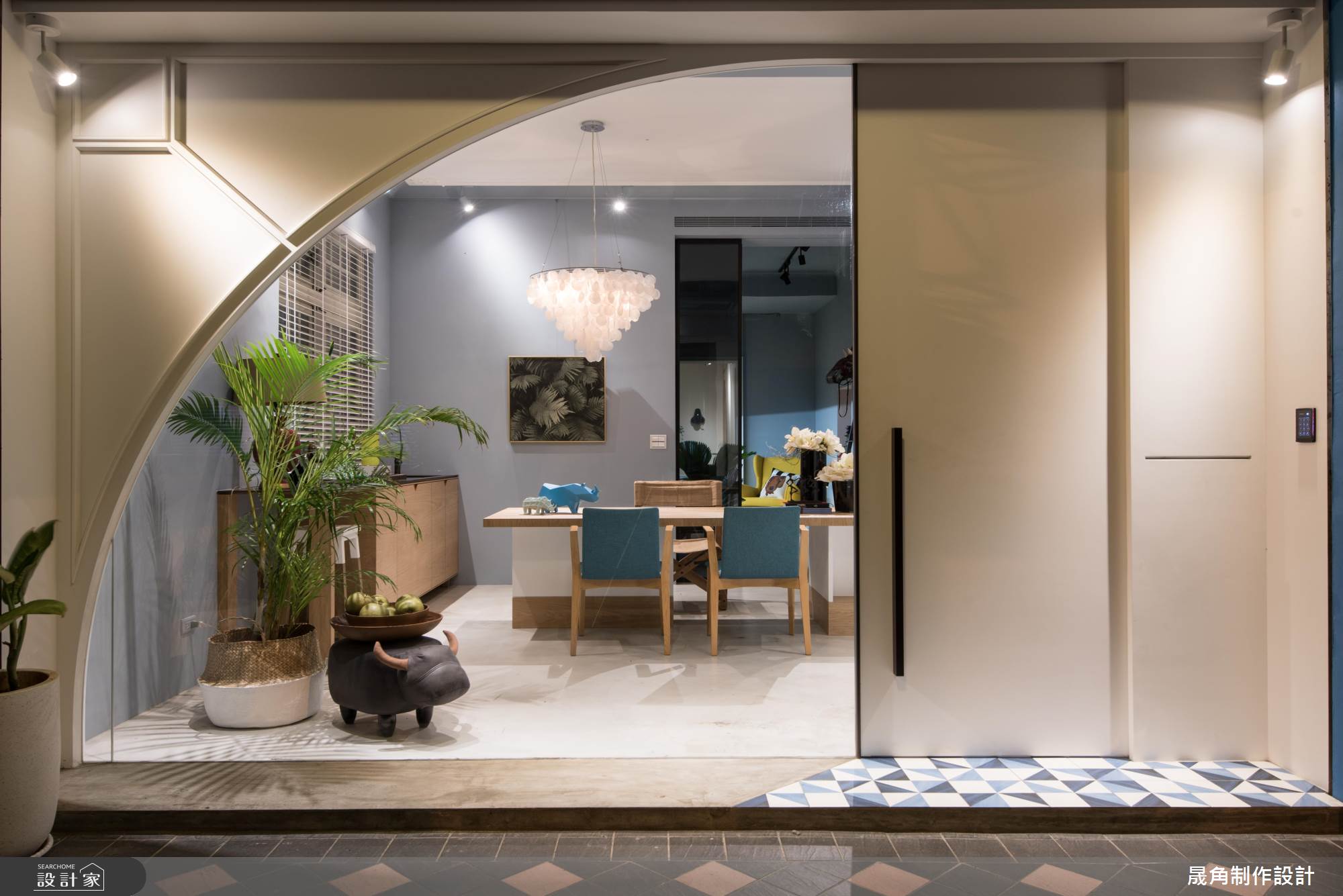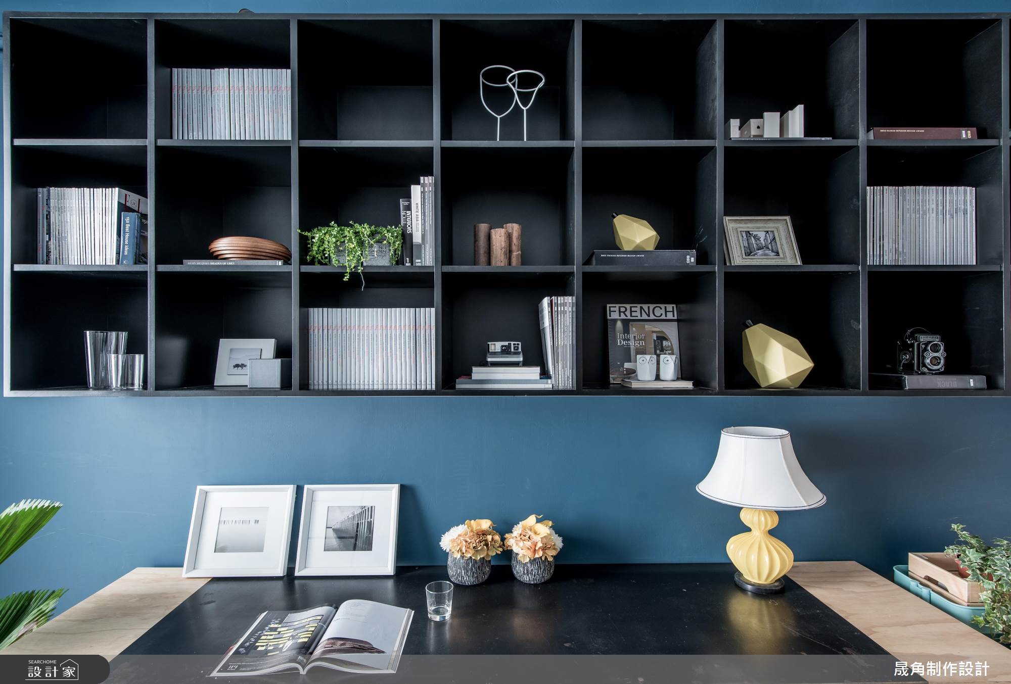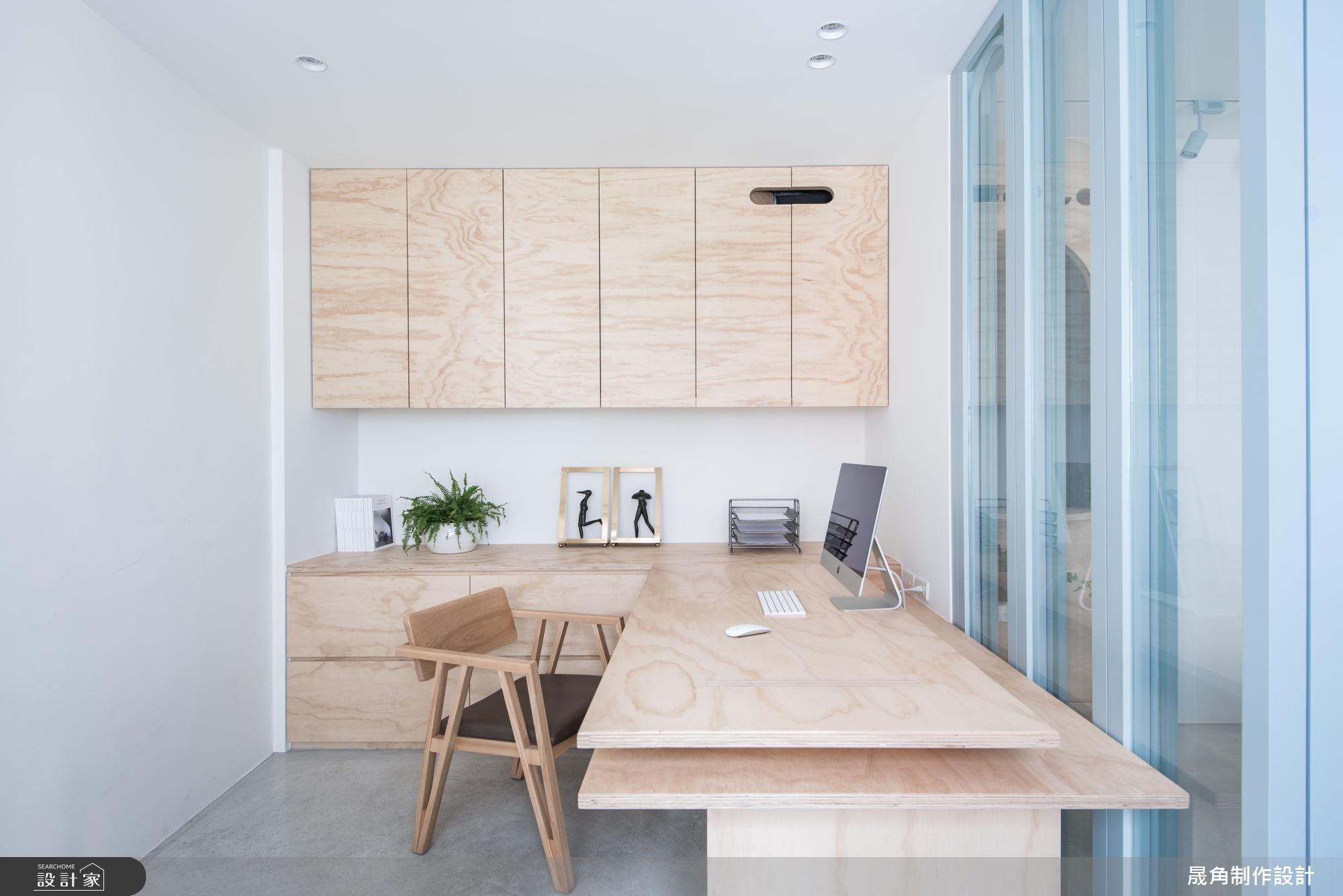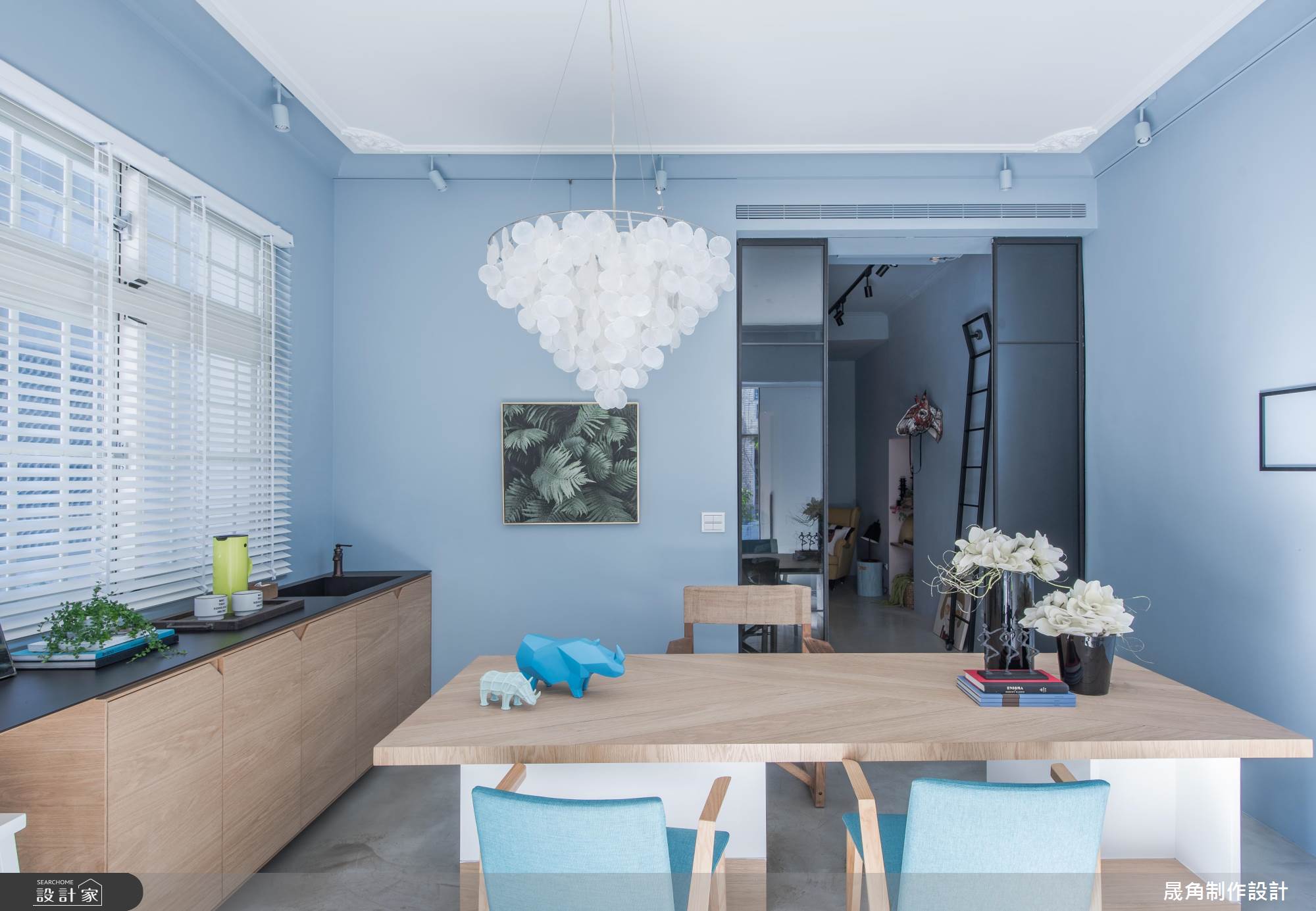 由老屋翻新的設計師辦公室,因為房屋格局偏長型,讓中段區域缺乏光線,因此大門處及後方的空間藉由玻璃材質增強光線的穿透性,並採用清新的淺色實木、溫和而舒適的灰藍色調,營造了休閒放鬆的工作氛圍。入口處的拼接花磚延續至室內,形成了向內延續的動態效果,斜向的切線分割,也讓空間更加俐落而明快。除了工作區外,也另外擺設了一張鮮亮的黃色沙發,成為了室內的活潑亮點,同時也是舒適的閱讀區,提供設計工作者更加放鬆的閱讀情境。