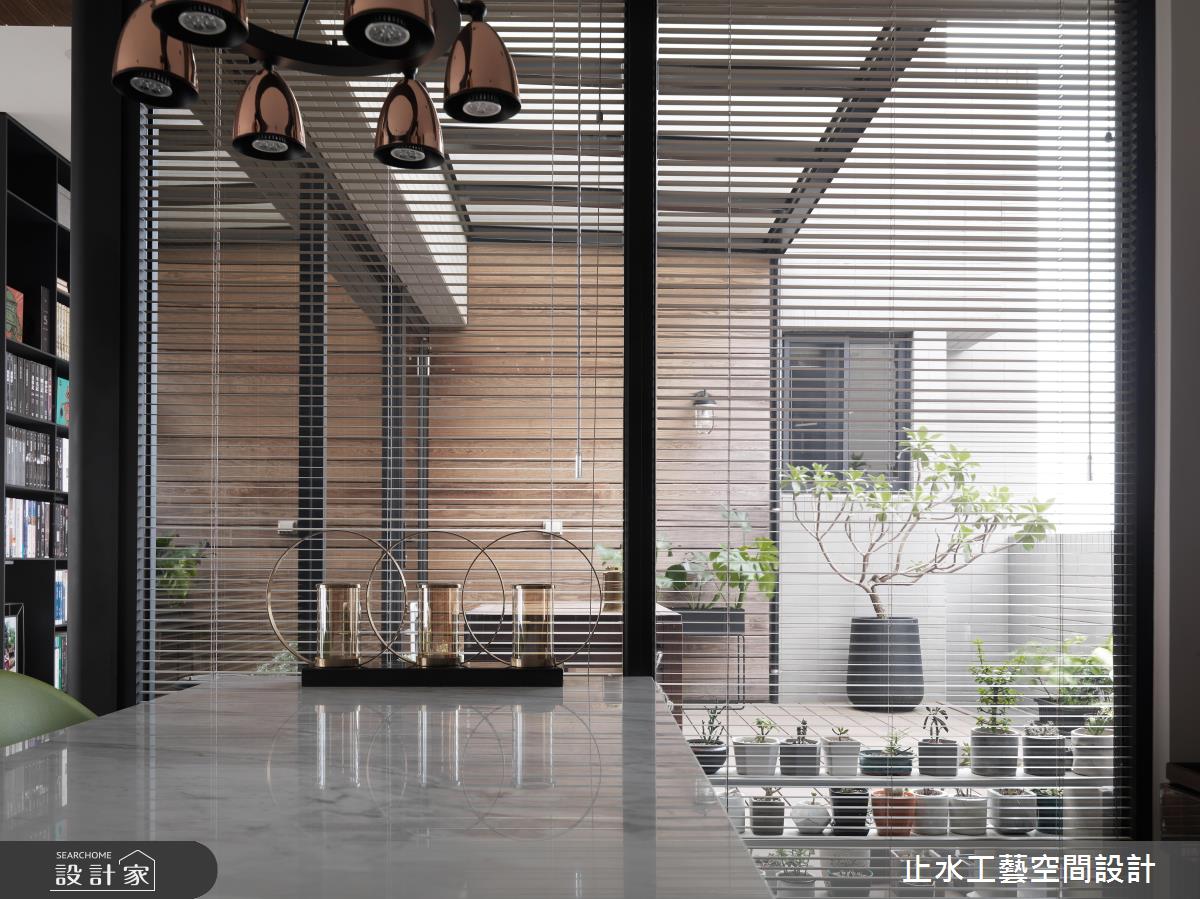 居宅透過大面窗導引明亮採光,並善用玻璃隔間設計,刻意將露臺納入室內,使內外產生連貫性,在巧妙的位置分配下,有如坐擁一處露天的綠意房間,廳區則給予大地色鋪底,妝點木質與鐵件搭構,刻意讓電視立面呈現仿鏽漆風貌,在沉穩中釋放工業人文況味,且透過木作包覆沙發上方大樑,除了修飾視覺壓迫以外,也串起客廳與餐廳範圍;餐廳場域,則運用白色大理石打造中島桌檯,配合溫潤的木作建材、蘋果綠餐椅點綴、細緻吊燈畫龍點睛等,成就微奢的質感,且讓餐桌緊鄰露台,讓使用者在用餐時,也可隨時與綠意採光相伴;臥室亦延續玻璃隔間設計,不只創造放大延展的空間感,也締造公私領域採光交流,搭配百葉窗簾規劃,同步兼具臥房的視覺隱私性!