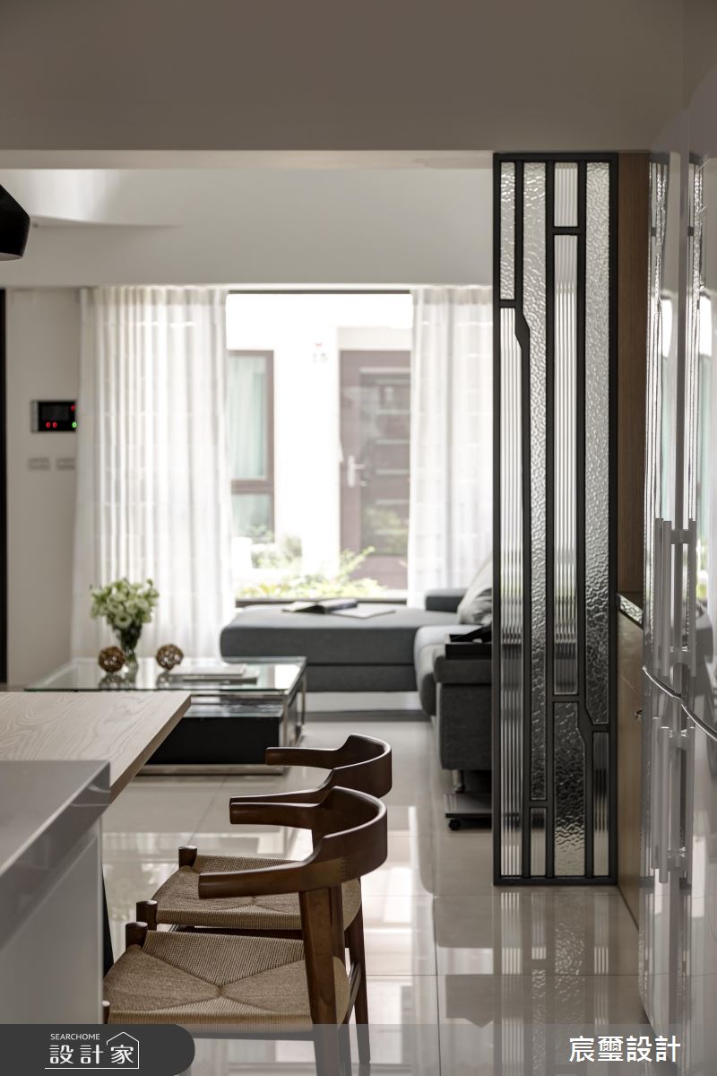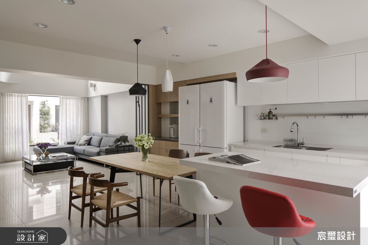 玄關上方的天花板以流線造型包覆冷氣出風口,展現流暢的視覺曲度;客廳裡以挑空手法呈現空間尺度,讓空間裡的一景一物了了分明,沙發與茶几挑選重色系做為搭配,圍塑出核心領域,搭配裝置性的風格燈飾,平衡整體視覺上的比重;一、二樓之間的結構體以弧形導引,展現流暢、連貫的空間調性,下方以鐵件、水紋玻璃打造微型屏風,界定出客、餐廳,同時更能延伸視覺之意;延伸純淨的白色調在餐廚空間裡,串連起冰箱、中島、廚具,並搭佐黑、白、紅的燈飾,營造出活潑、輕快的日常節奏,再藉由木紋肌理的家具與壁面妝點,注入溫潤的生命氣息。