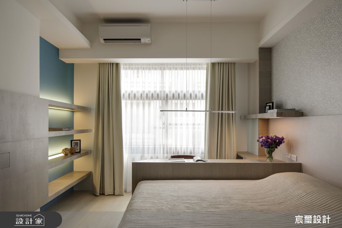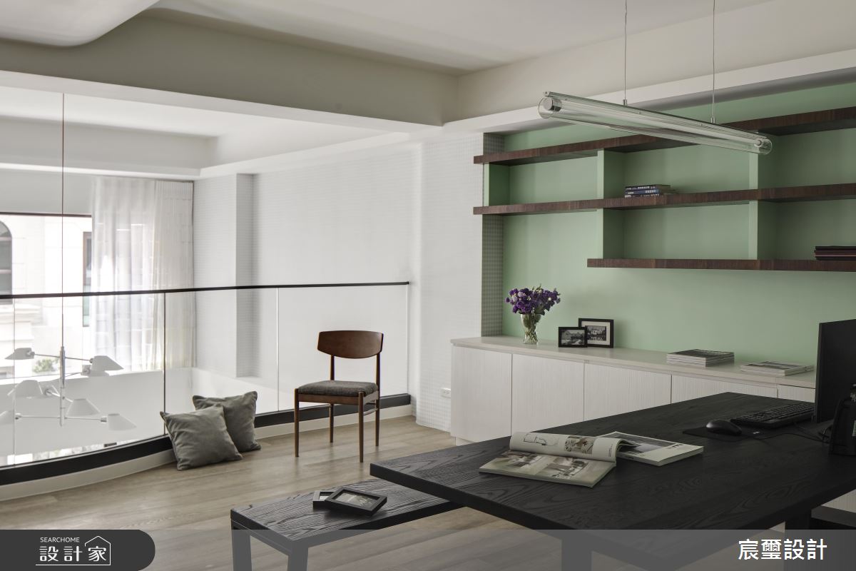 運用挑高的二樓空間做為書房,深色木紋的書桌椅擺設,壁面漆上粉綠色系,搭配木紋層板,呈現愜意優雅的日常生活。