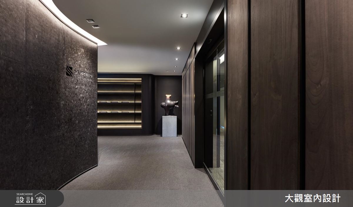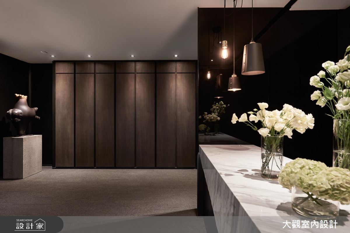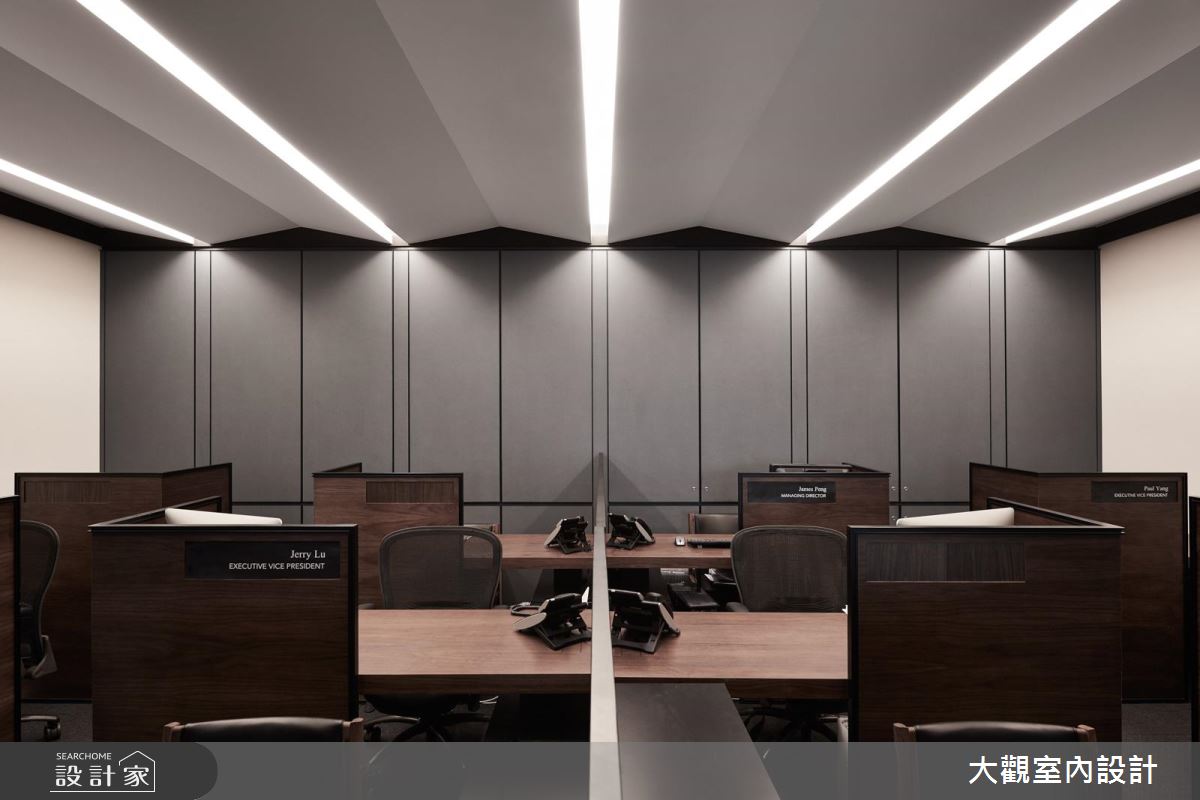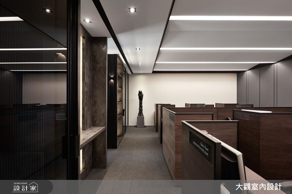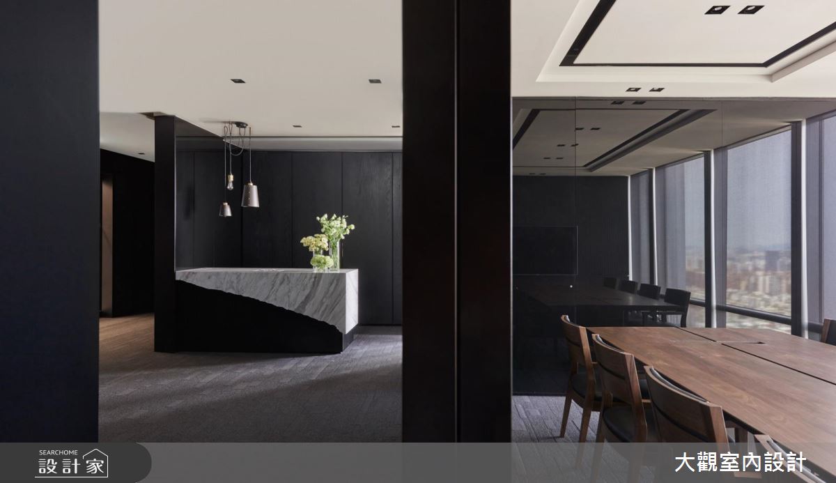 在空間架構上,選用深色系建材型塑沉穩氛圍,以鐵件、木皮、大理石完美搭接之下,碰撞出時髦的視覺觀感,再搭配精心營佈的燈具與光源,使空間絲毫不帶傳統辦公室的沉悶感,反倒充滿品味與氣質;接待吧檯則給予中島造型呈現,於檯面上襯佐巧思裝飾的花藝,帶入宛如居家般的舒適氣氛;會議室內,也破除一般常見的設計,採用大面窗讓光線流動入室,並隨時與戶外景觀連結,締造寬敞通透的空間感,同時巧用黑鏡作為壁面材質,無形中促成場域延伸的錯覺感受;辦公室內,除了配置充裕的個人座位空間之外,亦刻意規劃獨特的造型天花,增添場域的時尚感!