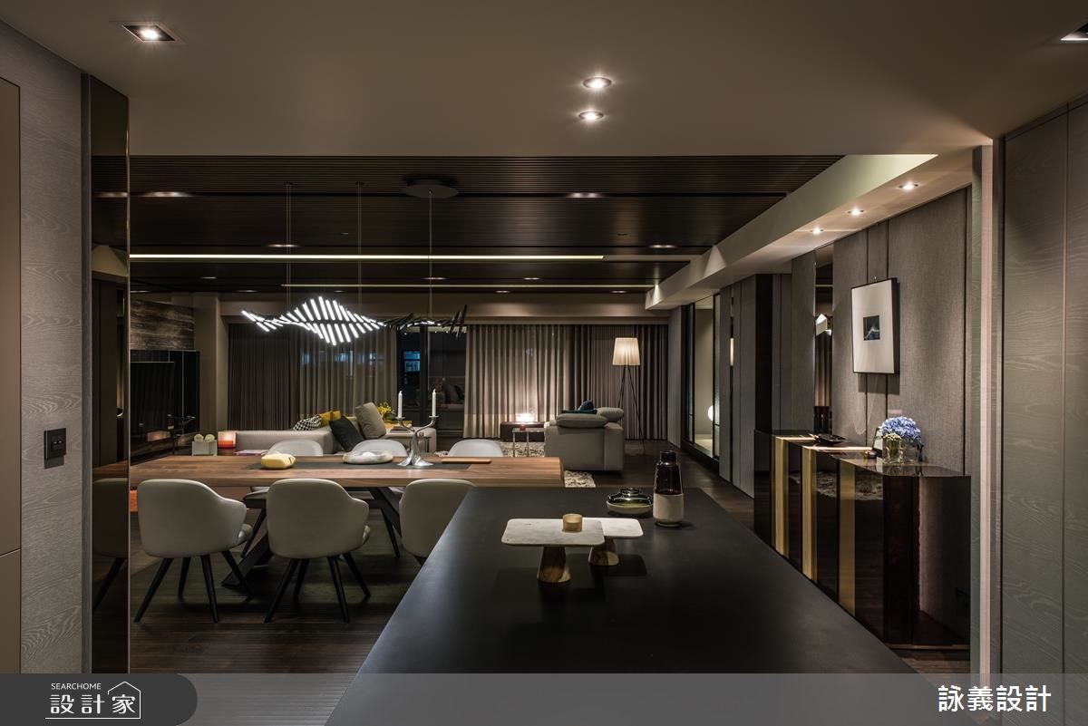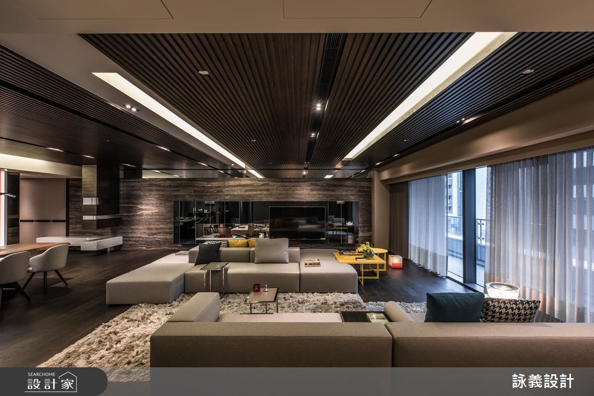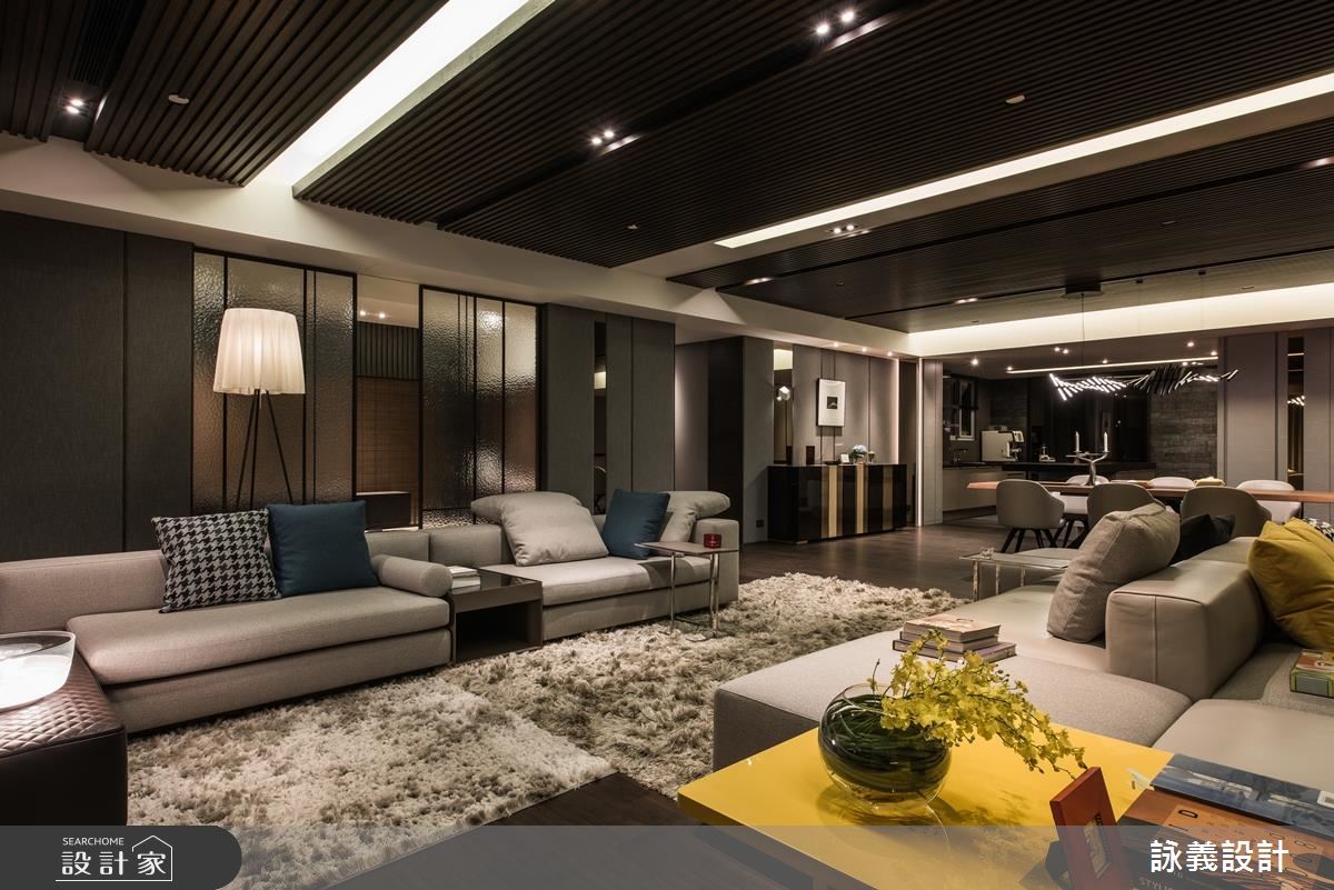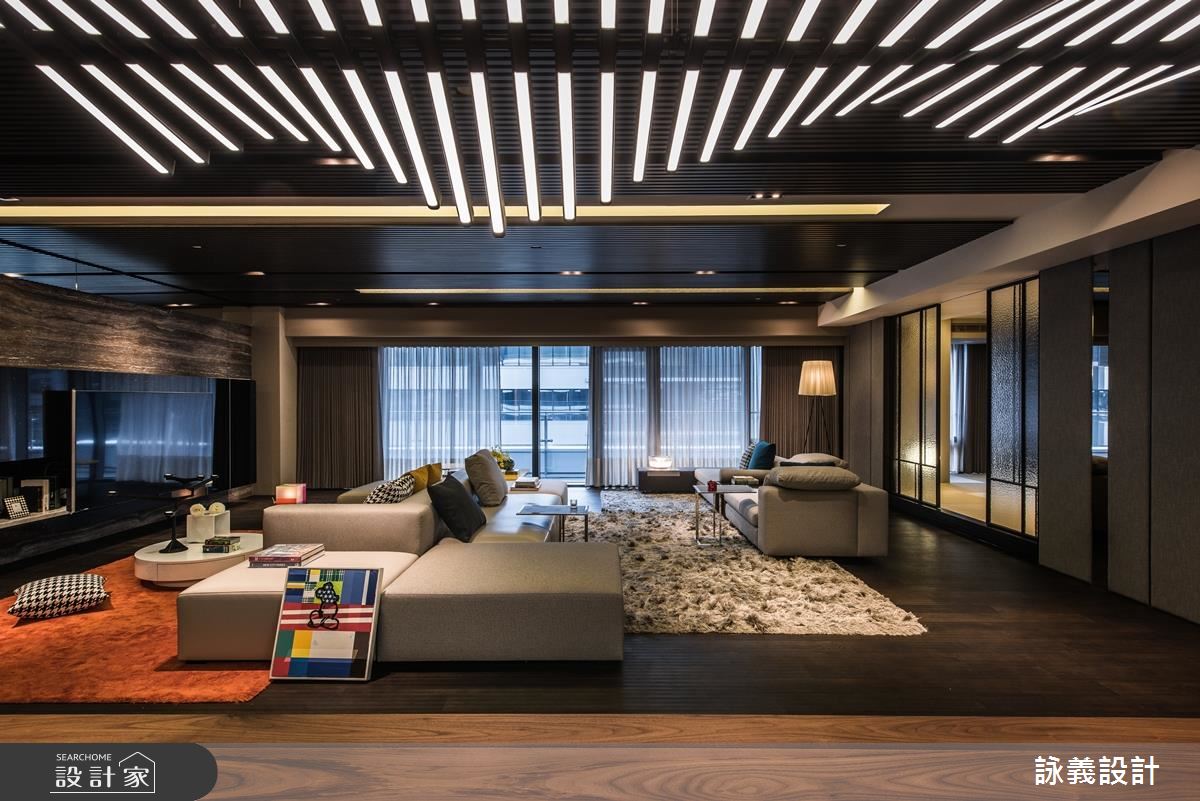 詠義設計為這個近百坪的現代風宅邸規劃時,以「幾何的深度」為主題,注入強烈的「荷蘭風格派」概念,充分在全開放空間體現這個俐落的新造型主義。