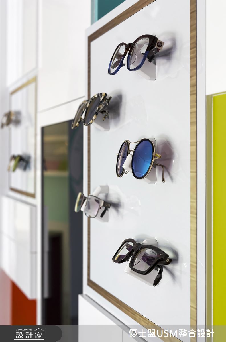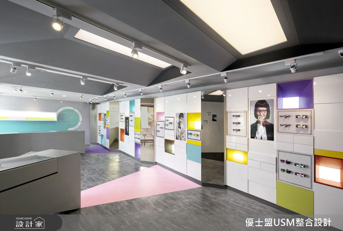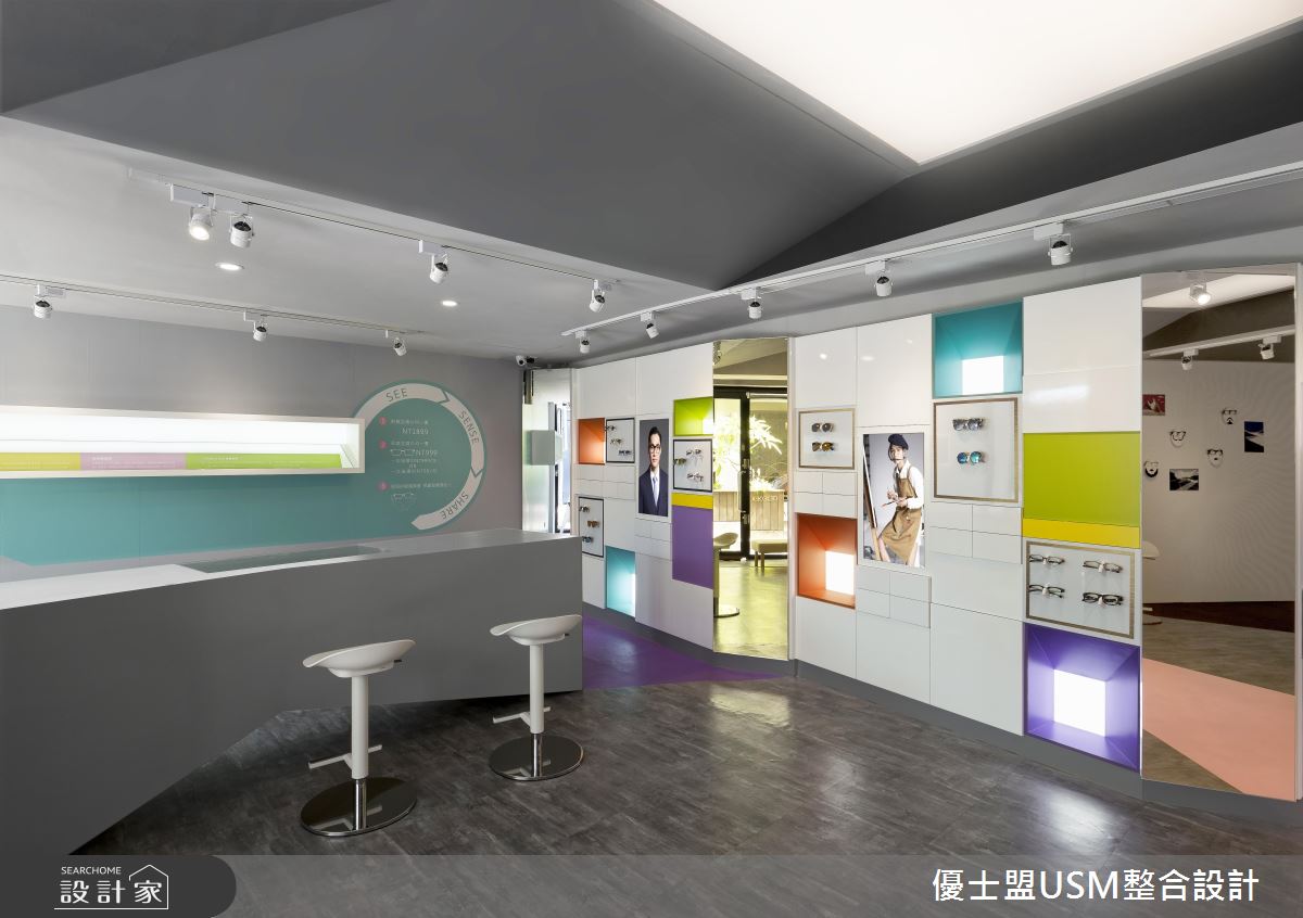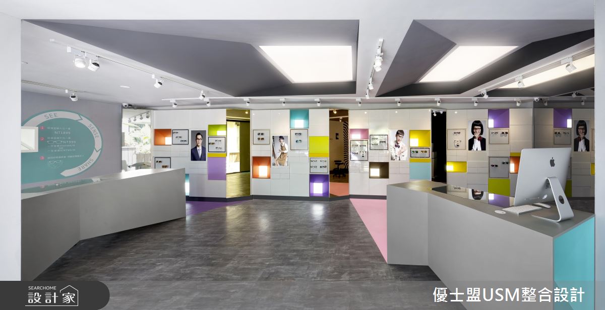 設計團隊透過「品味玩色、探索空間」作為設計初心,讓眼鏡不僅不再呆板,反倒化為趣味的個性配件,空間架構上,將產品使用客戶劃分四大消費族群,並以此概念切割場域,作出主題探索牆面,整體上,則使用方型幾何元素通篇貫穿,在俐落線條、繽紛色彩、鏡面反射的交織之下,讓牆面產生再延伸的空間感,創造虛實交替的趣味效果,天花板亦同樣做出獨特造型,在燈光的烘托中,帶出有如天窗的開闊感受,堆疊出店內的豐富層次;同時也顛覆傳統眼鏡的行銷模式,藉由無所不在的互動體驗,讓民眾可自在地選購,體驗挖寶的趣味!