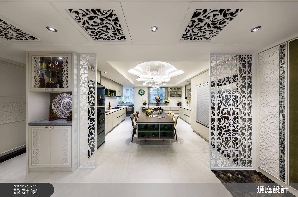整體空間以白色為基底,客廳天花板藉由雲朵的意象作為設計靈感,漸層的線板勾勒出寬闊、自在的生活視野。電視牆以深色調的大理石材為基底,隨著鮮明紋理的流露,營造出壯闊氣度,牆體側邊以鏤空造型,搭配小型雕塑品擺設,蘊含故事性的生動畫面;沙發背牆擺設大自然景緻為主題的畫作,與一旁的花藝、轉角層板上擺放動物造型的藝品相互呼應,調和出充滿愜意、生命力的家屋風貌;室內空間的收納櫃皆以開放層板展現,延續天花板的雲朵意象,圓弧線條描繪出雅緻的新古典空間,且讓屋主的收藏都能一一展示,妝點出非凡的美學風範;經典的鏤空屏風界定出餐廚區,天花板延續公領域的雲朵概念,並搭以高低錯落的剔透燈飾,營造出繁星點點的璀璨焦點。